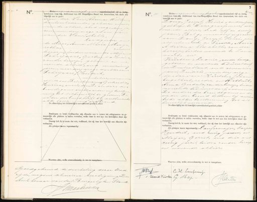 Augustus negentienhonderd vijf en dertig verschenen voor mij, Ambtenaar van den Burgerlijken Stand van Amsterdam, ten einde een huwelijk aan te gaan: van der Ven, Thomas Willem, kantoorbediende, geboren enpoo¬ nende alhier, oud negenten ja- ren minderjarige zoon van: van der Ven, Melle¬ loodgieter en de Maes, Arna Maria Marga„ rethag No zonder beroep, beiden wonende alhier, en Schrijvers, Gertrida Henrica zonder beroep, geboren en wo¬ nende alhier, oud eenentwintig jaren, meerderjarige dochter van: Schrijvers, Hendrik, winkelier, wonende alhier en Brinkmanns Gertruda, Henrica, overleden, De ouders des bruidegoms verklaarden mij toettem- ming tot dit huwelijk te geven. De vader der bruid heeft bij authentieke akte toestemming vertleend De afkondiging tot dit huwelijk is onverhinderd geschied, alhier Bruidegom en bruid verklaarden mij, elkander aan te nemen tot echtgenooten en ge trouwelijk alle plichten te zullen vervullen, welke door de wet aan den huwelijken staat zijn verbonden. Daarop heb ik, in naam der wet, verklaard, dat zij door het huwelijk aan elkander zijn verbonden. Als getuigen waren tegenwoordig: 1 ikte, welke overeenkomstig de wet is voorge No. 10 2n Hedennegenentwintig Augulus negentienhonderd vijf en dertig, verschenen voor mij, Ambtenaar van den Burgerlijken Stand van Amsterdam, ten einde een huwelijk aan te gaan: Dong, Jooeph Henri, onderwijzer geboren te Watergraafsmeer, wo¬ nende alhier, oud vijf en dertig jaren, Belg, meerderjarige zoon van: Douy, Joseph Henri, pen„ zianhouder en Teune, Maria Adriana Elisabeth, zonder beroep, beiden wonende te Land voort, en