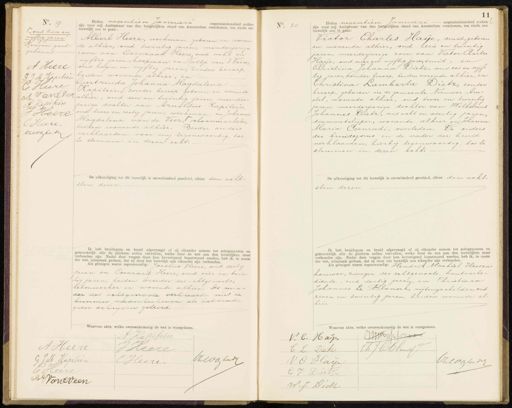 No. 19 „oud twee en vijftig jaren Renvooi goed gekeurd. A Heere J J M Kapiteir 10 MMeere A Vanldie A Kapifein Heere C Heere. bawoogtaden Heden negentien Januari negentienhonderd zestien zijn voor mij Ambtenaar van den burgerlijken stand van Amsterdam verschenen, ten einde een huwelijk aan te gaan. Albert Heere, werkman, geboren en wonen de alhier, oud twintig jaren, minderjarige zoon van Coenraad Heere, oud acht en vijftig jaren koopman en Neeltje van ’t een oud negen en vijftig jaren, zonder beroep, beiden wonende alhier, en Geertruida Johanna Magdalena Kapitein, zonder beroep, geboren en wonende alhier, oud een en twintig jaren, meerder- jarige dochter van Arnoldus Kapitein, oud twee en zestig jaren, werkman, en Johanna Magdalena van de Veer Schoonmaakster, beiden wonende alhier. Beider ouders verklaarden, voor mij tegenwoordig, toe te stemmen in dezen echt. De afkondiging tot dit huwelijk is onverhinderd geschied, alhier den acht- sten dezer. Ik heb bruidegom en bruid afgevraagd of zij elkander nemen tot echtgenooten en getrouwelijk alle de plichten zullen vervullen, welke door de wet aan den huwelijken staat verbonden zijn. Nadat deze vragen door hen bevestigend beantwoord werden, heb ik, in naam der wet, uitspraak gedaan, dat zij door het huwelijk aan elkander zijn verbonden. Als getuigen waren tegenwoordig: Jacobus Heere, oud dertig jaren en Coenraad Heere, oud vier en twin tig jaren, beiden broeder des echtgenoots; betonwerker en wonende alhier. De moe- der der echtgenoote verklaarde met te kunnen naamteekenen als hebbende geen schriven geleerd. Waarvan akte, welke overeenkomstig de wet is voorgelezen. No. 20 11 Heden negentien Januari negentienhonderd zestien t zijn voor mij Ambtenaar van den burgerlijken stand van Amsterdam verschenen, ten einde een huwelijk aan te gaan Victor Charles Haije, sid, geboren en wonende alhier, oud drie en twintig jaren, meerderjarige zoon van Victor Charles Haye, oud vier en vijftig jaren smid, en Christina Johanna Dietz, oud zes en vijf tig jaren, zonder beroep, beiden wonende alhier, en Christina Lamberta Dietz, zonder beroep, geboren in de gemeente Nieuwer-Am- stel, wonende alhier, oud twee en twintig jaren, meerderjarige dochter van Wilhelmus Johannes Dietz, oud acht en veertig jaren, diamantslijper, wonende alhier en Johanna Maria Coenradi, overleden. De ouders des bruidegoms en de vader der bruid verklaarden, hierbij tegenwoordig, toe te stemmen in dezen echt. De afkondiging tot dit huwelijk is onverhinderd geschied, alhier den acht- sten dezer. Ik heb bruidegom en bruid afgevraagd of zij elkander nemen tot echtgenooten en getrouwelijk alle de plichten zullen vervullen, welke door de wet aan den huwelijken staan verbonden zijn. Nadat deze vragen door hen bevestigend beantwoord werden, heb ik, in naam der wet, uitspraak gedaan, dat zij door het huwelijk aan elkander zijn verbonden. als getuigen waren tegenwoordig: Hendrik Machiel Hessen houwer, zwager des echtgenoots, kantoorbe- diende, oud dertig jaren, en Christiaan Johannes Le Blansch, rijtuigschilder, oud zeven en twintig jaren, beiden wonende al hier. A Kapifeen A Heere. J Heere DZWasterdy G JM Kapilun CHeeren B 6 Heere R Waneveen JHnaphoumer V. C. Haije Ch. J. le Blaant J C L. Dietz EZwylerdig VC Hager 07 11 Duitz W.J. Dietz.