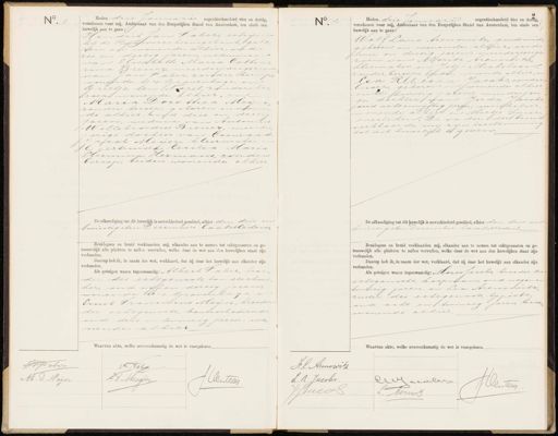No. 1 Heden drie Januai negentienhonderd vier en dertig, verschenen voor mij, Ambtenaar van den Burgerlijken Stand van Amsterdam, ten einde een huwelijk aan te gaan: Hendrik Jan Faber, schrijver bij de Rijksverzekeringsbank, gebo¬ ren en wonende alhier, oud zes en dertig jaren, weduwnaar van Elisabeth Maria Catha„ rina Greuer, meerderjarige zoon van Jan Taber, zonder beroep, wonende te 's Gravenhage Grietje ten Napel, zonder be¬ roep, wonende alhier, Maria Dorothea Meijer, zonder beroep, geboren en wonen„ de alhier, oud drie en dertig jaren, weduwe van Antonius Willebrordus Breuer, meerder jarige dochier van Coenraad Jacob Meijer, kleermaker en Geertruida Cecilia Maria Hermina Hermans, zonder beroep, beiden wonende alhier De afkondiging tot dit huwelijk is onverhinderd geschied, alhier den drie en twintigsten December laatstleden. Bruidegom en bruid verklaarden mij, elkander aan te nemen tot echtgenooten en ge- trouwelijk alle plichten te zullen vervullen, welke door de wet aan den huwelijken staat zijn verbonden. Daarop heb ik, in naam der wet, verklaard, dat zij door het huwelijk aan elkander zijn verbonden. Als getuigen waren tegenwoordig: Albert Vaber, broe¬ der des echtgenoots, landtechni ker, oud vijf en dertig jaren, wonende te s- Gravenhage en Ernst Francisius Meyjer, broeder der echtgenoote, kantoorbediende oud drie en twinttig jaren, nio- nende alhier. No. Heden drie Januari negentienhonderd vier en dertig, verschenen voor mij, Ambtenaar van den Burgerlijken Stand van Amsterdam, ten einde een. huwelijk aan te gaan. Wolf Laie trenvwitz, goudemnid geboren in wonende alhier, oud twee en dertig jaren, meerderjarige zoon van Moritz Arenonitz, kleermaker en Jetje Michelson zonder beroep, beiden wonende alhier, en Lea Rebecca Jacobs, zonder beroep, geboren en wonende alhier oud wiintig jaren, minderjarig ge dochter van Juda Jacobs oud achtenvijftig jaren, winkelier wonende alhier en Mietje Spier, overleden. De vader der bruid verklaarde mij zijn toestemming tot dit huwelijk te geven; De afkondiging tot dit huwelijk is onverhinderd geschied, alhier den drie en twintigsten December laatstleden. Bruidegom en bruid verklaarden mij, elkander aan te nemen tot echtgenooten en ge trouwelijk alle plichten te zullen vervullen, welke door de wet aan den huwelijken staat zijn verbonden. Daarop heb ik, in naam der wet, verklaard, dat zij door het huwelijk aan elkander zijn verbonden. Als getuigen waren tegenwoordig: Mores Jacobs, broeder der echtgenoote, koopman, oud negen en twintig jaren, en Lea Arenswitz zuster des echtgenoots, typoste¬ oud acht en twintig jaren, beide wonende alhier. Waarvan akte, welke overeenkomstig de wet is voorgelezen. HKaber A Baks L8 Meijer M: D Meijer J Oentee F.L. Arenvwitz L.R Jacobs CG ee J: Oenteeg J Jucob L Nennns