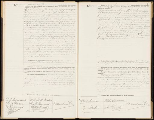 „ No. Heden vier Januari negentienhonderd vier en dertig, verschenen voor mij Ambtenaar van den Burgerlijken Stand van Amsterdam, ten einde een huwelijk aan te gaan: Gerardus Joannes Zegwaard carosserie bouwer, gebaren te Hilversum, wonende alhier, oud vijf en twintig jaren, meerderjari„ ge zoon van Cornelis Legwaard, oud vier envijftig jaren, sid en Theodora Maria Roof, zonder beroep, beiden wonende alhier, en Maria Johanna Elizabeth Oliedam, zonder beroep, geboren te Rotterdam, wonende alhier, oud vier en twintig ja„ ren, meerderjarige dochter van Pieter Hendrik Oliedam oud drie enveertig jaren, chanffeur „ Hendrika Antonia Marga, retha Maria Becker, oud drieenveertig jaren, zonder beroep, beiden wonende alhier De vader des bruidegoms en de ouders der bruid verklaarden mij hun toe- stemming tot dit huwelijk te geven. Uit een geneeskundige verkla„ ring blijkt, dat de moeder des bruide goms niet in staat is haar wil Een opzichte van dit hune, lijk te verklaren. De afkondiging tot dit huwelijk is onverhinderd geschied, alhierden drie en twintigsten December laatstleden. Bruidegom en bruid verklaarden mij, elkander aan te nemen tot echtgenooten en ge- trouwelijk alle plichten te zullen vervullen, welke door de wet aan den huwelijken staat zijn verbonden. Daarop heb ik, in naam der wet, verklaard, dat zij door het huwelijk aan elkander zijn verbonden. Als getuigen waren tegenwoordig: Theresia Maria Leg¬ waard, zuster des echtgenoots, zonder beroep, oud zevenentwintig jaren en Johannes Cornelis van der Kamp, zonder beroep, oud vijftig Jaren, beiden wonende alhier Waarvan akte, welke overeenkor No. 13 Heden vier Januari negentienhonderd vier en dertig verschenen voor mij, Ambtenaar van den Burgerlijken Stand van Amsterdam, ten einde een huwelijk aan te gaane Gerardus Arie Wilhelmus van someren, geldincasseerder geboren en wonende alhier oud drie en dertig jaren, meer derjarige zoon van Wilhelmus Andries an someren, bevei„ liger van gebouwen tegen brand, wonende alhier en Maria van Wingerden, overleden, en Gysbertje Sterk, zonder beroep geboren en wonende alhier. oud vier en dertig jaren, meer„ djarige dochter van Jan Stterk, overleden en Christi„ n Johanna Bergh, zonder beroep, wonende alhier. De afkondiging tot dit huwelijk is onverhinderd geschied, alhier den drie en twintigsten December laatstleden Bruidegom en bruid verklaarden mij, elkander aan te nemen tot echtgenooten en ge- trouwelijk alle plichten te zullen vervullen, welke door de wet aan den huwelijken staat zijn verbonden. Daarop heb ik, in naam der wet, verklaard, dat zij door het huwelijk aan elkander zijn verbonden. Als getuigen waren tegenwoordig Wilhelmus Andries van Someren, vader des echtge„ noots, beveilig er van gebouwen te gen brand, oud zes en vijftig ja- ren en Arend Sts, zwager des echtgenoots, kellner, oud twee en deriig jaren, beiden wonende alhier. Waarvan akte, welke overeenkomstig de wet is voorgelezen. GJ Zegwaard H A M M Berken M Je Vliedam Th. M. Zegwaard Van Soest. C Zegwaard JCaokan Weok W.A. & Someve JAW: Someren Van Soest. 1 ASmitz G. Sterk