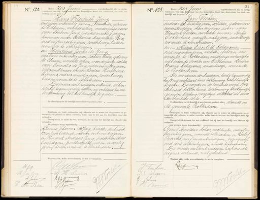 No. 122. Heden Zes Juni negentienhonderd vier en dertig, verschenen voor mij, Ambtenaar van den Burgerlijken Stand van Amsterdam, ten einde een huwelijk aan te gaan: Hans Friedrich Jung oudzeven entwintig jaren, Ikruidenier, geboren te Hillegom, wonende alhier, meerderjarige zoon van Antoon Juny, oud acht enzestig jaren, tuinman en van Catharina Magdalena Risc, oud vijf enzestig jaren, zonder beroep, beiden wonende te Amsterdam, en: Hendrina Janke de Jong, oud twee entwintig jaren, zonder beroep, geboren te Chaam, wonende alhier, meerderjarige dochter van Cornelis de Jong, oudeenen vijftig jaren, rijksambtenaar en van Louisa Hendrina Simons, oudzes enveertig jaren, zonder beroep, beiden wonende te Amsterdam. De ouders nenbruidegem enbuuid, allen hierbij tegenwoordig, hebben mij verklaard hunne toestemming tot uithuwelijk begeven.De afkondiging tot dit huwelijk is onverhinderd geschied, alhier . Bruidegom en bruid verklaarden mij, elkander aan te nemen tot echtgenooten en ge trouwelijk alle plichten te zullen vervullen, welke door de wet aan den huwelijken staat zijn verbonden. Daarop heb ik, in naam der wet, verklaard, dat zij door het huwelijk aan elkander zijn verbonden. Als getuigen waren tegenwoordig: Lieuwe Johannes de Jong, broeder derbruid, Kantoorbediende, oudvier entwintig jaren en Hendrik Andreus Jung, broedervan den bruidegom, postbeambte, oudeen endertig jaren, beiden wonende te Amsterdam. Waarvan akte, welke overeenkomstig de wet is voorgelezen. No. 123. 2 Heden Zes Juni negentienhonderd vier en dertig verschenen voor mij, Ambtenaar van den Burgerlijken Stand van Amsterdam, ten einde een huwelijk aan te gaan: Jan Teeken oudvier en twintig jaren, schilder, geborenen wonende alhier, meerderjarige zoon van Hendrik Teeken, overleden en van Antje Oosterhuis, oudvijf enzestig jaren, zonder beroep, wonende te Amsterdam. m: — Maria Elisabeth Scheepsma; oud negentien jaren, werkster, geboren en wonende te Rotterdam, minderjarige natuurlijks niet erkende dochter van Catharma Louiza Maria Scheepsma, zonder beroep, wonende te Rotterdam. De moedervan denbruidegem, hierbij tegenwoordig heeft mij verklaard hare toestemming tot dit huwelijk begeven. De voogdes en de toeziende voogd over debruid hebben hunne toestemming tot dit huwelijk gegeven blijkens overgelegd uittreksel uit eene Authentieke akte De afkondiging tot dit huwelijk is onverhinderd geschied, alhier, Alsmede in de gemeente Rotterdam. Bruidegom en bruid verklaarden mij, elkander aan te nemen tot echtgenooten en ge trouwelijk alle plichten te zullen vervullen, welke door de wet aan den huwelijken staat zijn verbonden. Daarop heb ik, in naam der wet, verklaard, dat zij door het huwelijk aan elkander zijn verbonden. Dls getuigen waren tegenwoordig Gerrit Arnoldus Scheer, nachtwaker, oudvijf en twintig jaren, wonende te Haarlem en Roelof Bomhé, neef vandenbriidegen, tijprgrakt oud drie en twintig jaren, wonende te Amsterdam De moeder van denbuidegom heeft deze akte wegens onkuunde, met geteekend. Waarvan akte, welke overeenkomstig de wet is voorgelezen. Cacom 86 Jag 20 L H Simans HJ. de Jing H Juny RAG E H Rin Lage J. teeken. 1 M. E. Scheepma V G A Scheey u Borme