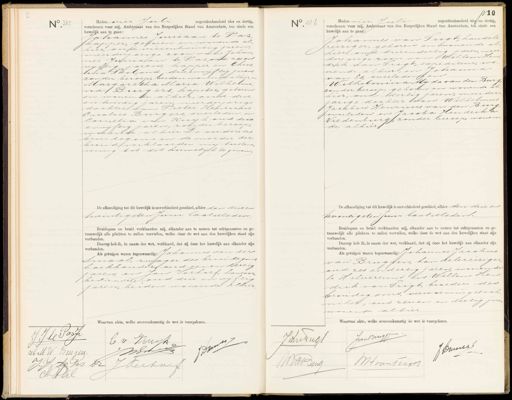 No. 388 Heden vier Juli negentienhonderd vier en dertig, verschenen voor mij, Ambtenaar van den Burgerlijken Stand van Amsterdam, ten einde een huwelijk aan te gaan: Johannes Jurriaan te Fas, kapper, geboren en wonende al hier, oud vierentwintig jaren, meerderjarige zoon van Johan„ nes Jurriaan te Pas oud zes en vijftig jaren, kapper en Chris lina Perl, oud drieenvijftig jaren zonder beroep, beiden wonende alhier, en Margaretha Maria Wilhelmi¬ na Burgers, hapster, geboren en wonende alhier, oud drie en twintig jaren, meerderjarige dochter van Pieter Henrichus Carolus Burgers, overleden, en Cornelia van Kuijk oud drie envijftig jaren, zonder beroep, wonende alhier. De ouders des bruidegoms en de moeder der bruid verklaarden mij toestem ming tot dit huwelijk te geven. De afkondiging tot dit huwelijk is onverhinderd geschied, alhier den drie en twintigsten Juni laatstleden Bruidegom en bruid verklaarden mij, elkander aan te nemen tot echtgenooten en ge trouwelijk alle plichten te zullen vervullen, welke door de wet aan den huwelijken staat zijn verbonden. Daarop heb ik, in naam der wet, verklaard, dat zij door het huwelijk aan elkander zijn verbonden. Als getuigen waren tegenwoordig Johannes van der Smaal, zwager des bruidegoms boekhonder oud eenen dertig jaren, en Jan Verhoef, kantoor bediende oud drie en vijftig jaren, beiden wonende alhier Waarvan akte, welke overeenkomstig No 386 410 Heden vier Juli negentienhonderd vier en dertig, verschenen voor mij, Ambtenaar van den Burgerlijken Stand van Amsterdam, ten einde een huwelijk aan te gaan: Johannes van Prigt, handels rerziger, geboren en wonende al hier, oud drieendertig jaren, meer derjarige zoon van Willem Hen„ drik van Trigt, expediteur, wo- nende alhier, en Johanna van is, overleden, en Wilhelmma Alijda van den Burg zonder beroep, geboren en wonende al hier, oud dertig jaren, meerder jarige dochter van Wilhelmus Jacobus Henricus van den Burg. roverleden en Jacoba Hendrika Vredenburg, zonder beroep, wonen de alhier. De afkondiging tot dit huwelijk is onverhinderd geschied, alhier den drie en twintigsten Juni laat Meden. Bruidegom en bruid verklaarden mij, elkander aan te nemen tot echtgenooten en ge trouwelijk alle plichten te zullen vervullen, welke door de wet aan den huwelijken staat zijn verbonden. Daarop heb ik, in naam der wet, verklaard, dat zij door het huwelijk aan elkander zijn verbonden. Als getuigen waren tegenwoordig: Johannes Jacobus van Bruggen, handelsreiziger oud zes endertig jaren wonende te Hilversum en Willem Hen drik van Srigt, broeder des bruidegoms, verwarmingstech niker, oud zeven en dertig jaren wonende alhier. Waarvan akte, welke overeenkomstig de wet is voorgelezen. J. J. le Sorp E v Wuyk N JJn x A MW. Burgers. JV te zas Dr J Veetorf F vDil J van Bruge JvanBugt J Bumes Wt ranseger JW: JaB Ding