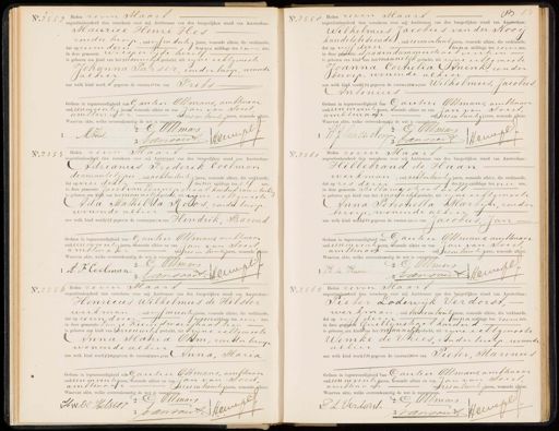 No. 2557 Heden zeven Aaart negentienhonderd tien verscheen voor mij Ambtenaar van den burgerlijken stand van Amsterdam: Maurice Henri Hes zonder beroep, oud vijfen dertig jaren, wonende alhier, die verklaarde, dat opzeven dezer des voor middags ten zeven ure, in deze gemeente Weesperzyde twaalf is geboren een kind van het mannelijk geslacht, uit zijne echtgenoote Johanna Sarser, zonder beroep, wonende alhier aan welk kind wordt gegeven de voornaam van Frits Gedaan in tegenwoordigheid van Cautier Oltmans, ambtenaar oud eenen veertig jaren, wonende alhier en van Jan van Sout ambtenaar oud zes en twintig Jaren, wonende ahier Waarvan akte, welke overeenkomstig de wet is voorgelezen. 2G Ootman Pvanvantoeven MHes No. 255 O Heden zeven Maart negentienhonderd tien verscheen voor mij Ambtenaar van den burgerlijken stand van Amsterdam: Wilhelmus Jacobus van der Booi handelsbediende, oud zeven en twintig Jaren, wonende alhier, die verklaarde dat op vijf dezer des na middags ten zeven ure in deze gemeente Spaarndammerstraat veertien is geboren een kind van het mannelijk geslacht, uit zijne echtgenoote Joanna Cornelia Anink von der beroep, wonende alhierr aan welk kind worden gegeven de voornamn van Wilhelmus, Jacobus Intonius Gedaan in tegenwoordigheid van Cautier Oltmans, ambtenaar oud een en viertigaren, wonende alhier en van Jan van Soert ambtenaar oud zzes en twintig Jaren, wonende alhier. Waarvan akte, welke overeenkomstig de wet is voorgelezen. G Oltman Lewve WJ Van der Hooy 3 vansoert No. 2554 Heden zeven Paart negentienhonderd tien verscheen voor mij Ambtenaar van den burgerlijken stand van Amsterdam: Adrianus Frederik Coelman diamantslijper, oud achtendertig jaren, wonende alhier, die verklaarde dat op vier dezer des na middags ten elf ure, in deze gemeente Jacob van Lennenstraat honderd zeven en tachtig is geboren een kind van het mannelijk geslacht, uit zijne eehtgenoot Ada Mathilda Roos, ronde beroep wonende alhier aan welk kind worden gegeven de voornamen van Hendrik, Barend Gedaan in tegenwoordigheid van Gautier Oltmans, ambtenaar oud een en veertig jaren, wonende alhier en van Jan van Soeht ambtinaar oud zes en twintig Jaren, wonende anhier Waarvan akte, welke overeenkomstig de wet is voorgelezen. G Elsmans van soert ACCvf 1 A: F Coelman. NNo. 2568 Heden zeven Maart negentienhonderd tien verscheen voor mij Ambtenaar van den burgerlijken stand van Amsterdam: Hillebrand de Haan werkman, oud achtentwintig jaren, wonende alhier, die verklaarde dat op zes dezer des voormiddags ten vier ure, in deze gemeente Bellamystraat acht is geboren een kind van het mannelijk geslacht, uit zijne echtgenoote Anna Petronella Martijn, ronder beroep, wonende alhier aan welk kind worden gegeven de voornamen van Jacobus, Jan Cauteer Oltmans, ambtenaar Gedaan in tegenwoordigheid van oud een en veerti jaren, wonende alhier en van Jan van Soert ambtenaar oud zes en twinti jaren, wonende alhier. Waarvan akte, welke overeenkomstig de wet is voorgelezen 2 G Oetman ansveewesse 1 H de Haan No. 2556 5 6 Heden zeven Maart negentienhonderd tien verscheen voor mij Ambtenaar van den burgerlijken stand van Amsterdam: Henricus Wilhelmus de Hilster werkman, oud vijf enveertig Jaren, wonende alhier, die verklaarde, dat op reven dezer des voormiddags ten een ure, in deze gemeente zan de Keizerdwarsstraat tien is geboren een kind van devrouwelik geslacht, uit zijne echtgenoote Anna Maria Ohm, zonder beroep wonende alhier aan welk kind wordengegeven de voornamenvan Anna Maria Gedaan in tegenwoordigheid van Cautier Oltmans, ambtenaar oud een en viertigaren, wonende alhier en van Jan van Sout ambtenaar oud zes en twintig Jaren, wonende alhier. Waarvan akte, welke overeenkomstig de wet is voorgelezen. H v DC Helseer G Olimans van daert Aeren No. 2569 Heden zeven Maart negentienhonderd tien verscheen voor mij Ambtenaar van den burgerlijken stand van Amsterdam: Pieter Lodewijk Verdorst, werkman, oud tweeen twintig jaren, wonende alhier, die verklaarde dat op vijf dezer des na middags ten zeven ure in deze gemeente Quellijnstraat honderd is geboren een kind van het mannelijk geslacht, uit zijne echtgenoote Wemke de Vries, zonder beroep, wonende alhier aan welk kind worden gegeven de voornamen van Pieter, Harinus Gedaan in tegenwoordigheid van Cautier Oltmans, ambtenaar oud een en veerti aren, wonende alhier en van Jan van Socrt ambtinaar oud zes en twintig Jaren, wonende alhier. Waarvan akte, welke overeenkomstig de wet is voorgelezen. Guismans 3vanoert Wesge P L Verdorst