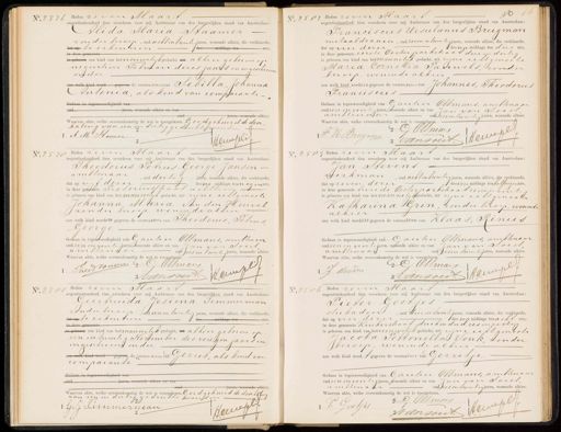 No. 2571 Heden zeven Maart negentienhonderd tien verscheen voor mij Ambtenaar van den burgerlijken stand van Amsterdam: lida Maria Staamer zonder beroep, oud acht entwintig aren, wonende alhier, die verklaarde, daor te erkinnen demiidags ten ure, in deze gemeente is geboren een kind van het vrouwelijk geslacht, uit alhier geboren op negentien Februari dezes jaars en ingeschreven onder ind word gegeven de voornamen van Sebilla, Johanna Antonia, als kind van comparante.- Gedaan in tegenwoordigheid van oud Jeren, worende deren e wonende afhier. Waarvan akte, welke overeenkomstig de wet is voorgelezen. Goedgekuurd de door haling van een en dertig gedrechte woorden 1 A M Staamer Cenmsselis No. 2582 B „ Heden zeven Maart negentienhonderd tien verscheen voor mij Ambtenaar van den burgerlijken stand van Amsterdam, Franciscus Ursulanus Brugman metaaldraauer, oud zevenen twintig jaren, wonende alhier, die verklaarde dat op vier dezer desna middags ten drie ure in deze gemeente eerste Oosterparkstraat drie en dertig is geboren een kind van het mannelijk geslacht, uit zijne echtgenoo te Maria Cornelia Pauwels, zonder beroep, wonende alhier aan welk kind worden gegeven de voornamen van Johannes, Theodorus Franciscus Gedaan in tegenwoordigheid van Eautier Oltmans, ambtenaar oud een en veertig jaren, wonende alhier en van Jan van Soer ambtenaar oud zesentwintig Jaren, wonende alhier. Waarvan akte, welke overeenkomstig de wet is voorgelezen. Guisman Aawwe P H Brugman vansoeit. No. 2510 op Heden zeven Haart negentienhonderd tien verscheen voor mij Ambtenaar van den burgerlijken stand van Amsterdam: Theodorus Petrus George Jansen ambtenaar, oud dertig jaren, wonende alhier, die verklaarde, dat op vijf dezer desng middags ter negen ure, in deze gemeente Pretoriusshaat vilttien is geboren een kind van het mannelijk geslacht, uit zijne echtgenoot Johanna Maria van den Heuvel zonder beroep, wonende alhier aan welk kind worden gegeven de voornamen van Theodorus, Petrus George Gedaan in tegenwoordigheid van Cautier Oltmans, ambtenaar oud een en veertig Jaren, wonende alhier en van Jan van Soert ambtendar ou zes en twintig Jaren, wonende alhier Waarvan akte, welke overeenkomstig de wet is voorgelezen Theod zansen. G Oitmans J vansoert Here No. 2580 „i Heden zeven Maart negentienhonderd tien verscheen voor mij Ambtenaar van den burgerlijken stand van Amsterdam: Jan Stevens werkman, oud achtentwintig jaren, wonende alhier, die verklaarde dat op zeven dezer des voormiddags ten half negenure, in deze gemeente tweede Oosterparkstraat reven en viertig is geboren een kind van het mannelyk geslacht, uit zine echtgenoots Katharina Grin, zonder beroep, wonende alhier aan welk kind worden gegeven de voornammen van Klaas, Rinus Gedaan in tegenwoordigheid van Cautier Oltmans, ambtenaar oud een en veerti jaren, wonende alhier en van Jan van Soest ambtenaar oud zesen twintig Jaren, wonende alhier Waarvan akte, welke overeenkomstig de wet is voorgelezen. COltman Aerweg J de Vens ransoert. No. 2588 Heden reven Haart egentienhonderd tien verscheen voor mij Ambtenaar van den burgerlijken stand van Amsterdam Geertruida Jesiena Timmerman zonder beroep oud eenen twintig jaren, wonende alhier, die verklaarde vate erkentien der G in deze gemeente is geboren een kind van hetmannelik geslacht, in alhier geboren op een en twintig Novvember des vorigen jaars en ingeschreven onder oet kidt vord gegeven de voornaam van Gerrit, als kind van t comparante nde u Waarvan akte, welke overeenkomstig de wet is voorgelezen. Goedgekeurd de doorhelen van een en dertig gedreeste woorden Decuef 1 GJJ Rimmerman No. 2586 6 Heden zeven Maart negentienhonderd tien verscheen voor mij Ambtenaar van den burgerlijken stand van Amsterdam: Pieter Gootees sterkadoor, oud drie entwinti Jjaren, wonende alhier, die verklaarde, dat op vier dezer des na middags ten acht ure, in deze gemeente Kinkerstraat driehonderd zes en zestig is geboren een kind van het vrouwelijk geslacht, uit zijne echtgenoote Jacoba Petronella Ionk, zonder beroep, wonende alhier aan welk kind word gegeven de voornaam van Gerritje Gedaan in tegenwoordigheid van Eautier Oltmans, ambtenaar oud een en veertig jaren, wonende alhier en van Jan van Socht, ambtenaar oud zes en twintig Jaren, wonende alhier. Waarvan akte, welke overeenkomstig de wet is voorgelezen. L Oltmans Jansoert HeWesel 1J. Gootje