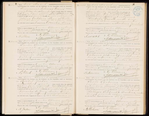 No. 24 D Heden drie Maart negentienhonderd tien verscheen voor mij Ambtenaar van den burgerlijken stand van Amsterdam: Franciscus Antonius Overes wag en bestuurder, oud twee en dertigj aren, wonende alhier, die verklaarde, dat op drie dezer des voormiddags ten een ure, in deze gemeente Jacob van Lennepkade twee zonderd venrt is geboren een kind van het vrouwe lyf geslacht, uit zijne echtgenoot Johanna Catharina Maria Scholten, zonder beroep, wonende alhier aan welk kind worden gegeven de voornamen van Cornelia, Maria Gedaan in tegenwoordigheid van Cautier Oltmans, ambtinaar oud een en veertig jaren, wonende alhier en van Jan van Soert ambtina a oud zes en twintigjaren, wonende alhier. Waarvan akte, welke overeenkomstig de wet is voorgelezen, G Oltmans J ansvertHerver 1 F. A. Vveres No. 2426 Heden drie Maart negentienhonderd tien C8 verscheen voor mij Ambtenaar van den burgerlijken stand van Amsterdam: Lambertus Vriens, grondwerken v oud twee en twintig jaren, wonende alhier, die verklaarde, dat op twee dezer des namiddags ten half du cure, 1 in deze gemeente Iuinstraat 229 is geboren een kind van het mannelijkeslacht, uit zijne eeltginoote Hendrika Onink, zonder beroep, wonende al hier. aan welk kind worden gegeven de voornammen van Martinus, Jacobus Gedaan in tegenwoordigheid van Gauter Oltmans, ambtenaar oud een en veertig jaren, wonende alhier en van Jan van Sout ambtinaar oud zzes en twintig jaren, wonende alhier. Waarvan akte, welke overeenkomstig de wet is voorgelezen, G Oltmans luriens 3 Vansvert fewesses No. 242 „ Heden drie Maar negentienhonderd tien verscheen voor mij Ambtenaar van den burgerlijken stand van Amsterdam: Pieter Bink zigarenmaker, oud vijftig jaren, wonende alhier, die verklaarde dat o tweedezer des na middags ten vijf ure, in deze gemeente Konijnenstraat res is geboren een kind van het vrouwlijk geslacht, uit zijne erktgenoote Jannetje Kik, zonder beroep, wonende alhier. aan welk kind word gegeven de voornaam van Jannetje Gedaan in tegenwoordigheid van Eautier Oltmans, ambtenaar oud een en veertig jaren, wonende alhier en van Jan van Sout ambtinaari oud zes en twintig jaren, wonende alhier. Waarvan akte, welke overeenkomstig de wet is voorgelezen. 2G Oltman Perwe P, Bink Dvansoert. No. 248 28 Heden drie Maar negentienhonderd tien verscheen voor mij Ambtenaar van den burgerlijken stand van Amsterdam: Petrus Hosman werkman, oud zes en vierti jaren, wonende alhier, die verklaarde, dat op tweedezer des na middags ten vijf ure, in deze gemeente Lauvierstraat houderd zes en zestig is geboren een kind van het mannelijk geslacht, uit zijne achtgenoote Catharina Johanna Gerdets zonder beroep, wonende alhier aan welk kind worden gegeven de voornammen van Jacobus Hermanus Gedaan in tegenwoordigheid van Cautier Oltmans, ambtenaar oud een enveertig jaren, wonende alhier en van Jan van Soest, Ambtenaar oud zesentwintigjaren, wonende alhier. Waarvan akte, welke overeenkomstig de wet is voorgelezen. 2 G Oltman 1 P Mosman JEanvoert HeWesel No. 2424 Heden drie Maart negentienhonderd tien verscheen voor mij Ambtenaar van den burgerlijken stand van Amsterdam: Roelof Jonker pakhuisbaas, oud veertig jaren, wonende alhier, die verklaarde, dat op twee deren des namiddags ten half ien ure, in deze gemeente Sumatrastraat vyf en dertig is geboren een kind van het vrouwelikgeslacht, uit zijne achtgenoot Kornelia de Jong, zonder beroep wonende alhier aan welk kind word gegeven de voornaam van Wilhelmina Gedaan in tegenwoordigheid van Cautier Oltmans, ambtenaar oud een en veertig jaren, wonende alhier en van Jan van Soert ambtenaar ou zzes en twintijaren, wonende alhier. Waarvan akte, welke overeenkomstig de wet is voorgelezen 2 G. Oltmans OSmaaent Heverse 1 R. Jonker No. 2431 „ Heden drie Maart negentienhonderd tien verscheen voor mij Ambtenaar van den burgerlijken stand van Amsterdam: Bote Teeksma loopknecht, oud een en dertig jaren, wonende alhier, die verklaarde, dat op leen dezer des voormiddags ten half vier ure, in deze gemeente vonr resenstraat zeven en dertig is geboren een kind van het vrouwelif geslacht, uit zijne echtgenoote Hillegie Frederika Heeroma, zonder beroep, wonende alhier aan welk kind wordgegeven de voornaam van Petje. Gedaan in tegenwoordigheid van Cautier Olfmans, ambtenaar oud een en veertig jaren, wonende alhier en van Jan van Sout, ambtenaar opd zes en twintig Jaren, wonende alhier. Waarvan akte, welke overeenkomstig de wet is voorgelezen. 2G. Oltmans B Piekma„ Jvandoert ferves