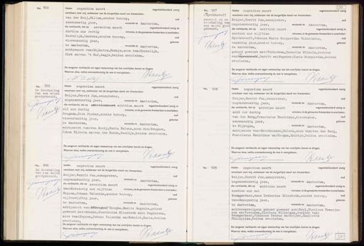 Meijer, Gerrit Jan,aanspreker, oud Heden negentien maart negentienhonderd zestig verscheen voor mij, ambtenaar van de burgerlijke stand van Amsterdam: negenenveertig jaar, wonende te Amsterdam, die verklaarde, dat op axhttienmaart achttien maart negentienhonderd zestig te elf uur dertig minuten, in de gemeente Amsterdam is overleden Brugman, Dirk Pieter,zonder beroep, oud vierentachtig jaar, geboren te Amsterdam, wonende te Amsterdam, echtgenoot van: van Rooij,Maria Helena,zoon van: Brugman, Johan Wilhelm en: van der Heide,Neeltje,beiden overleden. De aangever verklaarde uit eigen wetenschap van het overlijden kennis te dragen. Waarvan akte, welke overeenkomstig de wet is voorgelezen. Baans C Om No. 908 Heden negentien maart negentienhonderd zestig verscheen voor mij, ambtenaar van de burgerlijke stand van Amsterdam: Meijer, Gerrit Jan,aanspreker, oud negenenveertig jaar, wonende te Amsterdam, die verklaarde, dat op achttien maart negentienhonderd zestig t acht uur dertig minuten, in de gemeente Amsterdam is overleden van den Berg, Franciscus Hendrikus,kleermaker, oud eenenzestig jaar, geboren te Nijmegen,, wonende te Amsterdam, echtgenoot van: Groothuizen, Helena,zoon van: van den Berg Franciscus Hendrikus en: Hoogma, Grietje,beiden overleden. De aangever verklaarde uit eigen wetenschap van het overlijden kennis te dragen. Waarvan akte, welke overeenkomstig de wet is voorgelezen. puyen JaanJ No. 906. de doorhaling van een woord goedgekeurd. Bnessen Hatf Heden negentien maart negentienhonderd zestig Meijer, Gerrit Jan,aanspreker, oud verscheen voor mij, ambtenaar van de burgerlijke stand van Amsterdam: negenenveertig jaar, wonende te Amsterdam, die verklaarde, dat op zeventien maart negentienhonderd zestig te tweeëntwintig uur vijftien minuten, in de gemeente Amsterdam is overleden Hoppen, Johann Valentin,zonder beroep, oud vijfenvijftig jaar, geboren te Amsterdam, wonende te Amsterdam, echtgenoot van: DeffeegheDd 'Hooghe, Emelie Eugenie,gehuwd geweest met: Seunke, Geertruida Elisabeth Anna Magdalena, zoon van: Hoppen, Johann Valentin en: Haboldt, Maria,beiden overleden. De aangever verklaarde uit eigen wetenschap van het overlijden kennis te dragen Waarvan akte, welke overeenkomstig de wet is voorgelezen. Haant Byen No. 909 Heden negentien maart negentienhonderd zestig verscheen voor mij, ambtenaar van de burgerlijke stand van Amsterdam: Meijer, Gerrit Jan,aanspreker, ou negenenveertig jaar, wonende te Amsterdam, die verklaarde, dat op achttien maart negentienhonderd zestig te zestien uur nul minuten, in de gemeente Amsterdam is overleden. Baumgartner, Anna Catharina Elisabeth,zonder beroep, oud tweeënnegentig jaar, geboren te Amsterdam, wonende te Amsterdam, achtereenvolgens gehuwd geweest met: Krul,Nicolaas Francis- cus en: Verouden, Nicolaas Wilhelmus,dochter van: Baumgartner, Johannes Petrus en: Meijer, Charlotta Philippina,beiden overleden. De aangever verklaarde uit eigen wetenschap van het overlijden kennis te dragen. Waarvan akte, welke overeenkomstig de wet is voorgelezen. uer Haartj