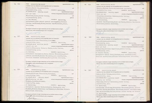 No. 916. Heden eenentwintig maart negentienhonderd zestig verscheen voor mij, ambtenaar van de burgerlijke stand van Amsterdam: Meijer, Gerrit Jan,aanspreker, oud negenenveertig jaar, wonende te Amsterdam, die verklaarde, dat op twintig maart negentienhonderd zestig te elf uur tien minuten, in de gemeente Amsterdam is overleden Walkeuter,Aafje,zonder beroep, ode vijfenzeventig jaar, geboren te Den Helder,, wonende te Amsterdam, achtereenvolgens gehuwd geweest met: Lageman, Johannes Jacobus en: Huisman, Siebe,dochter van:Walkeuter, Aafje, overleden. De aangever verklaarde uit eigen wetenschap van het overlijden kennis te dragen. Waarvan akte, welke overeenkomstig de wet is voorgelezen. Brussen A No. 919 Heden eenentwintig maart negentienhonderd zestig verscheen voor mij, ambtenaar van de burgerlijke stand van Amsterdam: Brenker, Hendrik Frederik,technisch opzichter, oud vierenvijftig jaar, wonende te Amsterdam, die verklaarde, dat op twintig maart negentienhonderd zestig te vier uur nul minuten, in de gemeente Amsterdam is overleden: Potgieter, Gerardina Johanna,zonder beroep, o0o tweeënzeventig jaar, geboren te Leeuwarden, wonende te Amsterdam, dochter van: Potgieter, Douwe en: Janzen, Johanna Geertruida Wilhelmina,beiden overleden. De aangever verklaarde uit eigen wetenschap van het overlijden kennis te dragen. Waarvan akte, welke overeenkomstig de wet is voorgelezen. 17 1 HHrenke No. 917 Heden eenentwintig maart negentienhonderd zestig verscheen voor mij, ambtenaar van de burgerlijke stand van Amsterdam: Kimman, Wilhelmus Franciscus,directeur, oud zesenvijftig jaar, wonende te Amsterdam, die verklaarde, dat op achttien maart negentienhonderd zestig te twaalf uur nul minuten, in de gemeente Amsterdam is overleden Sluiter, Franciscus Cornelis Maria,zonder beroep, oud eenenzeventig jaar, geboren te Zutphen, wonende te Amsterdam, echtgenoot van: Lambour, Maria Johanna Wilhelmina,gehuwd geweest met:Wolff, Aleida Willemina,zoon van: Sluiter, Antonius Johannes en: Misana, Maria,beiden overleden. De aangever verklaarde uit eigen wetenschap van het overlijden kennis te dragen. Waarvanakte, welke overeenkomstig de wet is voorgelezen. N W.F Kumm No. 920 Heden eenentwintig maart negentienhonderd zestig verscheen voor mij, ambtenaar van de burgerlijke stand van Amsterdam: Vogel, Hermanus,aanspreker, oud vierenzestig jaar, wonende te Amsterdam, die verklaarde, dat op twintig maart negentienhonderd zestig te vier uur vijf minuten, in de gemeente Amsterdam is overleden Mathijssen, Adrianus Augustinus,zonder beroep, oud geboren tweeënzestig jaar, te Baarle Nassau, wonende te Amsterdam, echtgenoot van: de Goeij, Barbara,zoon van: Mathijssen, Cornelis en: Frijters, Adriana Cornelia,beiden overleden. De aangever verklaarde uit eigen wetenschap van het overlijden kennis te dragen. Waarvan akte, welke overeenkomstig de wet is voorgelezen. N No. 918 Heden eenentwintig maart negentienhonderd zestig verscheen voor mij, ambtenaar van de burgerlijke stand van Amsterdam: Kimman, Wilhelmus Franciscus,directeur, oud zesenvijftig jaar, wonende te Amsterdam, die verklaarde, dat op twintig maart negentienhonderd zestig te doieentwintig uur nul minuten, in de gemeente Amsterdam is overleden 19 Rijmers, Gerardus, koopman, oud zesenvijftig jaar, geboren te Amsterdam, wonende te Amsterdam, echtgenoot van: ter Woort, Catharina Maria,zoon van: Rijmers,Wilhelm Hendrikus en: Vahrmeijer, Dorothea Wilhel- mina,beiden overleden. De aangever verklaarde uit eigen wetenschap van het overlijden kennis te dragen. Waarvan afte, welke overeenkomstig de wet is voorgelezen. W.V. Br No. 921 Heden eenentwintig maart negentienhonderd zestig verscheen voor mij, ambtenaar van de burgerlijke stand van Amsterdam: