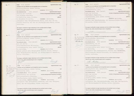 No. 22 Heden vijf januari negentienhonderd zestig verscheen voor mij, ambtenaar van de burgerlijke stand van Amsterdam: Krebber, Johannes, zonder beroep, oud zesenzestig jaar, wonende te Amsterdam, die verklaarde, dat op drie januari negentienhonderd zestig te twintig uur vijftien minuten, in de gemeente Amsterdam is overleden: van As, Simon Arnoldus, oud vijfenvijftig jaar, koopman, geboren te Breukelen Nijenrode, wonende te Amsterdam, echtgenoot van: Blom, Geertruida Maria, zoon van: van As, Jacobus Cornelis, en: van der Zijden, Apolonia Maria, beiden overleden. De aangever verklaarde uit eigen wetenschap van het overlijden kennis te dragen. Waarvan akte, welke overeenkomstig de wet is voorgelezen. 1 Han No. 25 Heden vijf januari negentienhonderd zestig verscheen voor mij, ambtenaar van de burgerlijke stand van Amsterdam: Oue Vos, Johannes, aanspreker, zevenenzeventig jaar, wonende te Amsterdam, negentienhonderd zestig te A acht uur vijftien minuten, in de gemeente Amsterdam is overleden. Kahlé, Maria Magdalena, negenenzestig jaar, zonder beroep, geboren te Amsterdam, wonende te Amsterdam, dochter van: Kahlé,Abraham, en: Kraamer, Johanna Catharina Elisabeth, beiden overleden. De aangever verklaarde uit eigen wetenschap van het overlijden kennis te dragen. Waarvan akte, welke overeenkomstig de wet is voorgelezen. Haartj No. 23 Heden vijf januari negentienhonderd zestig verscheen voor mij, ambtenaar van de burgerlijke stand van Amsterdam: Krebber, Johannes, zonder beroep, oud zesenzestig jaar, wonende te Amsterdam, die verklaarde, dat op vier januari negentienhonderd zestig te zes uur dertig minuten, in de gemeente Amsterdam is overleden: Bergisch,Christina Wilhelmina, oud zevenennegentig jaar, zonder beroep, geboren te Amsterdam, wonende te Amsterdam, gehuwd geweest met: Burger, Abram Hendrik Joseph, dochter van: Bergisch, Carel Henrich, en: Stock, Jeannette Henriëtte, beiden overleden. De aangever verklaarde uit eigen wetenschap van het overlijden kennis te dragen. Waarvan akte, welke overeenkomstig de wet is voorgelezen. Kret Haantje No. 26 De doorhaling van een woord goedgekeurd. H. Mulder Haants No. 26 Heden vijf januari negentienhonderd zestig verscheen voor mij, ambtenaar van de burgerlijke stand van Amsterdam: Mulder, Herman; aanspreker; oud zevenenzestig jaar, wonende te Amsterdam, die verklaarde, dat op drie januari negentienhonderd zestig te eenentwintig uur nul minuten, in de gemeente Amsterdam is overleden Phillipson, Geertrui, oud vierenzeventig jaar, zonder beroep, geboren te Amsterdam, wonende te Amsterdam, echtgenote van: Luskus, Gerrit, dochter van: Phillipsen, Phillipson, Jan Hendrik Nicolaas, en: Verboom, Dirkje, beiden overleden. De aangever verklaarde uit eigen wetenschap van het overlijden kennis te dragen. Waarvan akte, welke overeenkomstig de wet is voorgelezen. HaanGs H. Mulder No. 24 No. 24 den goedge- De doorhaling van twee woor- Reued.9 Los Wan Heden vijf januari negentienhonderd zestig verscheen voor mij, ambtenaar van de burgerlijke stand van Amsterdam: Krebber, Johannes, zonder beroep, oud zesenzestig jaar, wonende te Amsterdam, die verklaarde, dat op drie januari negentienhonderd zestig te eenentwintig uur vijftien minuten, in de gemeente Amsterdam is overleden. Schipper, Cornelis Gerardus, oud tweeënzeventig jaar, zonder beroep, geboren te Amsterdam, zonder-bereep, wonende te Amsterdam, echtgenoot van: Spitz, Sophia Hendrika, zoon van: Schipper, Arie, en: van Wijk, Janna, beiden overleden. De aangever verklaarde uit eigen wetenschap van het overlijden kennis te dragen. Waarvan akte, welke overeenkomstig de wet is voorgelezen. Haanles 167 No. 27 Heden vijf januari negentienhonderd zestig verscheen voor mij, ambtenaar van de burgerlijke stand van Amsterdam: Meijer, Gerrit: Jan, aanspreker, oud negenenveertig jaar, wonende te Amsterdam, die verklaarde, dat op drie januari negentienhonderd zestig te drie uur dertig minuten, in de gemeente Amsterdam is overleden: Hartog,Albert, oud zeventig. jaar, zonder beroep, geboren te Spaarndam, wonende te Amsterdam, echtgenoot van: Hartendorp, Geeske, zoon van: Hartog, Jacob, en: Broedersz,Annetta Helena, beiden overleden. De aangever verklaarde uit eigen wetenschap van het overlijden kennis te dragen. Waarvan akte, welke overeenkomstig de wet is voorgelezen. Hrantes Bnegin