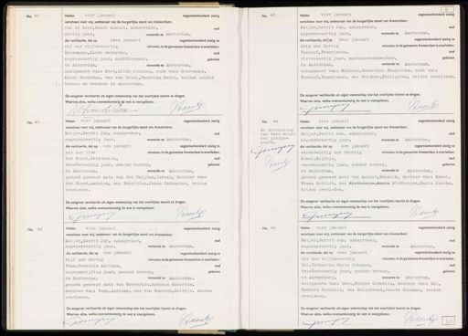 No. 40 Heden vier januari negentienhonderd zestig verscheen voor mij, ambtenaar van de burgerlijke stand van Amsterdam: van de Leuv, Henri August, aanspreker, zestig jaar, wonende te Amsterdam, die verklaarde, dat op twee januari negentienhonderd zestig te elf uur vijfenveertig minuten, in de gemeente Amsterdam is overleden Heeremans, Karel Gerardus, oud negenendertig jaar, marktkoopman, geboren te Amsterdam, wonende te Amsterdam, echtgenoot van: Moos, Alida Johanna, zoon van: Heeremans, Karel Gerardus, en: van Driel, Hendrika Maria, beiden zonder beroep en wonende te Amsterdam. De aangever verklaarde uit eigen wetenschap van het overlijden kennis te dragen. Waarvan akte, welke overeenkomstig de wet is voorgelezen. Haante Avan de Eeen No. 43 Heden vier januari negentienhonderd zestig verscheen voor mij, ambtenaar van de burgerlijke stand van Amsterdam: Meijer, Gerrit. Jan, aanspreker, oud negenenveertig jaar, wonende te Amsterdam, negentienhonderd zestig te die verklaarde, dat op twee januari drie uur dertig minuten, in de gemeente Amsterdam is overleden Veenhof, Franciscus, oud vierenzestig jaar, machine-bankwerker, geboren te Amsterdam, wonende te Amsterdam, echtgenoot van: Mikkers, Gerardina Frederika, zoon van: Veenhof, Franciscus, en: Fuldner, Philippina, beiden overleden De aangever verklaarde uit eigen wetenschap van het overlijden kennis te dragen. Waarvan akte, welke overeenkomstig de wet is voorgelezen. pruyen Haantjs No. 41 Heden vier januari negentienhonderd zestig verscheen voor mij, ambtenaar van de burgerlijke stand van Amsterdam: Meijer, Gerrit Jan, aanspreker, oud negenenveertig jaar, wonende te Amsterdam, die verklaarde, dat op eén januari negentienhonderd zestig te zes uur tien minuten, in de gemeente Amsterdam is overleden ter Horst, Petronella, oud tweeëntachtig jaar, zonder beroep, geboren te Amsterdam, wonende te Amsterdam, gehuwd geweest met: van der Heijden, Israel, dochter van: ter Horst,Andries, en: Fabritius, Janna Catharina, beiden overleden. De aangever verklaarde uit eigen wetenschap van het overlijden kennis te dragen. Waarvan akte, welke overeenkomstig de wet is voorgelezen. Raante Gmeye No. 41 De doorhaling, van twee woor- den goedge- keurd. Grruieri Haant Heden vier januari negentienhonderd zestig verscheen voor mij, ambtenaar van de burgerlijke stand van Amsterdam: Meijer, Gerrit Jan, aanspreker, oud negenenveertig jaar, wonende te Amsterdam, die verklaarde, dat op een januari negentienhonderd zestig te eenentwintig uur twintig minuten, in de gemeente Amsterdam is overleden Romel, Mijntje, 000 eenennegentig jaar, zonder beroep, geboren te Amsterdam, wonende te Amsterdam, gehuwd geweest met: van Asselt, Hendrik, dochter van: Romel, Franz Gottlob, en: Rietbergem,Maria Rietbergen, Maria Jacoba, beiden overleden. De aangever verklaarde uit eigen wetenschap van het overlijden kennis te dragen. Waarvan akte, welke overeenkomstig de wet is voorgelezen. Haantj Gmeyen No. 42 Heden vier januari negentienhonderd zestig verscheen voor mij, ambtenaar van de burgerlijke stand van Amsterdam: Meijer, Gerrit Jan, aanspreker, oud negenenveertig jaar, wonende te Amsterdam, die verklaarde, dat op een januari negentienhonderd zestig te vijf uur dertig minuten, in de gemeente Amsterdam is overleden: Vonk, Cornelia Adriana, oud negenenvijftig jaar, zonder beroep, geboren te Rotterdam, wonende te Amsterdam, gehuwd geweest met: van Westerloo,Antonie Hubertus, dochter van: Vonk,Adriaan, en: van Gameren, Grietje, beiden overleden. De aangever verklaarde uit eigen wetenschap van het overlijden kennis te dragen. Waarvan akte, welke overeenkomstig de wet is voorgelezen. Haantj pruyen No. 45 Heden vier januari negentienhonderd zestig verscheen voor mij, ambtenaar van de burgerlijke stand van Amsterdam: Meijer, Gerrit Jan, aanspreker, oud negenenveertig jaar, wonende te Amsterdam, die verklaarde, dat op twee januari negentienhonderd zestig te zes uur vijfenveertig minuten, in de gemeente Amsterdam is overleden Hol, Catharina Maria Johanna, oud tweeënzeventig jaar, zonder beroep, geboren te Aardenburg, wonende te Amsterdam, echtgenote van: Boes, Pieter Cornelis, dochter van: Hol, Hendrik Cornelis, en: Hollebrand, Jacoba Susanna, beiden overleden. De aangever verklaarde uit eigen wetenschap van het overlijden kennis te dragen. Waarvan akte, welke overeenkomstig de wet is voorgelezen. Hoante pup