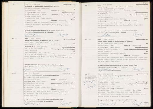 No. 46 Heden vier januari negentienhonderd zestig verscheen voor mij, ambtenaar van de burgerlijke stand van Amsterdam: Meijer, Gerrit, Jan, aanspreker, oud negenenveertig jaar, wonende te Amsterdam, die verklaarde, dat op één januari negentienhonderd zestig te drieentwintig uur vijftien minuten, in de gemeente Amsterdam is overleden. Genot,Nicolaas Johan, oud tweeënzestig jaar, zonder beroep, geboren te Amsterdam, wonende te Amsterdam, echtgenoot van: de Vries,Anna Catharina, zoon van: Genot, Theodorus Bernardus, en: Beekman, Maria Minke, beiden overleden. De aangever verklaarde uit eigen wetenschap van het overlijden kennis te dragen. Waarvan akte, welke overeenkomstig de wet is voorgelezen. Pruysen Haantjr No. 49 Heden vier januari negentienhonderd zestig verscheen voor mij, ambtenaar van de burgerlijke stand van Amsterdam: van der Luit, Hendrik, uitvoerder, oud negenendertig jaar, wonende te Leiden, die verklaarde, datop twee januari negentienhonderd zestig te acht uur dertig minuten, in de gemeente Amsterdam is overleden van Leeuwen, Marius, oud achtenvijftig jaar, zonder beroep, geboren te Leiden, wonende te Leiden, echtgenoot van: Kop, Petronella Johanna, zoon van: van Leeuwen, Johannes, en: van Duuren, Catharina, beiden overleden. De aangever verklaarde uit eigen wetenschap van het overlijden kennis te dragen. Waarvan akte, welke overeenkomstig de wet is voorgelezen. Haanto WJv Vius No. 47 Heden vier januari negentienhonderd zestig verscheen voor mij, ambtenaar van de burgerlijke stand van Amsterdam: Meijer, Gerrit Jan, aanspreker, oud negenenveertig jaar, wonende te Amsterdam, die verklaarde, dat op twee januari negentienhonderd zestig te zestien uur vijfenveertig minuten, in de gemeente Amsterdam is overleden Huizer, Johannis,