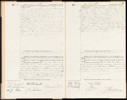 No. 241 Heden negen Mei negentienhonderd vier en dertig, verschenen voor mij, Ambtenaar van den Burgerlijken Stand van Amsterdam, ten einde een huwelijk aan te gaan: Hendricus Leonardus Bernardus Smit, ijzerwerker, geboren en wo¬ nen de alhier, oud eenentwintig jaren, meeiderjarige zoon van Nicolaas Smit, overleden, Maria Jacoba Kas, oud vier en vyftig jaren, zonder beroep, wonende alhier, en Mietje Siekman, zonder be roep, geboren en wonende alhier oud eenentwintig jaren meerder jarige dochter van Johannes Laurens Sie kman, overleden en Mietje Cosse, oud vierenveer tig jaren welkster, wonende alhier. Debeide moeders verklaar den mij testemming tot dit huwelijk te geven De afkondiging tot dit huwelijk is onverhinderd geschied, alhier den achten twintigsten April laaterleder Bruidegom en bruid verklaarden mij, elkander aan te nemen tot echtgenooten en ge trouwelijk alle plichten te zullen vervullen, welke door de wet aan den huwelijken staat zijn verbonden. Daarop heb ik, in naam der wet, verklaard,dat zij door het huwelijk aan elkander zijn verbonden. Als getuigen waren tegenwoordig endrikus Leonardus Smit, oom des brui degoms diamankslijper en Johannes Lou ren Siekman, oeder der bruid, boekdrukker, oud zesenwintig jaren beiden wonende alhier zijnde de eerste gelinge zevenenzestig jaren oud Te moeder der bruid heeft miet geteekend, daar zij niet schrijven kon. No. 242 ƒ 41 Heden elf Mei negentienhonderd vier en dertig verschenen voor mij, Ambtenaar van den Burgerlijken Stand van Amsterdam, ten einde een huwelijk aan te gaan: Johann Wilhelm Wirtz, kok geboren te Keulen in Duitschland, wo nende alhier, oud acht en dertig ja ren, Duitscher, meerderjarige zoon van Johann Peter Wirtz, en Emma Deubert, beiden overleden, en Agnes Kortlang, zonder be roep, geboren te Milheim aan de Rijn in Duitschland, wonende al¬ hier, oud vijf en dertig jaren wedu we van August Franz Wilhelm steingiepzer, Zuitsche, meerder jarige dochter van Josef Kortland overleden en Margaretha Fleiscch harer, zonder beroep, wonende te Keulen, voornoemd. De afkondiging tot dit huwelijk is onverhinderd geschied, alhier den acht en twintigsten April laatstleden Bruidegom en bruid verklaarden mij, elkander aan te nemen tot echtgenooten en ge trouwelijk alle plichten te zullen vervullen, welke door de wet aan den huwelijken staat zijn verbonden. Daarop heb ik, in naam der wet, verklaard, dat zij door het huwelijk aan elkander zijn verbonden. Als getuigen waren tegenwoordig: Pritz Kotze, kleerma ker, oud acht en dertig jaren, en Johannes Faber, bode, oud negenenveertig jaren, beide wonende alhier. Waarvan akte, welke overeenkomstig de wet is voorgelezen. J.L B. esmit. Hd B Smit Van soest M. Siekman J.L Dukman. M. J. Kas Jun Gottl Will. Wirt L Harflarte JJ der JMMaatiecea 1