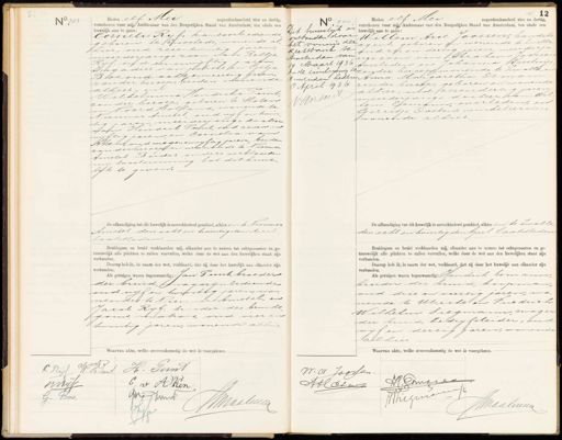 No 243 Heden elf Mei negentienhonderd vier en dertig verschenen voor mij Ambtenaar van den Burgerlijken Stand van Amsterdam, ten einde een huwelijk aan te gaan: Cornelis Rijf, kantoorbediende, geboren te onschede, wonende al¬ hier, oud zesentwintig jaren, meerderjarige zoon van Keltje Rijf, oud eenenvijftig jaren bruga dier van poue in Getje Bos, oud achtenveertig jaren zonder beroep, beiden wonende alhier, en Wilhelmina Hendrika Tunt, zonder beroep, geboren te sloten in Noord Holland, wonende te Nieuwer Amstel oud vijf en tin tig jaren, meerderjarige dochter van Hendrik Tant, oud zeven en vijftig jaren en Cornelia van Aken, oud negenenviftig jaren, beiden zonder beroep en wonende te Nieuwer Amstel. Beider ouders verklaarden mij toestemming tot dit huwe, lijk te geven. De afkondiging tot dit huwelijk is onverhinderd geschied, alhier en te Nieuwer Amstel den acht en twintigsten April laatstleden. Bruidegom en bruid verklaarden mij, elkander aan te nemen tot echtgenooten en ge- trouwelijk alle plichten te zullen vervullen, welke door de wet aan den huwelijken staat zijn verbonden. Daarop heb ik, in naam der wet, verklaard, dat zij door het huwelijk aan elkander zij- verbonden. As getuigen wonen tegenwoordig Jan Tunt, broeder der bruid, magazijnbediende oud vijf en tintig jaren, wo- nende te Pieuwers Amstel, en Jacob Rijf, broeder des bruide¬ Soms, matroos, oud vier en twintig jaren, wonende alhier Waarvan akte, welke overeenkomstig de wet is voorgele No 244 Dit huwelijk is ontbonden door Rechtbank te het vonnis der Amsterdam van 19 Maart 1936 In de inschrijving te Amsterdam heden 8 April 1936 JJnsvert f. 12 Heden elf Mei negentienhonderd vier en dertig, verschenen voor mij Ambtenaar van den Burgerlijken Stand van Amsterdam, ten einde een huwelijk aan te gaan: Willem Arie Joossen, handels agent, geboren en wonende te zwolle ud zes en dertig jaren, meerderja rige zoon van Abraham Joosser overleden en Johanna Versluijs zonder beroep wonende te Zwalle, en Arna Margaretha Esmann zonder beroep, geboren en wonende alhier, oud zesendertig jaren meerderjarige dochter van Wil lem Esmann, overleden, en Gerritje Oosten, winkelierster. twonende alhier De afkondiging tot dit huwelijk is onverhinderd geschied, alhier en te Zwalle den acht en twintigsten April laatstleden Bruidegom en bruid verklaarden mij, elkander aan te nemen tot echtgenooten en ge trouwelijk alle plichten te zullen vervullen, welke door de wet aan den huwelijken staat zijn verbonden. Daarop heb ik, in naam der wet, verklaard, dat zij door het huwelijk aan elkander zijn verbonden. Als getuigen waren tegenwoordig: Hendrik Esmann broeder der bruid, koopman, oud drie en veertig jaren mo nende te Utrecht en Friedrich Wilhelm Siegmann, zwager der bruid, bedrijfsleider, ond vijf en dertig jaren, wonende al hier Waarvan akte, welke overeenkomstig de wet is voorgelezen. a7 C. Rijf V. H. Sunt: H. Sunt C. v A Ken Wrijf Grrgsumt G„ Bos. JMMaalenu W:A Joossen. H. Amsiee AH. ELaos Jegmam WMaaleuu