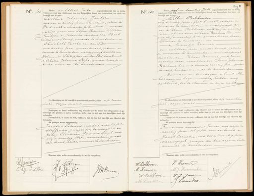 No. 103 Heden achttien Juli negentienhonderd vier en dertig, verschenen voor mij, Ambtenaar van den Burgerlijken Stand van Amsterdam, ten einde een huwelijk aan te gaan: Arthur Johannes Jantgen oud een en dertig jaren, kruidenier, geboren te Oordrecht en wonende te Amsterdam meerder, „jarige zoon van Alfons Hermann Wilhelm Jantzen en Johanna Antonesta Beek beiden zonder beroep, wonende te Amsterdam en Elisabeth Jacoba aan den Bos oud dertig jaren, zonder beroep, geboren en wonende te Amsterdam meerderjarige dochter van Johannis Philippus van den Bos, kunstsmid en Alida Johanna Eijpe, zonder beroep, beiden wonende te Amsterdam De afkondiging tot dit huwelijk is onverhinderd geschied, alhier op zeven Juli, dezes jaars. Bruidegom en bruid verklaarden mij, elkander aan te nemen tot echtgenooten en ge trouwelijk alle plichten te zullen vervullen, welke door de wet aan den huwelijken staat zijn verbonden. Daarop heb ik, in naam der wet, verklaard, dat zij door het huwelijk aan elkander zijn verbonden. Als getuigen waren tegenwoordig: Jacobus Petersen, oud drie en veertig Jare stoffeerder, zwager des bruidegoms en Johan Christiaan Gerardus Spigt, oud vijf en twintig jaren, assuradeur, zwager der bruid, beide wonende te Amsterdam Waarvan akte, welke overeenkomstig de wet is No. 104 Am 8 Heden vijf en twintig Juli negentienhonderd vier en dertig verschenen voor mij, Ambtenaar van den Burgerlijken Stand van Amsterdam, ten einde een huwelijk aan te gaan: Willem Bolhoven oud twintig jaren, fietsknecht geboren en wonende te Amsterdam, minderjarige zoon van Willem Bolhoven oud vyf en veertig jaren, stucadoor en haria Everdina Berndsen oud vijf en veertig jaren, zonder beroep beiden wonende te Amsterdam en Maretje Kramer oud achttien jaren, zonder beroep, geboren en wonende te Amsterdam, minderjarige dochter aan Klaas Kramer, oud zese veertig jaren, nachtwater enlaria Johanna Karemaker, oud twee en veertig jaren zonder beroep beiden wonende te Amsterda De ouders van bruidegom en bruid allen hier voor mij tegenwoordig, hebben mij verklaard, toe te stemmen in dezen echt- De afkondiging tot dit huwelijk is onverhinderd geschied, alhier op veertien Juli, dezes jaars Bruidegom en bruid verklaarden mij, elkander aan te nemen tot echtgenooten en ge trouwelijk alle plichten te zullen vervullen, welke door de wet aan den huwelijken staat zijn verbonden. Daarop heb ik, in naam der wet, verklaard, dat zij door het huwelijk aan elkander zijn verbonden. Als getuigen waren tegenwoordig: Franciscus Leonardus Jansen, oud negen en veertig jaren schipper, oom der bruid en Jacob Leenstra, oud zes en twintig jare varensgezel, zwager des bruidegoms beiden wonende te Amsterdan Waarvan akte, welke overeenkomstig de wet is voorgelezen. D Jantj J Peters J 1 E J. v.d. Bos. JHKroon K. Kramer W. Bolhoven. M: J: Karemeker M Kramer D J J Jansen W Bolhover J. Leeutra. M Berndsen