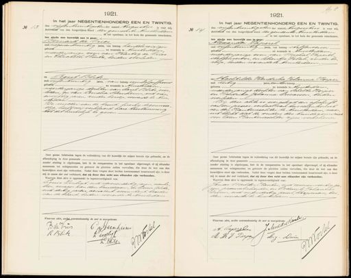 No 13 „ 1921. In het jaar NEGENTIENHONDERD EEN EN TWINTIG den vijfentwintigsten der vaand Augustus is voor mij Ambtenaar van den burgerlijken Stand . der gemeente Amsterdam in het openbaar, in het huis der gemeente verschenen, ten einde een huwelijk aan te gaan:C Bernard de Vries oud negenentwintig jaren, van beroep handelsreiziger geboren en wonende te Amsterdam, meerderjarige zoon van Hartog de Vries en Elisabeth Wurtz, beiden overleden. en Rozet Blits oud vijfentwintig jaren, van beroep winkeljuffrouw geboren en wonende te Amsterdam, meerderjarige, dochter van Saul Blits, over„ leden, en van Cornelia Sternheim, oud vier„ en vijftig jaren, zonder beroep, wonende te Am„ sterdam. De moeder van de bruid, hierbij tegenwoor„ „dig, heeft mij verklaard hare toestemming tot dit huwelijk te geven. Daar geene beletselen tegen de voltrekking van dit huwelijk ter mijner kennis zijn gebracht, en de afkondiging in deze gemeente zonder stuiting is afgeloopen, heb ik de comparanten in het openbaar afgevraagd, of zij elkander aannemen tot echtgenooten en getrouw de plichten zullen vervullen, die door de wet aan den huwelijken staat zijn verbonden. Nadat deze vragen door beiden toestemmend beantwoord zijn, is door mij in naam der wet verklaard, dat zij door den echt aan elkander zijn verbonden. Waarvan deze akte is opgemaakt in tegenwoordigheid van: Zouis zonligt, oud zevenendertig jaren, winke„ lier, zwager van den bruidegom, en Louis Blitz oud dertig jaren assistent.accountant, broeder van de bruid, beiden wonende te Amsterdam. Waarvan akte, welke overeenkomstig de wet is voorgelezen. B de Trus E enhem 6 No 14. AG 8 1921. In het jaar NEGENTIENHONDERD EEN EN TWINTIG. den vijfentwintigsten der maand Augustus is voor mij Ambtenaar van den burgerlijken stand der gemeente Amaterdam in het openbaar, in het huis der gemeente verschenen. ten einde een huwelijk aan te gaan: Slexander Paperel oud vijfentwintig jaren, van beroep stoffenverver geboren en wonende te Amaterdam, meerderjarige zoon van Michal Paperel, stoffenverver, en selientje Polak, zonder be roep, beiden wonende te Amsterdam,- en Machtilda Hendrika Johanna Korper oud dertig jaren, zonder beroep geboren en wonende te Amsterdam meerderjarige dochter van Schelte Korper en Hendrika Johanna Lucassen, beiden overleden. Bij deze akte is overgelegd een afschrift van een proces-verbaal van tusschenkomst van den Kantonrechter te Amsterdam, waar uit blijkt dat de ouders des bruidegomsniet voor dien Kantonrechter zijn verschenen. Daar geene beletselen tegen de voltrekking van dit huwelijk ter mijner kennis zijn gebracht, en de afkondiging in deze gemeente zonder stuiting is afgeloopen, heb ik de comparanten in het openbaar afgevraagd, of zij elkande aannemen tot echtgenooten en getrouw de plichten zullen vervullen, die door de wet aan den huwelijken staat zijn verbonden. Nadat deze vragen door beiden toestemmend beantwoord zijn, is door mij in naam der wet verklaard, dat zij door den echt aan elkander zijn verbonden. Waarvan deze akte is opgemaakt in tegenwoordigheid van: Jonas Mulder Kanter, oud zevenenveertig je ren, procuratiehouder, en Lodewijk Johannes Dium, oud vijfendertig jaren, koopman, bei den wonende te Amsterdam. Waarvan akte, welke overeenkomstig de wet is voorgelezen. Kanbo Waarvan akte, welke overeenkomstig de wet is voorgelezen. B de Trus C Heenhoum 6 K Kogelig R Blitz