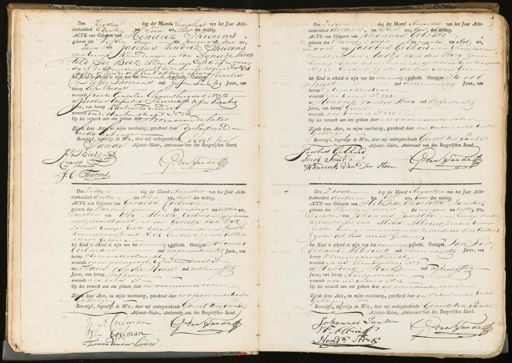 Den Zesden dag der Daand Augustus van het Jaar Acht- tienhonderd dertien t Tien ure, voor den middag. ACTE van Geboprte van Hendrik Thierens. „ geboren den vijfden dezer des morgens ten vier ure, zoon van Jacobus Hendrik Thierens van beroep Kruidenier en van Agnietje Mach „teld Ter Beek zonder beroep Echtelie de wonen „den op de prinsengracht bij de Looijersgraert N=o 634 Janton 51 zynde dit kind aldaar geboren het Kind ts erkend te zijn van het mannelik geslacht Getuigen Cornelis Piekershierins oud zesenTwintig Jaren, van 8 Beroep apothecar wonende roek Cingelen blaauwburgwal N. 312 en Jacobus Cornelis Thierenb eud vyf en Twintig Jken, van beroep kantoorbediende wonende in de Hartenstraat N 23 6 Op het verzoek aan ons gedaan doo voornoemde Vader Zijnte deze Acten na mijne voorlezing, geteekend door de Vader ende berde Getuigen Bevestigd, ingevolge de Wet, door mij ondergeteekend Gerrit ten Sande Adjunct-Maire, Ambtenaar van den Burgerlijken Stand. JA Bierenz 7 ƒ 10 ten Sande D J: Serens J: C: Puerens Den Zesden dag der Maand Augustus van het Jaar Acht- tienhonderd dertien ten Tien ure, voor, den middag. ACTE van Geboorte van Johannes Gebhard geboren den vierden dezer des wonds, ten Agt ure, zoon van Jacobus Gebhard, van beroep pakhuis knecht, en van Aaltje van den Berg zonder beroep Echte liden, wonende op schane by de raampoord N. 332. Canton 5 zynde dit kind aldaar Geboren het Kind is erkend te zijn van het mannelijk geslacht. Getuigen Jacob Smit. oud drieenveertig Jaren, van beroep Zylemakersbaas wonende als boven No 332. en Hendrik van der Steen oud Vyfenzestig Jaren, van beroep Geene wonende als boven No. 335. Op het verzoek aan ons gedaan door de voornoemde vader Zijnde deze Acte, na mijne voorlezing, geteekend door de vader ende beide Getuigen Bevestigd, ingevolge de Wet, door mij ondergeteekende Gerrit ten Sande Doo Adjunct-Maire, Ambtenaar van den Burgerlijken Stand. Jacobus Gebhard ten Sande Jacob Smit= Hendrrik Van Der Steen 1 9 Den Zesden dag der Maand Augustus van het Jaar Acht- tienhonderd dertien ten Tien ure, voor den middag. ACTE van Geboorte van Gerarda Coelman geboren den Vierden dezer des middags ten half twee ure, Dochter van Ybe Alrich Coelman van beroep metzelaarskhecht, en van Gerritje van Dyk zonder beroep, Echte lieden, wonende in de Verste laavierdwarsstraat N.o 54 Canton 5 zynde dit kind aldaar geboren.- het Kind is erkend te zijn van het vrouwelijk gelacht. Getuigen Johannes Coelman oud negenentwintig Jaren, van beroep kleremakersknecht wonende op de pricegragt 6y de ranstraat N.o en Frans van der Houw oud achtenvyftig Jaren, van beroep orfhever wonende als boven No Op het verzoek aan ons gedaan door de voornoemde vader. Zijne deze Acte, na mijne voorlezing, geteekend door de vader ende beide Getuigen Bevestigd, ingevolge de Wet, door mij ondergeteekende Gerrit ten Sande Adjunct-Maire, Ambtendar van den Burgerlijken Stand.. J A Coelman G ten Sande J: Edelman Frans vander houw Den Zesden dag der Maand Augustus van het Jaar Acht- tienhonderd dertien ten Elf ure, voor den middag. ACTE van Geboorte van Helena Charlotta Jansen geboren den Vierden dezer des morgens ten halftien ure Dochter van Johannes Jansen, van beroep winke bediende en van Alida Albrink zonder beroep Echte leden, wonende in de keizerstraat N. 13 Canton Zynde dit kind aldaar Gebonen het Kind is erkend te zijn van het vrouwelijk geslacht. Getuigen Jan Ker dinand Albrink oud Tweeendertig Jaren, van beroep kleremakersknecht wonende in de Elendigesteeg N. 3. Hendrik Hork oud agtenvyftig Jaren, van beroep Aanspreeker. wonende als de ouders N. 13 Op het verzoek aan ons gedaan door de voornoemde vader Zijnde deze Acte, na mijne voorlezing, geteekend door de vader ende beide Getuigen. Bevestigd, ingevolge de Wet, door mij ondergeteekende Gerrit ten Sande Adjunct-Maire, Ambtenaar van den Burgerlijken Stand. Johannes Ianzen ten San de 2 N Albrink Hend stork