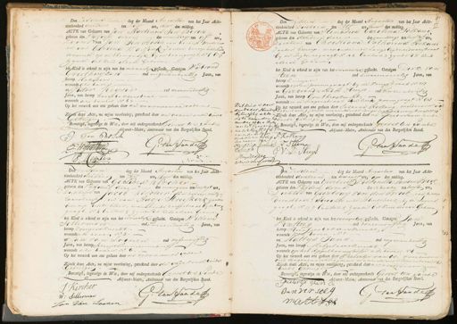 Den zesden dag der Maand Augustus van het Jaar Acht- dedhonded dertien in Elf ur, voor den viddeg 110 ACTE van Geboorte van Jan Hartinus Ten Bosch geboren den vijfden dezer des namiddags ten vif zoon van Jan Ten Bosch van beroep winkelier en van Gerdina Wassink zonder beroep Echtelieden wonende op de blomgragt by de boangragt N 6 C=5 Zynde dit kind aldaar geboren. het Kind is erkend te zijn van het mannelijk geslacht. Getuigen Wijbrand Griethuizen oud negenendertig Jaren, van Beroep Makelaar.. wonende als boven en Pieter Keijser oud vierendertig Jaren, van beroep broodbakkersbaas. wonende als boven No 63 Op het verzoek aan ons gedaan door de voornoemde vader Zijnde deze Acte, na mijne voorlezing, geteekend door de vader ende beide Getuigen.- Bevestigd, ingevolge de Wet, door mij ondergeteekende Eerrit ten Sande Adjunct-Maire, Ambtenaar van den Burgerlijken Stand. J: Ten Bosch ten Sande PW Griettan O /5 „ „„ Dit kindind den vader Hendrig Eyling bij akte. dato zevenden tyg cember 1800 & zestig voor het zijne erkend zie ErkReg No 1 fo6 voerende Retselve kind als nu videze den naam van Hendricp Carolina Eylingh Muydresper aanswelf Den zesden dag der Maand Augustus van het Jaar Acht- TRA tienhonderd Dertien ten Elf ure, voor den middag, ACTE van Geboorte van Hendrica Cardlina Joskand geboren den derden dezer des namiddags ten half vyf ure, Dochter van Christiana Catharina Toskand zonder beroep, wonende in de Langeleydschedwarsstraat by de Legdschegragt N. 104 Canton 3 zynde dit kind aldaar gekoren. het Kind is erkend te zijn van het vrouwelijk geslacht. Getuigen Dirk van oud Tweeenveertig Jaren, van steen beroep kruyer wonende op de princegragt by de kruysstraat N. 717 en Gerbrand van der Sluijs oud Tweeendertig Jaren, van beroep Gruttersknecht dis door wonende in de Loyerstraat zyn hoek princegragt No 637 De het verzoek aan ons gedaan door Susanna Rostang, vroedvrouw oo er Hendriktendertig jaren, wonende inde lange Leydsghed warsstraat N.o 37 bij akte en Zijnde deze Acte, na mijne voorlezing, geteekend door de vroedvrouweende ven den hpbeide getuigen 1800 & zestig zijneerfentig Bevestigs, ingevolge de Wet, door mij ondergeteekende Gerrit ten Sande zeg W 17b Adjunct-Maire, Ambtenaar van den Burgerlijken Stand. vetselve na Val de Je S. Rostang van P Cacolina D Stien. ten Sande 3 G V: D: Sluys ipt veh G Den zesden dag der Maand Augustus van het Jaar Acht- tienhonderd dertien ten Elf ure, voor den middag. ACTE van Geboorte van Gesina Kircher geboren den vijfden dezer des morgens ten halfagt ure, Dochter van Jacob Kirdher, van beroep metze laarskneeht, en van Hagje Streeskerk zonder beroep Echte leden, wonninde roopstraat by de baan„ gragt N 4 Canton 5 zynde dit kind aldaar geboren het Kind is erkend te zijn van het vrouwelijk geslacht. Getuigen Willem Setterman oud TweeendertigJaren, van beroep kruyjersknecht. wonende als boven N. 3. enJan van Loonen — oud vyfenvyftig Jaren, van beroep scheepsTimmenman. wonende als boven N. 6 Op het verzoek aan ons gedaan door de voornoemde voor Zijnde deze Acte, na mijne voorlezing, geteekend door de vader ende beede Getuigen. Bevestigd, ingevolge de Wet, door mij ondergeteekende Gerrit ten Sande Adjunct-Maire, Ambtenaar van den Burgerlijken Stand. I Kircher l ten Sande W: Selberman Jan Van Loonen Den zesden dag der Maand Augustus van het Jaar Acht- tienhonderd dertien ten twaalf ure, op den middag. ACPE van Geboorte van Geertrg Petronella van den Broek geboren den Vyfden dezer des Nachts ten half Een ure, Dochter van Geertruij van den Broek van beroep dienstbaar, wonende in de Blindehoek by de Loyers, gragt No 119 Canton 5 zynde dit kind aldaar Geboren het Kind is erkend te zijn van he vrouwelijk geslacht. Getuigen Jan Versteeg oud drieenviftig Jaren, van beroep steentjesbakkersknecht wonende als boven No. 7. en Mattijs Jans oud negenendertig Jaren, van beroep Metzelaarsknecht wonende op het Appelboomshofje als boven No 6 Op het verzoek aan ons gedaan door Pietertje van Os, vroedvrouw oud negenenveertig jaren, wonende inde oyjerstraat N, 68 Zijnde deze Acte, na mijne voorlezing, geteekend door de vroedvrouwende beide Getuigen Bevestigd, ingevolge de Wet, door mij ondergeteekende Gerrit ten Sande Adjunct-Mairs, Ambtenaar van den Burgerlijken Stant. Pretertje van O Jan Verstll ten San de mattes
