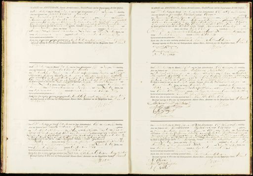 MAIRIE van AMSTERDAM, Eerste Arrondissement, Hoofd-Plaats van het Departement ZUIDERZEE. Den Eenen dertigsten dag der Maante December van het Jaar Achtienhonderd Elf ten Vergen ure, Voor demiddag Acte van Geboorte van Joseph Eliazer Heertje, geboren den Dertigsten dezer des Avonds ten zes uren, zoon van Eliater Marcus Johen, Heertje van beroep oude kleerkoper en van judith Coen raad van berroep kanten en Sinten verkoopster Echtzijden wonende Cop Marken bij Kolengang N 89 Canton Zinds dit kind aldaar geboren het Kind is erkend te zijn van het Manlijk geslacht. Getuigen Meier Simon Levigs oud oneer zestig Jaren, van beroep water verkopen wonende op Marken over de steenwerf N06 en Isauc Abraham Levie oud Tweeden zestig Jaren, van beroep ossendrijver wonende op Morkennaastie Kolengang 90 Op het verzoek aan ons gedaan door voornoemden Vader Zijnde deze Acte na mijne voorlezing geteekend door de Eerste Getuiden declarer en de zooweldeader medanie ve tuden niette kangen schriven Bevestigd ingevolge de Wet door mij Ondergeteekende Adjunct-Maire, Ambtenaar van den Burgerlijken Stand. A. Vereul Jeteu MAIRIE van AMSTERDAM, Eerste Arrondissement, Hoofd-Plaats van het Departement ZUIDERZEE. Den Eenen dertigsten dag der Maant December van het Jaar Achtienhonderd Elf ten Elf ure, Voor demiddag. Acte van Geboorte van Cornelis Wilhelmus Oomen, geboren den Negen en Twintigsten Deten des Morgens ten Zeven uren, zoon van Cornelis Oomen, van beroep Laken en stoffen winkelier en van Maria Elisa „beth van Ermingen zonder beroep Echtelieden wonende op tetoeken daldaar geboren by de wyde sombertsteeg N 69 Canton 1, zynde dit Kin het Kind is erkend te zijn van het Hanlijk geslacht. Getuigen Bernardus Groesen oud Dertig Jaren, van beroep winkelknegt wonende op de Looijersgragt N 2— en Bernardus Philipspus de Groot oud ZevenenTwintig Jaren, van beroep winkelknegt wonende op de Kolk N 41 Op het verzoek aan ons gedaan door voornoemden Vader Zijnde deze Acte na mijne voorlezing geteekend door den vader en de beide Getuigen Bevestigd ingevolge de Wet door mij Ondergeteekende Adjunct-Maire, Ambtenaar van den Burgerlijken Stand. A: Vereuz Cornelis Zemen Jelens Bernouduis Eversen B: P: de Groof Den Een en dertigsten dag der Maand December van het Jaar Achtienhonderd Elf ten Negen ure, Voor demiddag. Acte van Geboorte van Schoontje Eliater Reertje geboren den Dertigsten Dezer des Avonds ten quartaerte Juren , Dogter van Eliazer Marius Tohen Heertje Vanteropoude Kleerkoper en van Judilh Coenratad van beroep kanten en Sinten verkoper Echtesieden, wonende Oop marken bij Kollengang No9 Canton zijnde dit kind aldaar geboren het Kind is erkend te zin van het Vrokinlijk geslacht. Getuigen Meijer Simon Levie oud drie en zestig Jaren, van beroep Waterve rijper wonende op Marken over de Hteenwerf J Joben Saac Abraham Levie oudTweeen zestig Jaren, van beroep ossendrijver wonende op marken naast de Kolengang N90 Op het verzoek aan ons gedaan door den Vade Zijnde deze Acte na zijne voorlezing geteekend, door ten Eerste Getuigen de clazeren de zoowel de Een schrijven Vader als de tweede Getuigen wett Bevestigd ingevolge de Wet door mij Ondergeteekende Adjunct-Maire, Ambtenaar van den Burgerlijken Stand. A Vereud Ws Levio Varen Den Een en Dertigsten dag der Maand December van het Jaar Achtienhonderd Elf ten twaalf ure, op demiddag. Acte van Geboorte van Johannes Anthonij Kerkhof, geboren den Dertigsten dezer des Morgens ten half vier uren Loon van Adolph Hendrik Kerkhop van beroep geene en van Gesiena Jacoba Thönezon „den beroep EchteLieden, wonende op het Tingel bij de spiegelstraat N 422 Canton 4. Zynde dit, kind aldaar geboren het Kind is erkend te zijn van het hunlijk geslacht. Getuigen Carste Wilhelm Thöne oud Een en Twintig Jaren, van beroep Makelaar wonende op de boommarkt No 265 en Willem Decker Cornw: zoon oud Een en Twintig Jaren, van beroep Kantoorbediende wonende op de Hturceelenburgwal over de zen bartbrug Op het verzoek aan ons gedaan door voornoemden Vader Zijnde deze Acte na mijne voorlezing geteekend door den vader en de beide Getuigen Bevestigd ingevolge de Wet door mij Ondergeteekende Adjunct-Maire, Ambtenaar van den Burgerlijken Stand. H. Kereul Adolph Hend„r Kerkhotf Vero CH Son W Deeker cm Den Een en dertigste dag der Maand December van het Jaar Achtienhonderd Elf ten Tien ure, Voor demiddag. Acte van Geboorte van Annatje Aron Barend, geboren den Dertigstendezer des Avond ten half Negen uren, Dogter van zon Garend van beroep oude kleerkoper, en van Mariane Palemon zonder beroep Echtelieden wonende op Marken in de pietmostertgang 65 Canton zijnde dit, kind aldaar geboren het Kind (s erkend te zijn van het vrouwelik geslacht. Getuigen Joc Jarend oud Viftig Jaren, van beroep Groente kruijer wonende op Marken N 63 en Salomon Jacob oud zesendertig Jaren, van beroep Groente Kruijer wonende Op Marken N 54 Op het verzoek aan ons gedaan door voornoemden Vaar Zijnde deze Acte na mijne voorlezing geteekend door Noch vader of debeiden Getuigen alzog dezelve Mareren, niet teKr In schrijve Bevestigd ingevolge de Wet door mmij Ondergeteekende Adjunct-Maite, Ambtenaar van den Burgerlijken Stand J Verent 2 Bereus Den Een en dertigsten dag der Maand December van het Jaar Achtienhonderd Elf ten waalf uren Op demiddag. Acte van Geboorte van Hendrica Wilhelmina Olivier, geboren den Negen entwintigsten dezer des Morgens ten Elf uren, dogter van Nicolaas Olivier, van beroep Griffier van het vreden gerecht Cantonb en aan Wilhelmina Wendelina Jranger zonder benoep Echtelieden, wonende op de Haar „lemmerdyk bij de buyten orangestraat N 104 Canton 6 zynde dit kind aldaar geboren het Kind is erkend te zijn van het vrouwerlijk geslacht Getuigen Jan Ede Bosscher oud Tweeen zestig Jaren, van beroep kaarsenmaker wonende op de tegulurs bree straat N 34 en Jan Coenraad Notte oud Zevenendertig Jaren, van beroep Kantoorbediende wonende op Egenlantiengragt N 102 Op het verzoek aan ons gedaan door voornoemden Vader Zijnde deze Acte na mijne 