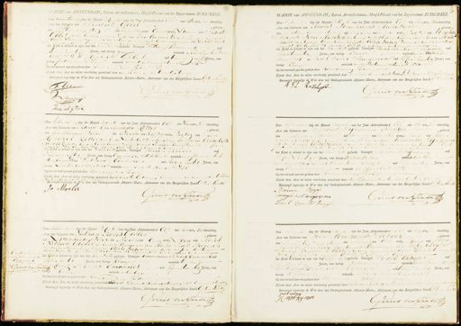 MAIRIE van AMSTERDAM, Eerste Arrondissement, Hoofd-Plaats van het Departement ZUIDERZEE Den Zeventienden dag der Maand december van het Jaar Achtienhonderd Elf ten half tweeure, na demiddag Acte van Geboorte van Fredrik Göbel, geboren den Vyftienden dezer des nademiddags ten Een uren, zoon van Fredrik Godel zonder beroep, en van Johanna Ouwerkerk zonder beroep Echte Lieden wonende op de Haarlemmerdijk bij de vischmarkt N 326 Canton A zijnde dit kind aldaar geboren het Kind is erkend te zyn van het manlijk geslacht. Getuigen Willem Sweezing oud Agten dertig Jaren, van beroep geene wonende op de Negenlantiers gragt N 17 en Hendrik Göbel oud twee en zeventig Jaren, van beroep pottenwinkelier wonende in de drie koningstraatNo 14 Op het verzoek aan ons gedaan door voornoemden Vader Zijnde deze Acte na mijne voorlezing geteekend door den vader en de twee Getuigen Bevestigd ingevolge de Wet door mij Ondergeteekende Adjunct-Maire, Ambtenaar van den Burgerlijken Stand. G ten Sanden C Gile Gerrit ten Sande Dm Sweezui Hendrik Gobel MAIRIE van AMSTERDAM, Eerste Arrondissement, Hoofd-Plaats van het Departement ZUIDERZEE. Den Agtienden dag der Maand December van het Jaar Achtienhonderd Elf ten Tien ure; voor demiddag. Acte van Geboorte van Rachel Abrahams Hazeliph, geboren den zestienden dezer des Nachts ten Drie uren, Dogter van Abraha Joseph Levie Hazelips van beroep oude klederen Koper en van Sara Abra ham van beroep Groente verkoopster Echte Lieden wonende op sode Stron markt, N 5 Canton N 1. zynde, dit kind aldaar geboren het Kind is erkend te zijn van het Vrouwlijk geslacht. Getuigen Benjamin Meijer Papegaij oud zesen twintig Jaren, van beroep kruyer wonende in de Batarier „straat N 7 en Jacob David Fransman oud Vyfen Twintig Jaren, van beroep Kruyer wonende in de Batavierstraat N 20 Op het verzoek aan ons gedaan door voornoemden Vader Zijnde deze Acte na mijne voorlezing geteekend door den vader kunnende de beiden Getuigen niet schrijven Bevestigd ingevolge de Wet door mij Ondergeteekende Adjunct-Maire, Ambtenaar van den Burgerlijken Stand. G ten Sand A JL Razelurt Gerrit ten Sande Den Agtienden dag der Maand December van het Jaar Achtienhonderd Elf ten Negen ure, voor demiddag. Acte van Geboorte van Maria Geertruijda Kötter, geboren den zeventienden dezer des Nachts ten halfdrie uren, Dogter van Jan Hendrik Kotter van beroep Zuikerbakkersknegt, en van Anna Elisabeth Sardiek, zonder beroep Echtelieden wonende in de Leidsche Kruisstraat by de prin „. segragt N 37 Canton N 3, zijnde dit kind aldaar gebooren het Kind is erkend te zijn van het vrowlijk geslacht. Getuigen Jurian Moelee oud Negenen vyftig Jaren, van beroep Opperman op ’t stadhuis wonende in de Minserhof steeg boven N 3en Willem Houtman oud vieren zestig Jaren, van beroep Zuikerbakkersknegt wonende over den declarant N 35 Op het verzoek aan ons gedaan door voornoemden Vader Zijnde deze Acte na mijne voorlezing geteekend door de Eerste Getuigen kunnende de vader en de tweede Getuigen niet schrijven Bevestigd ingevolge de Wet door mij Ondergeteekende Adjunct-Maire, Ambtenaar van den Burgerlijken Stand. G ten Sande J Moelee Gerrit ten Sande Den Agtienden dag der Maand December van het Jaar Achtienhonderd Elf ten Elf ure, voor demiddag. Acte van Geboorte van Meindert Wirsema Ruijgh, geboren den zestienden dezer des morgen ten half vier uren, zoon van Adri aan Ruijgs van beroep Touwinkilier en van Hendrika Weirsema zonder beroep, EchteLieden, wonende hoek Haarlemmer houtuynen en korte prinsegragt N 29 Canton N 4 zijnde dit kind aldaar geboren het Kind is erkend te zijn van het Manlijk geslacht. Getuigen Mijndert Wijrsema oud Vijfen zestig Jaren, van beroep touwinkelier wonende in de Haarlem merhouturynen7 en Jacob Cornelis Ruygh oud vijfendertig Jaren, van beroep Convoijloper wonende op droogbak N15. Op het verzoek aan ons gedaan door voornoemden vader Zijnde deze Acte na mijne voorlezing geteekend door den Vader en de beiden Getuigen Bevestigd ingevolge de Wet door mij Ondergeteekende Adjunct-Maire, Ambtenaar van den Burgerlijken Stand. G ten Sande Adriaan Ruijgh meyndert woyrennia Gerrit ten Sande Jacob Cornelis Ruijgh Goedgekeurd ver. de door haling Emanuel Gerrit ten Sandig Den Agtienden dag der Maand December van het Jaar Achtienhonderd Elf ten Tien ure, Voor demiddag. Acte van Geboorte van Nathan Moses Gosler, geboren den Zeventienden dezer des Nachts ten Een uren, zoon van Moses Nathan Gosier van beroep kruijer en van Matje Isak Barens van beroep Groen te verkoopster EchteLieden wonende in de Jode Houtuynen bij de rapenburger straatN 4 Canton N 1. zijnde dit kind aldaar geboren het Kind is erkend te zyn van het Manlijk geslacht. Getuigen Emanuet Jacob Emanuel oud Agten dertig Jaren, van beroep Kkruyer wonende ten huize van een declarant en Joseph Emanull oud Negenen twintig Jaren, van inde berbep kruyer wonende als boven Op het verzoek aan ons gedaan door voornoemden Vader Zijnde deze Acte na mijne voorlezing geteekend Alsoo de Vader en de beiden getuigen niet kunnen schryven Bevestigd ingevolge de Wet door mij Ondergeteekende Adjunct-Maire, Ambtenaar van den Burgerlijken Stand. Gt ten Sande Gerrit ten Sande Den Fotrende dag der Maand december van het Jaar Achtienhonderd Elf ten Ees ure voor demiddag. Acte van Geboorte van Lion Abraham de Priebver, geboren den zeventienden dezer des Morgen ten Elf uren, zoon van Abra ham de Vrieboer van beroep Koopman en van Betje ELiazer van beroep Koopvrouw EchteLieden, wonende op de Sode Stroomarkt No 20 Canton N 1. zynde dit kind aldaar geboren het Kind is erkend te zijn van het Manlijk geslacht. Getuigen Jacob Catsjon oud Dertig Jaren, van beroep Koopman wonende in de Verwerstraat bijdestaalstraaten Simon yman oud tweeendertig Jaren, van beroep Koopman wonenden de Lange houtstraat No 8 Op het verzoek aan ons gedaan door voornoemden Vader Zijnde deze Acte na mijne voorlezing geteekend door de beide Getuigen kunnende de vader met schrijven Bevestigd ingevolge de Wet door mij Ondergeteeke