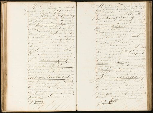 Cende den Htoventiasten Novembe gttien Houderd en Elf des Nademet dags ten half Twee uuren Verscheen vooren Willem HendrikVoombergh Adrieurs Maire der Stad Husterdam als Ambtenaar van den Burgerlijken Staad Cornelis Vermeulen, wonende iide roose straat bij de Pruuicegragt N:o 174. Cauton N:o 5. van beroepboter kopers kisecht, geadsisteerd door Twee getuigen de renste Dirk Grevenkoud vier en Veertig Jaren wonende agter den declarant van beroep Kleiemakers kuicht, de dwede Adrianus Veruisen len oud Tweeen zestig Jaren, wonende in de zoze straat by de Eeiste divis straat No 44. van beroep Aanspreeker, dewelke mig verklaard heeft dat zyne Vrouwe Alida van Clelf woo¬ monde ter zynien Heligen, Londer beroep, op den Negentienden dezer des Stunoigen ter Ttien uuren is bevallen van Een Dochter aan de welke de voornaam gezeven is van Helena Adriana Inie volge bovenstaande derklaring en op het Verzoek van voornoemde vaderhel ik deze Actegesteld de welke de voormelde vader ende Twee getuigen na myne voorlezing uAturij hebben geteekend. H vermeelen WHvoombergd Durk Grevint A. Vvermeulen H: Eeden den Twintigsten Novembe ber Agttien Honderd en Elf des Nade middags quart voor Twee uuren Verscheen vooring WillemHen drik Voombergh Adjuait Mai re der Stad Arusterdam als Ambte naar van den Burgerlijken staad Cornelis Wissingh, wonende op de zeedijk by het holk buiggetje N 80 Caiston N:o 2. van beroep huijers Baas, geadsisteerd door Tedeegitui gende Eerste Willem Botoud Een enzeventig Jaren wonende op het Neere Iland by de Haarlem urespoort No 422 van beroep scheeps Timmernan, deT weede Jan Brou wer oud vier en vyftig Jaren, wonen de aan de Slijp steeuen No 19 van be „roep Kruyers Baas, dewelke un Verklaard heeft dat zyne nieuwe Willemina Bot wonende ten zijnen huizen, zouder beroep, op den Negentienden dezer des Nuchts den half drie luizen is bevallen van Een zoon, aan dewelke de voornaam gerevenis van Abram. Inge volge bovenstaande Verklaringen op het verzoek van voornoemden vader heb ik deze Acte gesteld, dewelke de voormelde Twee getui „gen na mijne voorlezingg uir hebben getekend, declarenende de Vader niet te kinnen schrijven we Rot Wrroombergh J: Brouwer