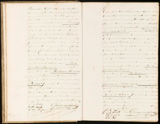 P Schoel Gerrit ten Sande P: F. Vergk C Van Campen Heden den Agste November Agtkenhon derd en Elf des voordemiddags quart voor Elf uuren verscheen voor mij Gerrit ten Sande Adjunct Maire der stad Amsterdam als Amb tenaar van den Burgerlijke stand Christiaan Bernhard Finet, wonende, in het oollofspoortn No 6. Canton No. 2 van beroep schoenmaakers baas Geadsisteerd door twee Getuigende Eerste Burghout Weyjers, oud twee en vyftig Jaren wonende op de Elandsgragt bij de princeugwagt No. 113 van beroep Timmermansbaas de tweede Paniel de Beloud zes en twintig Jaren wo¬ nende op de zeodyk en koek van de Kolk No 62 van beroep schoemmakersbaas, dewelke mi verklaard heeft dat zijnne vrouw, Hilker Catharina Weyjers, wonende ten zyne huize zander beroep op den Vyfde dezer des avord ten Elf uuren is bevallen van Eene Dochter pande welke de voornaam gezeven is van Christina Bernhard, en op denzelfde avonds mede is bevallen ten half twaalf uuren van Een zoon aan de voornaam gegeven is van Hendrik Tobias, Ingevolge bovenstaand verklaring en op het verzoek van voornoemd Vader heb ik deze acte gesteld, welke de voormeld Vader ende twee Getuigen na myne voorleezin net my hebben Geteekend. C: B: Finst Gerrit ten Sardeg B: Wegers D: D: Bel