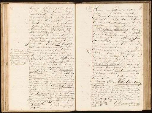 Dit kindie gewettigd bij Huwelyk, Poltrokken al hier den Twee en twintig sten, September Achttien honderd Veertien. G: ten Sande Heden den Vyftienden October Agtien „honderd Elf des Voordemiddags quart, over twaalf uuren verscheen voor mij Gerritten Sande AajunAt Maire der Stad Amsterdam als Ambtenaar van den burgerlijken „stand Catharina Pieron Huisvrouw van Willem Nadro oud Vijftig saren, wonende in de kalverstraat naas t gebooms „Kerk N 134. van beroep Voed vrouw, geadsisteerd door twee getuigen de Eerste Hendrik Houtap pel, oud Achten Twintig saken g wonende in de betanjk Dwarsstraat N3. van beroep Schoorsteen veeger de tweede Jan er Ravelli on Zes en Veertig Jaren wonende in de Kalverstraat naast de boomskerk N 139. van beroep schoorsteenveeger, dewelke my verklaard heeft dat Johanna van Luijf, wonende in de Wapen ondelftsteeg op den Amstet N15 Canton N 3. zonder beroep, op den dertienden dezer des avondsten ugt uuren, is bevallen, van een zoon In volgens opgave van de Vroedvrouw ten dezen te boek moet gesteld wor „den als vader Christoffel Bijle veld, wonende mede op den Amstel boven N 15. van beroep kruier zijnde aan het kind den naam gegeven van Hendrik Ingevolge bovenstaan „staande verklaring en op het verzoek van voornoemde vroedvrouw heb ik deze acte gesteld welke de voormelde vroedvrouwende TTwee getuigen na myne voorlezing met my Hbber getekeld P Bvv Ly Gerrit ten Sande A: Houtafhel Jan Bavellig Eeden den Vyftienden October achtienhondert Elf des middags jaart voor Een uur, verscheen voor my Gerzit ten Sande, Hapnit Maire der stad Amsterdam als Ambte, „naar van den Burgerlyken stand Philippus Joannes Martz wonende in de Copynenstraat N 25, lanton N 4. zonder beroep geadsisteerd door twee getuigen de Eerste Casper Martz oud Negenen Zeventig Jaren wonende inde Regulierstwarstraat by de Vyselstraat N„ van beroep Oudyzerkoper de twede Bernardus Vak oud Zeven en Vijftig Jaren wonen Ee in de baafjesteeg N 6. van beroep Kantoorloper dewelke my verklaard heeft dat zijne vrouwe Elisabeth Alida BBarens wonende ten zynen huize zonder beroep Op den Veertienden dezer des morgens ten zeven uuren is bevallen van een Dogter aan de welke de Voornaam gegeven is van Anna Elisabeth Geertrui Ingevolge bovenstaande verklarns en op het verzoek van voornoemden vader heb ik deze acte gesteld welke de voormelde vader en de tweede getuigen namine voorlezing met mij hebben getekend. declarerende de Eerste getuigen niet te kunnen schrijven C J Hartz Gerrit ten Sande B= Nak