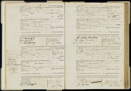 Den Achttienden Maart Ao. 1800 Drie en-Twintig, ten Elf ure, voor den middag, is ingeschreven, de GEBOORTE van JElsje Witte Geboren den veertienden dezer des middags ten vier ure, van Beroep Dochter en van Elsje Witte wonende iolette straat No. 4 Kanton 6 zijnde dit Kind aldaar geboren, en erkend van hetvrouwelijk geslacht. Eerste Getuige Willem Munter oud negenenveertig Jaren, wonende Boomstraat No 30 Beroep baardscheer der Tweede Getuige Jacob Hartgering oud tweeendertig Jaren, wonende angelield gracht No 2 Beroep scnoepmakersknecht volgens verzoek aan ons gedaan, door Anna Munter, vroedvrouw wonende boousstvaat No 30 Na voorlezing is deze Acte door de vroedvrouwe Getuigen geteekend, en wordt ingevolge de Wet bevestigd, door mij, als Lid van den Raad dezer Stad, daartoe ingevolge het Besluit van Z. M. van 14 Febr. 1823, No. 59, gedelegeerd. A Wrndr Arm munter Buner J: Hartgering de JBE Den Achttienden Maart Ao. 1800 Drie-en-Twintig, ten Elf ure, voor den middag, is ingeschreven, de GE BOORTE van Grietje van den Berg Geboren den zestienden dezer des nachts ten Een ure Dochter van Nicolaas van den Berg Beroep jouwer en van Hermina Elisabeth Schindelaar Echtelieden wonende kleine kattenburgerstraat No. 178 Kanton 2. zijnde dit Kind aldaar geboren, en erkend van het vrouwelijk geslacht. Eerste Getuige Seerdinand vam den Berg oud Eenendertig Jaren, wonende Laagte van kadijk N 92 Beroep moddenman Tweede Getuige Nicolaas van den Berg. oud vijfenzestig Jaren, wonende als boven Beroep sjiuwer volgens verzoek aan ons gedaan, door den vader Na voorlezing is deze Acte doorden vader en Getuigen geteekend, en wordt ingevolge de Wet bevestigd, door mij, als Lid van den Raad dezer Stad, daartoe ingevolge het Besluit van Z. M. van 14 Febr. 1823, No. 59, gedelegeerd. N:o van den berg J van der berg BKiner N Voerg de Sint Goedgekeurd de doorhaling van Stephanus en de bovenstelling Josephud J J Entracs HDanids P: J: v. Stlingen 19. 74 W: Ster Je. Vz Den Achttien Maart Ao. 1800 Drie en Twintig ten Elf ure, voor den middag, is ingeschreven, de GEBOORTE van Maria Elisabeth Entwes Geboren den zestienden dezer des vorgens Laphus ten Acht ure, Dochter van JJoannes Steprans vantwes Beroep varkenslagter en van Maria Elisabeth Huster, Echtelieder wonende Goudsbloemstraat No 23 Kanton 6 zijnde dit Kind aldaar geboren, en erkend van het vrouwelijk geslacht Eerste Getuige Hendrik Davids noud veertig Jaren, wonende korte niezel No 6 Beroep sjouwer Tweede Getuige Petrus Johannes van Solingen oud negenendertig Jaren, wonende goudsbl: straat No 23 volgens verzoek aan ons Beroep Zeeman. gedaan, door den vader Na voorlezing is deze Acte door den vader en Getuigen geteekend, en wordt ingevolge de Wet bevestigd, door mij, als Lid van den Raad dezer Stad, daartoe ingevolge het Besluit van Z. M. van 14 Febr. 1823, No. 59, gedelegeerd. J: J: Entwes JC David. PBmer P: J: V: Solingen de IH Den Achttienden Maart Ao. 1800 Drie en-Twintig ten Elfe ure, voor den middag, is ingeschreven, de GEBOORTE van Jan Klabou Geboren den vijftienden dezer des middags ten zes ure, zoone van Jan Klabdu van Beroep geen en van Elisabeth van der Haar, Echtelieden wonende Noorderdwarsstraat No. 12 Kanton 3 zijnde dit Kind aldaar geboren, en erkend van het maunelijk geslacht. Eerste Getuige Jacob van de Grampel Junior oud negenendertig Jaren, wonende No Zachterburgwal. Beroep geen Tweede Getuige Gyjsbert Piloo oud tweeenveertig Jaren, wonende P Jacobstraat N 23 volgens verzoek aan ons Beroep gee gedaan, door den vader Na voorlezing is deze Acte door den vaderen Getuigen geteekend, en wordt ingevolge de Wet bevestigd, door mij, als Lid van den Raad dezer Stad, daartoe ingevolge het Befluit van Z. M. van 14 Febr. 1823, No. 59, gedelegeerd. J: Klabou J den de Guimzeljro C Boner G. Biloo de Een