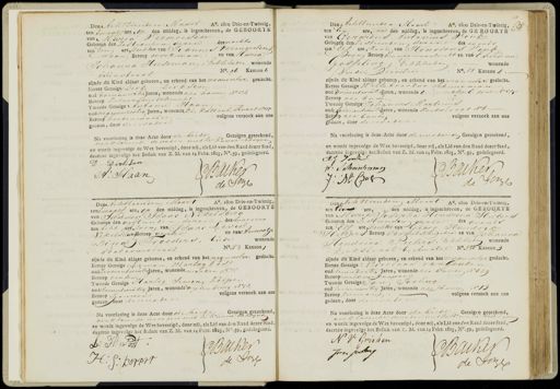 Den Achttienden Maart Ao. 1800 Drie-en-Twintig, ten twaalfure, op den middag, is ingeschreven, de GEBOORTE van Maria Vermoesen Geboren den zestienden dezer des nachts ten Een ure, Dochter van Joannes vermoesen Ovan Beroep werkman en vanMaria Johanna Heeseman, Echtelieden wonende tuinstraat No. 96 Kanton 6 zijnde dit Kind aldaar geboren, en erkend van het vrouwelijk geslacht. Eerste Getuige Dirk Dirksen oud drieenveertig Jaren, wonende als boven No 124 Beroep zilversmidsknecht Tweede Getuige Antonie Haar oud negenenzestig Jaren, wonende kl: Kkattenb: straat No 177 volgens verzoek aan ons Beroep hoedenhakers. gedaan, door denvader Na voorlezing is deze Acte door de beide Getuigen geteekend verklarende de vader niet te kunne schryven en wordt ingevolge de Wet bevestigd, door mij, als Lid van den Raad dezer Stad daartoe ingevolge het Besluit van Z. M. van 14 Febr. 1823, No. 59, gedelegeerd. D. Dirksen C Backer A: Slaan de P Den Achttienden Maart Ao. 1800 Drie-en-Twintig, ten Een ure, na den middag, is ingeschreven, de GE BOORTE van Gerardus Antonius Vonk Geboren den zestienden dezer des avonds ten ilf ure, zoon van Henricus Vonk van Beroep timmermansknecht en van Eberdina Gosseling Echtlieden wonende DerdeBloosten No. 28 Kanton 4. zijnde dit Kind aldaar geboren, en erkend van het mannelijk geslacht. Eerste Getuige Willebrordus Schuurman oud drieentwintig Jaren, wonende o: L: achterb: wal N 175 Beroep als boder Tweede Getuige Johannes Martinus oud zevenentwintig Jaren, wonende kerkstraat No 8 Beranp als boven volgens verzoek aan ons gedaan, door denvader Na voorlezing is deze Acte door den vader en Getuigen geteekend, en wordt ingevolge de Wet bevestigd, door mij, als Lid van den Raad dezer Stad, daartoe ingevolge het Besluit van Z. M. van 14 Febr. 1823, No. 59, gedelegeerd. A: Voort W: Schnutman CBouner J: M: Crue de Poryer Den Achttiende Maart Ao. 1800 Drie en Twintig tentwaalf ure, op den middag, is ingeschreven, de GEBOORTE van Sander Isaac Nikelsberg Geboren den viftienden dezer des morgens ten Acht ure, zoon van Isaac Leviel Nikelsberrgberoep venter en van Annaatje Dina Brroeders, beide wonende Batavierstraat No. 83 Kanton, zijnde dit Kind aldaar geboren, en erkend van het mannelijk geslacht Eerste Getuige Leman Hartog Oost oud zevenentwintig Jaren, wonende marken N 15 Beroep venter Tweede Getuige Hartig Simon Korper ouddrieentwintig Jaren, wonende uilenburg No 52 volgens verzoek aan ons Beroep souwer gebaar door den vader Na voorlezing is deze Acte door de beide Getuigen geteekend, verklarende de vader niet te kunne schryven en wordt ingevolge de Wet bevestigd, door mij, als Lid van den Raad dezer Stad. daartoe ingevolge het Besluit van Z. M. van 14 Febr. 1823, No. 59, gedelegeerd. L: H: Post C Baeker de I H: J: Lorrt Den achttienden Maart Ao. 1800 Diie-en-Twintig, ten Een ure, den middag, is ingeschreven, de GEBOORTE van Maria Josepha Hendrina Sluters Geboren den zestienden dezer des avonds ten Elf ure, Dochter van Georg Hendrik seuters Beroep Baardscheerder en van Johanna Hendrina Pieters, Echtelieden wonende, koekstraat by Amstel No 550 Kanton 3 zijnde dit Kind aldaar geboren, en erkend van het vrouwelijk geslacht. Eerste Getuige Sicolaas van Grieken oud Eenendertig Jaren, wonende als boven N 429 Beroep melk verkooper Tweede Getuige Jan Pooling oud Eenenveertig Jaren, wonende als boven No 13 Beroep zeeman volgens verzoek aan ons gedaan, door den vader Na voorlezing is deze Acte door de beide Getuigen geteekend, verklarende de vader niet te kunne schriven en wordt ingevolge de Wet bevestigd, door mij, als Lid van den Raad dezer Stad, daartoe ingevolge het Befuit van Z. M. van 14 Febr. 1823, No. 59, gedelegeerd. N V Grieken Barker Jen Jodeng de Iink