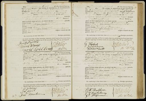 Den Twintigsten Maart Ao. 1800 Drie-en-Twintig, ten twaalf ure, op den middag, is ingeschreven, de GEBOORIE van Catharina Cornelia Meijerink Geboren den zeventienden dezer des middags ten zes ure Dochter van Roelof Meijerink Ovan Beroep sleepersknecht en van Jan „netje wegewis, Echtelieden wonende Dasseerderstraat No. 67 Kanton 3 zijnde dit Kind aldaar geboren, en erkend van het vrouwelijk geslacht. Eerste Getuige Hendrik Wegewijs oud negenenvyftig Jaren, wonende stroomarkt No 10 Beroep visch verkooper Tweede Getuige Karel Willems oud tweeentwintig Jaren, wonende passeerder dwr straat No 2 volgens verzoek aan ons Beroep stratenmaker. gedaan, door den vader Na voorlezing is deze Acte door den vader en Getuigen geteekend, en wordt ingevolge de Wet bevestigd, door mij, als Lid van den Raad dezer Stad, daartoe ingevolge het Besluit van Z. M. van 14 Febr. 1823, No. 59, gedelegeerd. Root of H agerint CBaiker Hendrik Wegewijs de Ine JAllemas Den Twintigsten Maart Ao. 1800 Drie-en-Twintig, tenEcn ure, na, den middag, is ingeschreven, de GE BOORTEC van Gerardus Josephus Herbers Geboren den negentienden dezer des Wachts ten twee ure, zoon van GerritHterbers O van Beroep stoelenmakersknecht van Anna Maria Elisabeth Permeulen, achtelie wonende den vetboogstraat No. 30 Kanton 4 zijnde dit Kind aldaar geboren, en erkend van het manselijk geslacht. Eerste Getuige Johannes Schoonhoo oud dertig Jaren, wonende hare straat No 48 Beroep als boven. Tweede Getuige Jacobus Deeman oud negenendertiJaren, wonende als de ouders Beroep knuyer volgens verzoek aan ons gedaan, door den vader Na voorlezing is deze Acte door den vader en Getuigen geteekend. en wordt ingevolge de Wet bevestigd, door mij, als Lid van den Raad dezer Stad, daartoe ingevolgd het Besluit van Z. M. van 14 Febr. 1823, No. 59, gedelegeerd. 6 J: Herbers Barker Ja Cobus Dieman de IB Schoot hooft H Den Twintigsten Maart Ao. 1800 Drie-en-Twintig, ten twaalf ure, op den middag, is ingeschreven, de GEBOORTE van Jacob Rensen Jacobsen Geboren den zeventienden dezer des aoonds ten zeven ure, zoon van Rens Jacobsen van Beroep zeeman en van Elisa „beth Laufkötter, Echtelieden wonende Groothemelvijk No. 1 Kanton 4 zijnde dit Kind, aldaar geboren, en erkend van het mannelijk geslacht. Eerste Getuige Jan Casper Engel oud Eenendertig Jaren, wonende als boven N 6 Beroep behangers kwecht. Tweede Getuige Johannes Koppelman oud vijfendertig Jaren, wonende vooenstraat No 88 volgens verzoek aan ens Beroep geen gedaan, door den vader Na voorlezing is deze Acte door den vader en Getuigen geteekend, en wordt ingevolge de Wet bevestigd, door mij, als Lid van den Raad dezer Stad, daartoe ingevolge het Besluit van Z. M. van 14 Febr. 1823, No. 59, gedelegeerd. F JaCobsing 95 IGC Backer „ Joh: Koppelman de We Den wintigsten Maart Ao. 1800 Drie-en-Twintig, tenEen ure na den middag, is ingeschreven, de GEBOORTE van Georg Fredrik Bartelsman Geboren den negentienden dezer des avondi ten zeven ure, zoon van Gerhard Fredrik Partelsman Beroep timmermansknochten van Wilhel „mina Frederica Dikkentman, Echte wonende leeden Egelantiersgracht No. 93 Kanton 5 zijnde dit Kind aldaar geboren, en erkend van het mannelijk geslacht. Eerste Getuige Georg Fredrik Bartelsman, oud vierenvijftig Jaren, wonende als boven No 90 Beroep klstemmaker Tweede Getuige Gerrit Heyjdeman oud drieenviftig Jaren, wonende als boven Beroep kolfballenmaker volgens verzoek aan ons gedaan, door den vader Na voorlezing is deze Acte doorden vader en Getuigen geteekend, en wordt ingevolge de Wet bevestigd, door mij, als Lid van den Raad dezer Stad, daartde ingevolge het Befuit van Z. M. van 14 Febr. 1823, No. 59, gedelegeerd. F: F Bartelsman. W Stes Bartalsmay G=t Heijdemen de Iore