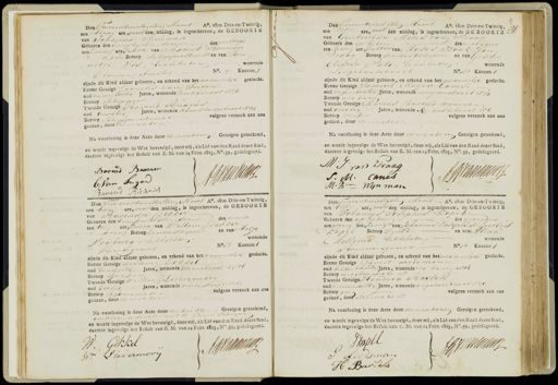 Den Tweeentwintigsten Maart A. 1800 Drie-en-Twintig, ten tien ure, voor den middag, is ingeschreven, de GEBOORTE van Johanna Beumer Geboren den twintigsten dezer des middags ten twaalf ure Dochter van Barent Beumer van Beroep schijppersknecht en van Jan nitje Vis, Echtelieden wonende Binnen Amstel No. 5 Kanton 3 zijnde dit Kind aldaar geboren, en erkend van het vrouwelijk geslacht Eerste Getuige Cornelis van Ingen oud vierendertig Jaren, wonende Kerkstraat No 36 Beroep schipper Tweede Getuige Barend Ruarus oud veertig Jaren, wonende Utrechtschestraat No 48 volgens verzoek aan ons Beroep schippersknecht gedaan, door den vader Na voorlezing is deze Acte door den vader en Getuigen geteekend, en wordt ingevolge de Wet bevestigd, door mij, als Lid van den Raad dezer Stad, daartoe ingevolge het Besluit van Z. M. van 14 Febr. 1823, No. 59, gedelegeerd. Burend Beumer A: van aans C: Van Sngen Den Tweeen twintigsten Maart Ao. 1800 Drie-en-Twintig, ten Elf ure, voor den middag, is ingeschreven, de GE BOORTE E van Geertruida Mozes van Fraag Geboren den op heden des morgens ten zeven ure, Dochter van Moses Izaak van Braag Beroep diamantsleiper en van Grietje Eliazer Pato. Echtelieden wonende Langehoutstraat No. 41 Kanton 1 zijnde dit Kind aldaar geboren, en erkend van het vrouwelijk geslacht. Eerste Getuige Samuel Meijer Canes. oud vijfendertig Jaren, wonende muijderstraat No 30 Beroep als boven Tweede Getuige Marius Barend wijnman oud veertig Jaren, wonende S houtstraat No 6 Beroep venker volgens verzoek aan ons gedaan, door den vader. Na voorlezing is deze Acte door den vader en Getuigen geteekend, en wordt ingevolge de Wet bevestigd, door mij, als Lid van den Raad dezer Stad, daartoe ingevolge het Besluit van Z. M. van 14 Febr. 1823, No. 59, gedelegeerd. M: J. van Traad Joo S. M. Cones M: B: Wyn man Den Tweeentwintigsten Maart A. 1800 Drie-en-Twintig, ten tien ure, voor den middag, is ingeschreven, de GEBOORTE van Barendje /Dekker. Geboren den Eenentwintigsten dezer des avonds ten tien ure, Dochter van Willem Dekker Ovan Beroep scharenslijver en van Matje wonende Vrijburg, Echtelieden.— Dinoegracht No 13 Kanton 6 zijnde dit Kind aldaar geboren, en erkend van het vrouwelijk geslacht. Eerste Getuige Willem Gokkel. oud Eenendertig Jaren, wonende Blomstraat No 106 Beroep sjousver Tweede Getuige Willem Liedermooy oud dertig Jaren, wonende vinke straat No 169 volgens verzoek aan ons Beroep sigarenmaker gedaan, door denvader Na voorlezing is deze Acte door de beide Getuigen geteekend, verklarende de vader niet te kunne schryven en wordt ingevolge de Wet bevestigd, door mij, als Lid van den Raad dezer Stad, daartoe ingevolge het Besluit van Z. M. van 14 Febr. 1823, No. 59, gedelegeerd. W: Gokkel A Vahn Wm Liedermooy Den Tweeentwintigsten Maart- Ao. 1800 Drie en-Twintig, ten Elf ure, voor den middag, is ingeschreven, de GEBOORTE van Johannes Josephus Kaper Geboren dan op heden des morgens ten negen ure, zoon van Johannes Iosephus Jacobus Kapel Beroep smid en van Alida Mellema, Echtelieden.— wonende Brouwersgracht No 16 Kanton 6 zijnde dit Kind aldaar geboren, en erkend van het mannelijk geslacht Eerste Getuige Gernit Leydsman oud achtentwintig Jaren, wonende als boven No 14 Beroep masten make Tweede Getuige Hendrik Bartels oud tweeenveertig Jaren, wonende angelierstraat N volgens verzoek aan ons Beroep geen gedaan, door den vader Na voorlezing is deze Acte door den vader en Getuigen geteekend, en wordt ingevolge de Wet bevestigd, door mij, als Lid van den Raad dezer Stad, daartoe ingevolge het Befuit van Z. M. van 14 Febr. 1823, No. 59, gedelegeerd. JJpl JC Jonma P Leussman H Bartels