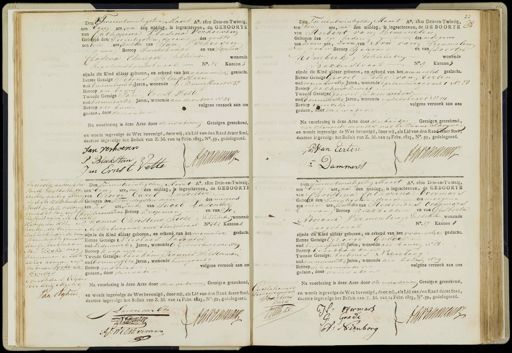 Den ETweeentwintigsten Maart Ao. 1800 Drie- en-Twintig ten Een ure, na den middag, is ingeschreven, de GEBOORTE van Catharina Klasina verhoeven. Geboren den Twintigsten dezer des nachts ten drie ure, Dochter van Jan Verhoeven Ovan Beroep Smedsknecht en van Sophia Clasina Ehenger, Echtelieden wonende Reguliersbreedstraat No. 35 Kanton 3 zijnde dit Kind aldaar geboren, en erkend van het vrouwelijk geslacht. Eerste Getuige Petrus Bleekstein oud tweeentwintig Jaren, wonende L: Kruisstraat N 37 Beroep als boven. Tweede Getuige Jan Ernst Vette oud tweeendertig Jaren, wonende als de ouders No 35 volgens verzoek aan ons Beroep als boven gedaan, door den vader Na voorlezing is deze Acte door den vader en Getuigen geteekend, en wordt ingevolge de Wet bevestigd, door mij, als Lid van den Raad dezer Stad daartoe ingevolge het Besluit van Z. M. van 14 Febr. 1823, No. 59, gedelegeerd. Jan verhoeven Aansne P Bleekstan a Ernst Vette Den Tweeëntwintigsten Maart Ao. 1800 Drie-en-Twintig, ten Een ure, na den middag, is ingeschreven, de GE BOORTE A van Hubert van Bemmelen Geboren den op heden des mesgens ten zeven ure, zoon van Arie van Bemmelen van Beroep jouwer en van Doortje Kembeek, Echtelieden wonende Bakkerstraat No. 9 Kanton 3 zijnde dit Kind aldaar geboren, en erkend van het mannelijk geslacht. Eerste Getuige Gerrit Peter van Eerten oud negenendertig Jaren, wonende Egelantiersgracht No. 78 Beroep pakhuisknecht Tweede Getuige Gerrit Dammers oud drieendertig Jaren, wonende vizelstraat No 11. volgens verzoek aan ons Beroep minkelijer gedaan, door den wader Na voorlezing is deze Acte door de beide Getuigen geteekend, verklarende de vader niet te kunne schryven en wordt ingevolge de Wet bevestigd, door mij, als Lid van den Raad dezer Stad, daartoe ingevolge het Besluit van Z. M. van 14 Febr. 1823, No. 59, gedelegeerd. JP van Eerten Jb vanma Sammers Ingevolge autoresalie van de Regtbank van centen aanleg alhier in dato vEschtenberel Wordt by deze meldeng gemaakt van een Cht Ve Augustus 1832. in„ Besluit van L M &dla houden de vergunning dat het kind in de neven staande akte vermeld den geslacttnaam. van Kocke mog aannemen en zech; alzoo noemen en teekenen vocke La„ zonder Amstding October 1800 drie en dertig. Van Eegten Den Tweeentwintigsten Maart A. 1800 Drie-en-Twintig ten Een ure, na den middag, is ingeschreven, de GEBOORTE vvan George, Carel Zasonder Geboren den Twintigsten dezer des morgens ten zes ure, zoon van Jacob Lasonder hristiaans zoon Beroep koopman en van Jo hanna Christina Kocke, Echtelieden wonende rato Achterburgwal over bloedstraat No 165 Kanton 2 zijnde dit Kind aldaar geboren, en erkend van het mannelijk geslacht Eerste Getuige Niidiaas Lasonder oud zesenveertig Jaren, wonende O: Z: voorburgwal No 79 Beroep koopman Tweede Getuige Abraham Joannes Wilsterman oud drieenvijftig Jaren, wonende heere gracht volgens verzoek aan om Beroep makelaars gedaan, door den vader Na voorlezing is deze Acte door den vader en Getuigen geteekend en wordt ingevolge de Wet bevestigd, door mij, als Lid van den Raad dezer Stad, daartoe ingevolge het Besluit van Z. M. van 14 Febr. 1823, No. 59, gedelegeerd. Laron der Oks AVMman JPamer A: J: Wilsterman Gerelakenerd door ons op dato Barbiers ia lerk J D Den imeeen twintigsten Maart Ao. 1800 Drie-en-Twintig, ten Een ure, na den middag, is ingeschreven, de GEBOORTE van Christina Catharina Overmars Geboren den Twintigsten dezer des morgens ten vier ure, Dochter van Hendricus Overmars van Beroep koekbakker en van Gysberta Adriana Vermeulen, Echtelede, wonende No. 17 Kanton 1 hoogstraat zijnde dit Kind aldaar geboren, en erkend van het vrouwelijk geslacht. Eerste Getuige Gearge Grlde oud tweeenveertig Jaren, wonende als boven No 18. Beroep broodbakker Tweede Getuige Andries Nienborg oudvieeenveertig Jaren, wonende als boven No 11 volgens verzoek aan ons Beroep schoenmaker gedaan, door den vader Na voorlezing is deze Acte door de nvaderen Getuigen geteekend en wordt ingevolge de Wet bevestigd, door mij, als Lid van den Raad dezer Stad, daartoe ingevolge het Besluit van Z. M. van 14 Febr. 1823, No. 59, gedelegeerd. H= Oumart AC vanman G: Grede A: Nienborg