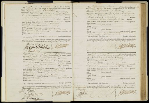 Den Vyftienden Maart Ao. 1800 Drie en-Twintig, ten twaalf ure, op den middag, is ingeschreven, de GEBOORTE van Martinus Poskeruw Geboren den veertienden dezer des morgens ten zeven ure, zoon van Ferans Voskeuil O van Beroep molenmakersknecht en van Aaltjen Braskamp, Echtelieden wonende No. 4 Kanton 3 asseerdergracht zijnde dit Kind aldaar geboren, en erkend van hetjannelijk geslacht. Eerste Getuige Martinus Voskuyl oud Eenenzeventig Jaren, wonende als boven Beroep timmerman Tweede Getuige Jaqués Meddelhoven oud Achtendertig Jaren, wonende Runstraat N 33 volgens verzoek aan ons Beroep timmermans kuecht gedaan, door den vader Na voorlezing is deze Acte door den vader en Getuigen geteekend, en wordt ingevolge de Wet bevestigd, door mij, als Lid van den Raad dezer Stad, daartoe ingevolge het Besluit van Z. M. van 14 Febr. 1823, No. 59, gedelegeerd. Frans Voskuye AWVDan MVoskhys Hliadelhoren Den Vyftienden Maart Ao. 1800 Drie-en-Twintig, H ten Een ure, na den middag, is ingeschreven, de GE BOORTE van Wilhelmina Allard. Geboren den dertienden dezer des nachts ten twee ure Dochter van Jacobus Anthonius Allard Beroep Gruttersknecht en van Maria Kolenberg, Echtelieden wonende de moeder fhans Binnen Gasthui No. Kanton zijnde dit Kind aldaar geboren, en erkend van het vrouwelijk geslacht. Eerste Getuige — Jaren, wonende oud Beroep Tweede Getuige Jaren, wonende oud volgens verzoek aan ons Beroep gedaan, door = Ingevolge proces verbaal in dato den 14en dezer van gemelde huis Na voorlezing is deze Acte door Getuigen geteekend, en wordt ingevolge de Wet bevestigd, door mij, als Lid van den Raad dezer Stad, daartoe isgevolge het Besluit van Z. M. van 14 Febr. 1823, No. 59, gedelegeerd. AG van maar Den Viftienden Maart Ao. 1800 Drie en Twintig ten twaalf ure, op den middag, is ingeschreven, de GEBOORTE van Carolina Margaretha Edauw Geboren den veertienden dezer des avonds ten negen ure, Dochter van DDirk Edauw van Beroep spiegelmaker, en van Marga „retha Christina Cornelius Echte wonende lieden schildersteeg No. 9 Kanton 4 zijnde dit Kind aldaar geboren, en erkend van het vruuwelijk geslacht. Eerste Getuige Jan Christiaan Helmhout oud dertig Jaren, wonende grimstuis No 34 Beroep tapper Tweede Getuige Gerardus de Lange oud zevenendertiJaren, wonende St Luvensteeg No 23 volgens verzoek aan ons Beroep winkelier gedaan, door den vader Na voorlezing is deze Acte door den vader en Getuigen geteekend, en wordt ingevolge de Wet bevestigd, door mij, als Lid van den Raad dezer Stad, daartoe ingevolge het Besluit van Z. M. van 14 Febr. 1823, No. 59, gedelegeerd. G Jdauw Javanmun H Helmhout P: De Lange Gecollationeerd en door ons op dato 33 Barburs klerk JBa Den Viftienden Maart Ao. 1800 Die en-Twintig, ten Een ure, na den middag, is ingeschreven, de GEBOORTE van Johanna Jacoba Consel Geboren den nagissing twee dagen geleden zes ten ure, van