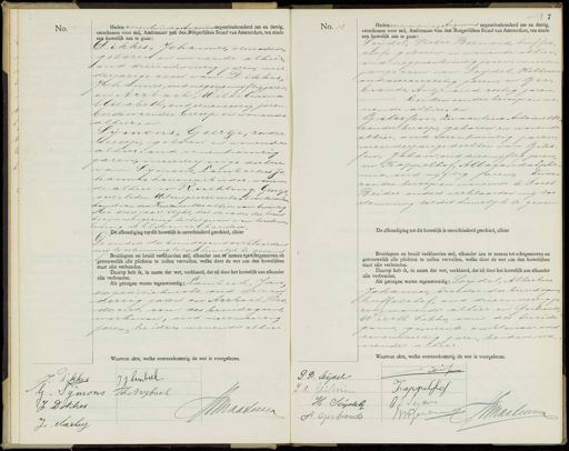 No. 11 Heden zesentwintig Augustus negentienhonderd zes en dertig, verschenen voor mij, Ambtenaar yan den Burgerlijken Stand van Amsterdam, ten einde een huwelijk aan te gaan: Dikkes, Johannes, Mucadoor¬ geboren en wonende alhier, toud drieentwintig jaren, meer derjarige zoon van: Dikkes, Johannes, oud negenenvijftig jaren. en Arrbach, Wilhelmina Elisabeth, oud eenenzestig jaren beiden zonder beroep en wonende alhier, en Sijmons, Geertje, zonder beroep, geboren en wonende alhier, oud eenentwintig jaren, meerderjarige dochter van: Pijmons, Lambertus Jo„ hannes, harenarbiider, wonen„ de alhier en Ruchling, Geertje overleden. Uit een proces-verbaal van tusschen. kamst van den Kantonrechter alhier, van twintig Mei dezes jaars blijkt, dat de vader der bruid bij zijn weigering tot het geven van toestem- ming is blijven volharden BAondiging toe tik huwelijk is onverhinderd geschied, alhier De ouders des bruidegams verklariden mij toestemming tot dit huwelijk te geven Bruidegom en bruid verklaarden mij, elkander aan te nemen tot echtgenooten en getrouwelijk alle plichten te zullen vervullen, welke door de wet aan den huwelijken Staat zijn verbonden. Daarop heb ik, in naam der wet, verklaard, dat zij door het huwelijk aan elkander zijn verbonden. Als getuigen waren tegenwoordig Kambeek, Jan expeditieknecht, oud drie en dertig jaren en Arrbach, Theo dorus, oom des berudegoms, werkman, oud vierenveertig jaren, beiden wonende alhier Waarvan akte, welke overeenkomstig de wet is voorgelezen. No. 12 8 Hedenzevenentwintig Augus ins negentienhonderd zes en dertig verschenen voor mij, Ambtenaar van den Burgerlijken Stand van Amsterdam, ten einde een huwelijk aan te gaan: Jeijdel, Pieter Bernard, briffel chef, geboren en wonende alhier, oud negenentwintig jaren, meerder jarige zoon van: Teijdel, Hilbertu oud vierenzestig jaren, en Ger„ brands, Antje, oud zeriig jaren beiden zonder beroep en wo nen de alhier, en Gilissen, Zwaantina Antoineste, zonder beroep, geboren in wonende alhier, oud zesentwintig jaren meerderjarige dochter van Gilis. sen, Johan, oud drieenvijftig jaren en Kappelhof, Allagonda Ephe mia, oud vijftig jaren, beiden zonder beroep en wonende te Soert Beider ouders verklaarden mij roe stemming tot dit huwelijk te geven De afkondiging tot dit huwelijk is onverhinderd geschied, alhier Bruidegom en bruid verklaarden mij, elkander aan te nemen tot echtgenooten en getrouwelijk alle plichten te zullen vervullen, welke door de wet aan den huwelijken staat zijn verbonden. Daarop heb ik, in naam der wet, verklaard, dat zij door het huwelijk aan elkander zijn verbonden. Als getuigen waren tegenwoordig: Peijdel Albertus Johannes, broeder des bundegom buffelitef, oud drieendertig ja ren, wonende alhier en Gerbrands Wierth Tokks, oom des bruide Jans, gemeente ambtenaar our eenenveertig jalen, beiden wo- nende alhier J. Dikkes J. J. Limbelk G. Symons Th. Arsbach J Dokker JMaateren JnMarboeg ens J.D. Seijdel Tappelo J.A. Gulisoin AJ Seyde H Seijdel JWWGerbrung NMaalinwe S Gerbronds