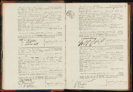 Den Leiden October Ao. 1800 Twee-en-Dertig, ten Elf ure, voor den middag, is ingeschreven, de GEBOORTE van Cvert Albertus Geboren den Eersten dezer des nacht ten Een ure, zoon van Hermanus de Geest oud achtentwintig Jaren, Beroep kapper en Derkie Lens oud Een edertig Jaren wonende duk van assentteeg No. 839 Kanton 4 zijnde dit Kind aldaar geboren, en erkend van het normeljke geslacht. Eerste Getuige Cornelis Engeli oud dertig Jaren, wonende pietersakobsstraat N 28 Beroep Kleermaker Tweede Getuige Jan van der Horst oud achtventig Jaren, wonende Strikolaasstraat N 581 Beroep tuunnerndetnechtvolgens verzoek aan om gedaan, door den vader Deze Acte is na voorlezing, geteekend door Vieder Getuigen, en bevestigd „Zya van den Raad ingevolge de Wet, door mij, als Wethouder, daartoe ingevolge Art. 95 van het Stedelijk Reglement door den Ed. Achtb. Heer Burgemeester benoemd: H: de Gurtz det derfstelen C: Engets. 5 van der port Den Derden October Ao. 1300 Twee-en-Dertig, ten ttaalf ure, 9pp den middig, is ingeschreven, de GEBOORTE van Jacobus Geboren den Eersten dezer des voondi ten zes ure, zoon van Jacobus Velder oud achtentwintig Jaren, Beroep werkman en Elisa„ beth Albregt oud zesentwintig Jaren, wonende Passeerderstraat No. 59 Kanton 9 zijnde dit Kind afdaar geboren, en erkend van het mamulite geslacht. Eerste Getuige Dirk Zinden ber„ oud zeven veertig Jaren, wonende schans Agt Beroep werkman Tweede Getuige Gurardus Migustinus Gloote goed oud drien twintig Jaren, wonende schoutensteer M volgens verzoek aan ons Beroep werkman gedaan, door den vader Deze Acte is na voorlezing, geteekend door de beide Getuigen, verklarende de Jaar nette kegnen schete en bevestigd