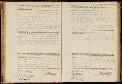 Op heten den Een en Twintigsten Febrnary des Jaan hentnhonderd Een-en-Twintg, desvermiddaar ten Fien. uren, zijn voor ous H A. G. Vn Heurs. Raad en Lid van de Kommissie tot den Burgerlijken Stand Ger Stad Amsterdam, verschenen, ten einde een huweijk aan te gaan) Gmanuel Leendert Konstenaar, m Amberdam Venter, oud zis en Twintig Saren .n Wonende Alhier Merderjarin zoun van Leendert Emannel Konstinaar. — Konstenaar. - mede wonende Alhier. en Saartje Heyer Knokker. - Overleden en ter Eenre zydee En Rebekka Aron Scheffer, van Amsterdam - Schoon markster. — oud vyf en Twintig sanen en Wonende Alhier. - Murderjarige Dochter van Arve Geroit Scheffer. Venter. mede Alhier Voonaptig. - en Eva Suikerman, Overleden.— ter andere zyde En Verklaarden Elns de beide Vaders, der aanstaande Echtgenoten, thans Mier tegenwoordig en hunne Toestemming te geenen tot het voorschreven Huwelyk.- De voorafgaande Acten, welke, nevens het zesde Hoofdstuk van het Huwelijk, volgens de Wet van a5 Ventose van het jaar Elf, voorgelezen zijn; bestaan, ten eersten: in een Extract uit het Register der Aondgenen, beboordd Alhuis geschied, dan Een en Twintigsten en Acht en Twintigsten Ianuary Lantstledene ten tweden de Besny Cedul die Bruwdegoms. - ten derden de Doodcedal zyner Moeder. en ten Vierden de Geboorte Acte van der Bruwd. Opgemaakt by den Vredenregter van het Eertste Kanton Alhier, en behoorlyk gehomologeerd. ten Vyfden- do mn Dood Cedal haver Moeder. n Waarna wij hun, bij name en afzonderlijk, hebben afgevraagd: of zij elkander aannamen als Man en Vrouw; het welk door hun, ieder in het bijzonder, met ja beantwoord zijnde, hebben wij in naar der Wet uitspraak gedaan: dat zij door het Huwelijk zijn vereenigd; alles ingevolge het derde Hoofd stuk der Wet van 20 Ventose van het jaar Elf, en in tegenwoordigheid van Machiel Smon Wolfenbettel. Koopman. oad Vlyf en dertig Jaren e Ehraim Mores Huijs, zan, Schilden. —Ond Een en twintig arme Morer dins Snitster: buite beroep. oud Negen en twintig Saren - en Pieter Matthysen, Ruiterwast. omd vier en zestig Sanen Alle Wonende Alhier Zijnde deze Acte door ons vervaardigd en voorgelezen aan de Comparanten, welke met ons hebben geteekend. uitgezondert de Echtgensten, die verklaarden niet te kunnen schryven.- M:S: Wolfenbelt JBvanman E M Huysman MM. C Snitste P: Matthysen Op heden den Een en Twintigsten Fiebrnariy, des Jaars Achttenhonderd Een-en-Twintig, 7 des voormiddaar ten Tien uren, zijn voor uue M t.J. van Meurs Raad en Lid van de Kommissie tot den Burgerlijken Stand der Stad Amsterdam, verschenen, ten einde een Huwelijk aan te gaan, Limon Benedictus Haliaander. - van Amsterdam Venter. oud zes en Twintig Iaren. - Wonende Alhier, Meerderjarige Loon, van Senedichar Hartog Statiaanden, Venten en Hertje Jorepr Levie. „ mede Wonende Alhur.- ter Eenre zyd. En Betje Levie Kogel.- van Amsterdam buiten beroep. - ond Vier en Twintig Saren.Wonende Alhier. Weerderjarige Dochter Van Lerie Machiel Kogel. Venter, en Indic Abraham Oldenburg. - mede Alhier Woonagtig.- ter andere zijde En Verklaarden Ons de Wederzydsche Onders der aanstaande Echtgenoten thans Alhier tegenwoordig: — hunne Toestemming te geeven tot het Voorschreeven Huwelyk De voorafgaande Acten, welke, nevens het zesde Hoofdstuk van het Huwelijk, volgens de Wet van 25 Ventose van het Jaar Elf, voorgelezen zijn, bestuun, ten eersten: in een Extract uit het Register der Aiondigagen, behoorg Alhier geschied, den Een en Twintigsten en Achten Twintigsten Ianuary Laatstleden. ten tweden, de Besny Cedul der Bruider „gomoen ten Verden. — de Geboorte Acte van de Bruid. & Opgemaakt by de Vrederrechter van het Eertste Kanton Alhier. - en behoortyk gehomologeend. — Waarna wij hun, bij nume en afzonderlijk, hebben afgevraagd: of zij elkander aannamen als Man en Vrouw; het welk door hun, ieder in het bijzonder, met ja beantwoord zijnde, hebben wij in naam der Wet uitspraak gedaan: dat zij door het Huwelijk zijn vereenigd; alles ingevolge het derde Hoofd stuk der Wet van 20 Ventose van het Jaar Elf, en in tegenwoordigheid van Gerort Seper Gerorn.- Masikant, van Hier in Vyftig saren Machiel Harta„ Parsser. buiten beroep. ond vier en zeventig Jaren, Mores Elius Snitster buiten beroep.- oud Negen en twintig Jaren en Pinas Durid Barmus. buiten bevoep, oud zeven en Vyftig Saren - Alle wonende Alhier. Zijnde deze Acte door ons vervaardigd en voorgelezen aan de Comparanten, welke met onshebben geteekend uitgezondert de Echtgenote, die verklaarde niet te kunnen Schryven). — S: B: Hatiaanden J: ml gesond Alddanmen m H Bersser M.C. Sitste F: D: Banpee