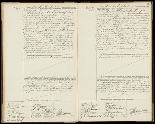 No. 696 Heden dertig October negentienhonderd dertig, zijn voor mij Ambtenaar van den burgerlijken stand van Amsterdam verschenen, ten einde een huwelijk aan te gaan. Klaas de Graaf, han¬ voorbediende geboren en wonende alhier oud vier en twintig jaren, meerderjarige zoon van Klaas de Graaf oud twee en vijftig jaren ap meubelmaker en Anna Maria Rop oud een en vijftig jaren, zonder beroep, beiden wonende alhier, en Deliana Hermina Blauw zonder beroep geboren en wonende alhier, oud drie en twintig jaren. meerderjarige dochter van Lierd Blauw oud vijftig jaren, vuurstoker en Alida Hillegonda derzeel oud acht en veertig jaren zonder beroep beiden wonende alhier Beider ouders verklaarden, voor mijtegenwoordig toe testemmen in dezen echt De afkondiging tot dit huwelijk is onverhinderd geschied, alhier den achttienden dezer maand Ik heb bruidegom en bruid afgevraagd of zij elkander nemen tot echtgenooten en ge- trouwelijk alle de plichten zullen vervullen, welke door de wet aan den huwelijken staat ver- bonden zijn. Nadat deze vragen door hen bevestigend beantwoord werden, heb ik, in naam der wet, uitspraak gedaan, dat zij door het huwelijk aan elkander zijn verbonden. Als getuigen waren tegenwoordig: Willem Gustaaf Adolf van Letten, tramwogenbestuurder, in Dirk Frederik de Graaf, oom des echtge noots meubelmaker beiden zes en veer„ tig jaren en wonende alhier. is voorgelezen. No. 697. Heden dertig October negentienhonderd dertig zijn voor mij Ambtenaar van den burgerlijken stand van Amsterdam verschenen, ten einde een Willem Hendrika Paeper huwelijk aan te gaan: 1 badmeester geboren en wonende alhier oud drie en twintig jaren meerderjarige zoon van Friedrich Carl Gottlies Poeper oud vijf en veertig jaren — werkman en Johanna Asje Zwaaneveld oud vier en veertig dren, zonder beroep beiden wonende alhier, en Lavind Gijzelaar werkster geboren en wonende alhier, oud zes en twintig Jaren meerderjarige dochter van Jacobus Johannes Gijzelaar, oud negen en zestig jaren en Lavina selhouwer, oud vier en zestig jaren, beiden zonder beroep en wonende alhier Beider ouders verklaarden voor mij tegenwoor dig toe te stemmen in dezen echt De afkondiging tot dit huwelijk is onverhnderd geschied, alhier den acht tienden dezer maand Ik heb bruidegom en bruid afgevraagd of zij elkander nemen tot echtgenooten en ge- trouwelijk alle de plichten zullen vervullen, welke door de wet aan den huwelijken staat ver- bonden zijn. Nadat deze vragen door hen bevestigend beantwoord werden, heb ik, in naam der wet, uitspraak gedaan, dat zij door het huwelijk aan elkander zijn verbonden. Als getuigen waren tegenwoordig: Jacob Gijzelaar broeder der echtgenoote harenarbeider oud acht en dertig jaren, wonende alhier en Andries van der uet, zwager der echtgenoote lood„ gieter, oud dertig jaren, wonende in de ge„ meente 's Gravenhage Waarvan akte, welke overeenkomstig de wet is voorgelezen.