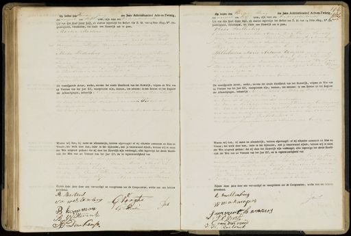 Op heden den voerden Juny des Jaars Achttienhonderd Acht-en-Twintig, des morgens ten elf uren, zijn voor ons ondergeteekende Lid van den Raad dezer Stad, als daartoe ingevolge het Besluit van Z. M. van 14 Febr. 1823, No. 59. en van 11 Iun: 1828 gedelegeerd, verschenen, ten einde een Huwelijk aan te gaan, Marten Martens. Schipper, Geboren te Elburg Disen Arnhem, wonende Achier, oud Zes en twintig Jaren, Meerderjarige zoon van Jacob Martens schipper, en Btatsen koopman, wonende Alhier; ter Eene Aleida Westenberg geen beroep, Geboren te Noord„ hoorn (Hannover, wonende Alhier, Oud Drie en Twintig Jaren, Meerderjarige Dochter van Hindri Westenberg, geen beroep, en Gese Frentjen, wonende te Noordhoorn.- ter andere zijde En konsenteerde de Moeder des bruidegoms personeel in dezen Echt. De voorafgaande Acten, welke, nevens het zesde Hoofdstuk van het Huwelijk, volgens de Wet van 25 Ventose van het Jaar Elf, voorgelezen zijn, bestaan, ten eersten: in een Extract uit het Register der Afkondigingen, behoortijk Alhiergeschied den 1den en 18den Mei te ten 2den de Doopsedullen der verloofden ten 3den Notarieal kondert van den Vader des bruidegoms.— ten 4 den Geregtelyk kondent van de Ouders der bruid Waarna wij hun, bij name en afzonderlijk, hebben afgevraagd: of zij elkander aannamen als Man en Vrouw; het welk door hun, ieder in het bijzonder, met ja beantwoord zijnde, hebben wij in naar der Wet uitspraak gedaan: dat zij door het Huwelijk zijn verëenigd; alles ingevolge het derde Hoofd- stuk der Wet van 20 Ventose van het Jaar Elf, en in tegenwoordigheid van Larend Westerink, schippersknecht, Oud Zes en Vyftig Hendrik Derekomp Idem Oud Acht en twintig Gerrit Voogt Winkelier Oud zevenen Twintig, en Gerrit Planten Ambtenaar, Oud Negen en Zestig Jaren. - Allen wonende Altier Zijnde deze Acte door ons vervaardigd en voorgelezen aan de Comparanten, welke met ons hebben geteekend. A: Martens. va wel terlirg G: Voog Tick B koopman G. Panstin B Wisterink Op heden den Vierden Junij des Jars Achtienhonderd Achten-Twintig J des morgens ten Elf uren, zan voor ons ondergeteekende Lid van den Raad dezer Stad, als daartoe ingevolge het Besluit van Z. M. van 14 Febr. 1823, No. 59.- en van 11 Jan: 1828 No gedelegeerd, verschenen, ten einde een Huwelijk aan te gaan, klaas Snellenberg Milkverkooper Geboren te Duivendricht, wonende Achier Aud Vier en Twintig Jaren, weduwenaar van Cornelia Boekwijt, Meerderja rige zoon van Klaas Snellenberg, en Matje van Rijn, beide overleden. ter Eene En Wilhelmina Maria Antonia Kampers geen beroep Geboren te Muiden wonende Alhiec Ond Twintig Jaren, Minderjarige Dochter van Lammert Kampers 1a/ Werkman, wonende te Muider; en wijlen Maria Leijser ter andere zijde.— En konsenteerde de vader der bruid personeel in dezen Echt.— De voorafgaande Acten, welke, nevens het zesde Hoofdstuk van het Huwelijk, volgens de Wet van 25 Ventose van het Jaar Elf, voorgelezen zijn, bestaan, ten eersten: in een Extract uit het Register der Afkondigingen, behoorlijk Achier geschied zen Hden en Bden Meilln en ter zelver dage te Muder.— ten 2den de Doopcedeelten der verboofden ten 3den de Doodcedul van de vorige Vrouw des bruidegams ten 4den de Doodcedullen zyner Ouders: hy verklaarde ons met de ondergemelde getuigen ander aanbod van eede den daod zyner Groot Vuders. ten 5 dende Doodcedul van de Moeder der bruid. Waarna wij hun, bij name en afzonderlijk, hebben afgevraagd: of zij elkander aannamen als Man en Vrouw; het welk door hun, ieder in het bijzonder, met ja beantwoord zijnde, hebben wij in naam der Wet uitspraak gedaan: dat zij door het Huwelijk zijn vereenigd; alles ingevolge het derde Hoofd- stuk der Wet van 20 Ventose van het Jaar Elf, en in tegenwoordigheid van der Echtgenootes Vader, oud Negen en Veertig Jaren wonende als voormeld, Pieter Pieters Waarde scheeps„ timmerman, oud Een en Dertig, Christianus van der Vaard Melkverkooper, oud zesen twintig, en Jan Hermen Roelvink Metselaar, Aud Vier en Dertig Jaren = Allen wonende Achier Zijnde deze Acte door ons vervaardigd en voorgelezen aan de Comparanten, welke met ons hebben geteekend. k smellenborg ent Wmakampers Sammert Kampers JF: F: Woors G: van der vaars