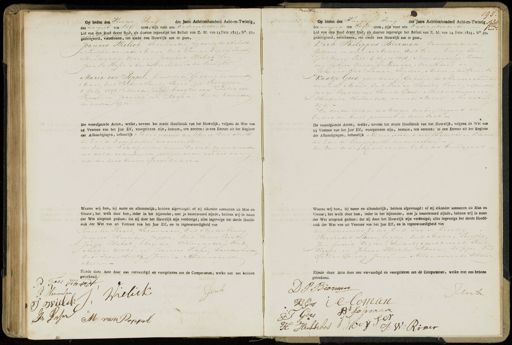 op heden den Vierden Junij des Jaars Achttienhonderd Acht-en-Twintig, des morgens ten Elf uren, zijn voor ons ondergeteekende Lid van den Raad dezer Stad, a’s daartoe ingevolge het Besluit van Z. M. van 14 Febr. 1823, No. 59. van 11 Iun: 1828 N 103. gedelegeerd, verschenen, ten einde een Huwelijk aan te gaan, Joannes Wielick Schoenmaker Geboren te Antold en Pruissen, wonende Achier, Oud Twee en Dertig Jaren, Meerderjarige zoon van Josephus Wielick, en Joanna Visser: - beide overleden.- ter Eene; En Maria van Toppel. Lienstbode, Geboren en wonende etchier, Oud Negdren Twintig Jaren (ged: Posttoorn 8 Iuly 1798) Meerderjarige Dochter van Pieter van Poppe, en Johanna van Roosum, beide overleden ten andere zijde. De voorafgaande Acten, welke, nevens het zesde Hoofdstuk van het Huwelijk, volgens de Wet van as Ventose van het Jaar Elf, voorgelezen zijn, bestaan, ten eersten: in een Extract uit het Register der Afkondigingen, behoorlijk e schier geschied den Hden en 18 den MeiEl. ten 2den de Zoopsedullen der verloofden ten 3den de Doadsedullen hunner Ouders: zy verklaarden ons met de ondergemelde getuigen onder aan bod van eede den dood hunner Groot Ouders.- Waarna wij hun, bij name en afzonderlijk, hebben afgevraagd: of zij elkander aannamen als Man en Vrouw; het welk door hun, ieder in het bijzonder, met ja beantwoord zijnde, hebben wij in naam der Wet uitspraak gedaan: dat zij door het Huwelijk zijn verëenigd; alles ingevolge het derde Hoofd- stuk der Wet van 20 Ventose van het Jaar Elf, en in tegenwoordigheid van Petrus ten Haart, Schoenmaker, Oud Achten Veertig Josephus Harmsen, tapper, Aud Eenen Veertig Joseph Wielick tbroeder, Kkleivenmaker, Aud Acht en twintig, en Johannes Visser, Zaarsen maker oud zes entwintig Jaren. - Allen wonende Alhier.— Zijnde deze Acte door ons vervaardigd en voorgelezen aan de Comparanten, welke met ons hebben geteekend. Pes Haardt Genh Haremsen Wieldk J. Welick P M: van Poppel Op heden den Vierden Junij des Jart Achtienhonderd Acht-en-Twintig, Jal des morgens ten Eefft uren, zijn voor ons ondergeteekende. Lid van den Raad dezer Stad, als daartoe ingevolge het Besluit van Z. M. van 14 Febr. 1822, No. 59. en van 11 Jan: 1828 n 108. gedelegeerd, verschenen, ten einde een Huwelijk aan te gaan, Dirk Philippus Bierman Kantoorbediende Geboren en wonende Achier Oud Een en zertig Iaren (ged: Evang: Lutt: 4 Sept: 1796) Meerderjarige zoon van Casper Hendrik Bierman, overleden; en Johanna Eliz: Loman, Sapoter, Achier.- ter Eene; En Kaatje Goes, geen beroep, Geboren te Nieuwer Amstel wonende Actier, oud Vier en Twintig Jaren, Meerder, jarige Dochter van Tennis Goes, Melkverkooper, en Hendrika Hulsenbos, wonende Actieu. - ten andere zij de. — En konsenteerden de Moeder des bruidegoms en Onders der bruid personeel in dezen Echt. De voorafgaande Acten, welke, nevens het zesde Hoofdstuk van het Huwelijk, volgens de Wet van 25 Ventose van het Jaar Elf, voorgelezen zijn, bestaan, ten eersten: in een Extract uit het Register der Afkondigingen, behoorlijk Alhuer geschied den 25eell en Vdezen ten 2den de Doopcedullen der verloofden ten 3den de Doorjedeel van den Vader des bruidegams. Waarna wij hun, bij name en afzonderlijk, hebben afgevraagd: of zij elkander aannamen als Man en Vrouw; het welk door hun, ieder in het bijzonder, met ja beantwoord zijnde, hebben wij in naam der Wet uitspraak gedaan: dat zij door het Huwelijk zijn verëenigd; alles ingevolge het derde Hoofd stuk der Wet van 20 Ventose van het Jaar Elf, en in tegenwoordigheid van der Echtgenootes vader oud Zes en Veertig Bernardus Loeman, tapper, oud Acht en Veertig Jan Fredrik Keijser, Suikerbakkersknecht Cnd Veertig, en Johann Wiltelm Römer, tapper, On Twee en Veertig Jaren. — Allen wonende Alhier Zijnde deze Acte door ons vervaardigd en voorgelezen aan de Comparanten, welke met ons hebben geteekend. D P Bierman Lent K Cos Celoman J Goes B:o Lohman set 39 „Hussebos KeJ: J: W: Römer