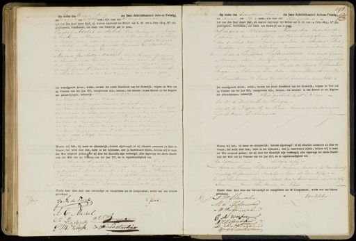 P. 1/ Op heden den Zeventienden Iuni des Jaare Achtienhonderd Acht-en-Twintig, W des Iningeur ten Eyfe uren, zijn voor ons Ondergetekende Lid van den Raad dezer Stad, als daartoe ingevolge het Besluit van Z. M. van 14 Febr. 1823, No. 59. 28. N.o 108. gedelegeerd, verschenen, ten einde een Huwelijk aan te gaan, Johannes Wilhelmus EEsensohn, buiten beroep. Geboren, en wonende Alhier, oud vier en Twintig Jaren.- gedoopt star & Augo. 1803. Mwederjarige zoon van Josephus Felicis Elsentohn. Anna Wilhelmina Timmerman beide Overleden.- ter Eenen Maria Christina Slafkenscheid. buiten beroep. Geboren en Wonende Atthier. - Ond zes en Twintig Iaren, bed: belootsloop en Sufder 21 April 1802.-Mirderjarige Dochter van Mechiel Zafkenscherd, Koopman-- en Catharina Alida Weber. - Wonende Alhier. - den andere zyde. En Konsenveerden de Onders der Bruid, personeel in dezen Echten De voorafgaande Acten, welke, nevens het zesde Hoofdstuk van het Huwelijk, volgens de Wet van 25 Ventose van het Jaar Elf, voorgelezen zijn, bestaan, ten eersten: in een Extract uit het Register der AKondigingen, behoorin Alhier geschiev, den st en 8. dezer. ten 2:e de Dorp/ vullen der Verloofden ten 3=e de DoodCedullen der Onders. - benevens die der wederzydsche Of noot Onders: dis Arundegoms. Waarna wij hun, bij name en afzonderlijk, hebben afgevraagd: of zij elkander aannamen als Man en Vrouw; het welk door hun, ieder in het bijzonder, met ja beantwoord zijnde, hebben wij in naar der Wet uitspraak gedaan: dat zij door het Huwelijk zijn verëenigd; alles ingevolge het derde Hoofd- stuk der Wet van 20 Ventose van het Jaar Elf, en in tegenwoordigheid van der Eeptgenotes Vader.e oud vyfen vyftig Antonius Henricur Hlafkerscheidt. koopmanis Broeder. - oud Vier en twintig Bernardus Slafkenscherd. Winkelier. - Oom. oud drie en Vyftig: - en Gerrit Slanterman. Kooppan. - Vrehuwd Oom der Bruwegoan. - oud drie en vyftig Faren. Allen Wonende Alhier. Zijnde deze Acte door ons vervaardigd en voorgelezen aan de Comparanten, welke met ons hebben geteekend. van Winter JJ. W. Elsensohn. M.C. Rafkenscheid M Wafkenscheid G A Weeber A H Hafk en Joheid B. Hakkenscheid G H antieman