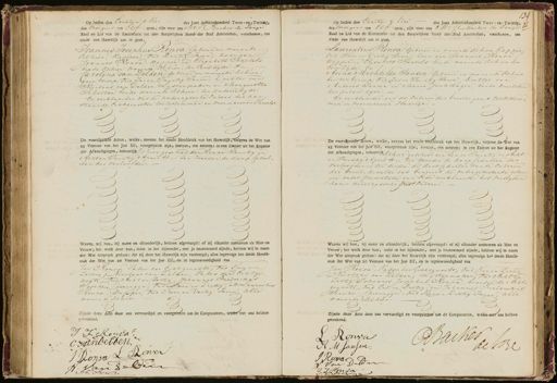 1 Waarna wij hun, bij name en afzonderlijk, hebben afgevraagd: of zij elkander aannamen als Man en Vrouw; het welk door hun, ieder in het bijzonder, met ja beantwoord zijnde, hebben wij in naam der Wet uitspraak gedaan: dat zij door het Huwelijk zijn verëenigd; alles ingevolge het derde Hoofd- stuk der Wet van 20 Ventose van het Jaar Elf, en in tegenwoordigheid van Jan Ronva Vader des Echtgenoots, oud Vier en Zestig, Nicolaas van Delden, Vader der Echtge„ nogte, oud Acht en Zestig, Johannes Vrederikus Seveke, (hieurgijn, oud Twee en Dertig, en Lauren tins Cronva, kapper, oud Twee en Dertig Jaren alle wonende aehier Zijnde deze Acte door ons vervaardigd en voorgelezen aan de Comparanten, welke met ons hebben geteekend. J x: J Ronda C Vanbebben. J Konse L: Ronva an de Ver W: Ft: Ber 13 Op heden den Eersten Mei des Jaars Achtttenhonderd Twee-en-Twintig, j des morgens ten Elf uren, zijn voor ous Mr Backer de Ionge Raad en Lid van de Kommissie tot den Burgerlijken Stand der (Stad Amsterdam, verschenen, ten einde een Huwelijk aan te gaan. Laurentius Ronva geboren en wonende alhier Kapper, oud Twee en Dertig Jaren, zoon van Ioannes Ronva kapper en Elisabeth Bartels beide wonende alhier ten Eene zijde. En Anna Mechtilda Iansen geboren en wonende dlhier buiten beroep, oud Zes en Twintig Jaren Dochter van Andries Iinden en Maria Jonkslager, beide overleden ter andere zijde. En verklaarden ons de onderen des bruidegoms toetestem men in voorschreven Huwelijk. De vooralgaande Acten, welke, nevens het zesde Hoofdstuk van het Huwelijk, volgens de Wet van 25 Ventose van het Jaar Elf, voorgelezen zijn, bestaan, ten eersten: in een Exfract uit het Register der Akhondigingen, behoortjk alhier geschied den Een en Twintig en Acht en Twintig April lei ten tweeden de doopcedullen der verlootdens ten derden de doodsedullen van de onderen der bruid, de welke ons benevens de ondergeteekende getui„ gen onder presentatie van Eede verklaarden het overlyden harer wederzydsche Groot Onderen S