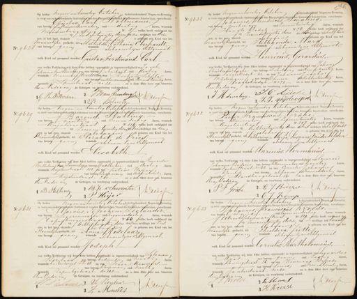 No 9632 Op heden negenentwintig October Achttienhonderd Negentn- Zeventig is voor ons ombrgeteekende Ambtenaar van den Burgerlijken Stod der Gemeente Amsterdam, verschenen. Pieter, Franciscus Grabé oud zevenentwintig Jaren, wonende van beroep Heerima ver —No. 197., welke heeft verklaard dat Anjelierstraat oAchtentwintig dezer des na middags ten half acht ure in het huis, staande als boven is geboren een kind zan het Mannelijke geslacht, uit Catharina, Maria, Susanna, van der Velden. van beroep geen wonende alsboven, zijne Echtgenoot. welk Kind zal genaamd worde Marinus, Hermanus. van welke Verklaring wij deze Akte hebben opgemaakt in tegenwoordigheid van Coenraad Johannes Boderie van beroep kleeremaker oud veertig Jaren, wonende Oyjnberstraat No 44. en van Cornelis Johannes Keimb, van beroep als haven oud zevenendertig Jaren, wonende Handhoogstraat 16 en is deze Akte door ops, benevens den waderen de Getuigen, na voorlezing onderteekend. P B 2 C J Boderie Drieck Jräbe 1 3 E J Kemp No. 9630 Op heden negenentwintig betaberchttienhonderd Negen-en Zeventig, is voor ons ondergeteekende Ambtenaar van den Burgerlijken Stand der Gebeente Amsterdam, verschenen: Jlarcus, Nochem, Leglander„ van beroep Ligarenmaker oud negenendertig Jaren, wonende lapenburgerstraat— No. 64, welke heeft verklaard dat achtentwintig dezer des voormiddags ten zes„ Alsboue is geboren een kind van het ure, in het huig, staande Mannelijke geslacht, uit Anna Roselaar van beroepgeen wonende als boven zine Echtgenoot welk Kind zal genaamd worden Hoseph van welke Vverklaring wij deze Akte hebben pgeslaakt in tegenwoordigheid van Salaman Kozelaar oan beroep bediende oud veertig Jaren, wonende buitentengel ak. 48, en van Staar, Mouwes. van beroep koopman oud veertig Jaren wonende rapenbystraat. No 103.- en is deze Akte voor ons, benevens den Vader en de Getuigen, na voorlezing onderteekend zeelanden S Mozelaat HS Z Drcessen 3 J Mouwes No. 9633 Op heden Negenentwintig Oetaber Achttienhonderd Negene Zeventig is voor ons portepgetgekende Ambtenaar van den Burgerlijken Stand der Nemeente Amsterdam, verschenen Hohannes, Franciscus, Kroese. mids oud zevenendertig Jaren, wonende van beroep HUtrechtschedwarsstraat No. 109,, welke heeft verklaard dat op zevenentwintig dezer des middags ten twaalf dre, in het huis, staande als boven, is geboren een kind van het mannelijke geslacht, uit Theodora, Jutte