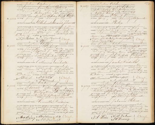 No. 9334. Op heden Zestien October Achttienhonderd Tachtig is voor ons ondergeteekende Ambtenaar van den Burgerlijken Stand der Gemeente Amsterdam, verschenen: Adrianus, Arnoldus, Pastoors. van beroep Smid oud zegenentwintig Jaren, wonende koomstraat No. 27, welke heeft verklaard dat op dertien dezer des na middags ten negen dre, in het huis staande als boven is geboren een uran her mannelijke geslacht, uit Geertruida Hubertina, van de Vosse„ 7, van beroep geen wonende als boven zine Echtgenoote welk Kind zal genaamd worden Wilhelmus, Adrianus, Johannes, van welke Verklaring wij deze Akte hebben opgemaakt in tegenwoordigheid van Jacobus Johannes Gerardus Beijer, van beroep schoenmaker oud tweeenteertig Jaren wonende rechtboopsslaat, 27 en van Christiarius Thyrlem, van beroep zimid oud negenendertig Jaren wonende betange dwarsstraat. 17 en is dere Akte door ons, benevens den Vader en de Getuigen na voorleig onderteekend. A A Pastoors J G Beijer Jqries 3 C No. 9337. 157 op heden Zestien October Achttienhonderd Tachtig, is voor ons ondergeteekende Amtenaar van den Burgerlijken Stand der Gemeente Amsterdam, verschenen. Hensch, Joken van beroep diamantingjder oud drieentwintig Jaren, wonende Lange Houtstraat. No. 61. welke heeft verklaard dat op veertien dezer des voormiddags ten zes„ ure, in het huis. staande als boven is gehoeen een kind van het hannelijke geslacht, uit Dina, Croese van beroep geen wonende als boven zine Echtgenoote. welk kind zal genaamd worden Lhilip van welke Verklaring wij deze Akte hebben opgemaakt in tegenwoordigheid van Simon Massel, van beroep bediende oud dertig Jaren, wonende rapenbgstraat. 41, en van Leaue Crocte. van beroep koopman oud zesentwintig Jaren, wonende Leprozengracht, 24 en is deze Akte door ons, benevens de Getuigen, op voorlezing onderteekend de komparanten ver„ „klaarden Wegens hun Sablat, niette mogen „schrijven, ende doorkaling van drie gedrykte Driesse „woorden goedgekeurd 157.2 No 9335. Op heden Zestien Oetaler Achttienhonderd tachtig, is voor ons ondergeteekende Ambtenaar van den Bargerlijken Stand der Gemeente Amsterdam, verschenen: Joannes, Leders van beroep hanspreker oud negenentwintig Jaren, wonende Nieuwe Leliestraat No 101, werke heeft verklaard dat eden des vol middags ten tien nre, in het huis, staandeals boven (s geboren hen Kind van het Vrouwelyke geslacht, uit lotharing, kamberta, Slot, van beroep geen wonende als boven, zine Echtgenoote, welk Kind zal genaamd worden Catharina Lamberta. van welke Verklaring wij deze Akte hebben opgemaakt in tegenwoordigheid van Dirk Willemslat van beroep kanspreker oud zevenenvijftig Jaren, wonende als de ouders 113, en van Hendrik Groeneveld van beroep aanspreker oud vijfendertig Jaren wonende als boven. no 18 en is deze Akte door ons, benevens den Vader en de Getuigen, na voorlezing onderteekend. 2 D Wollof I: Ieders Driesse P H Groeraak No. 9338 of heden Zestien betaler Achttienhonderd Tachtig is voor ons opdergeteekende Ambtenaar van den Burgerlijken Stand der Gemeente Amsterdam verschenen. Hermanus van Raamsdonk. van beroep schuitenvoerder oud achtendertig Jaren, wonende betangestraat No. 12,, welke heeft verklaard dat op veertien dezer des voormiddags ten acht ure, in het uus, staande liboging is geboren ten kind van het Vrouwelijke geslacht, uit Jacoba, Fredrika, Verpeul, van beroepgeen wonende als boven, zine Echtgenoote welk Kind zal genaamd worden Jacoba Fredrika. van welke Verklaring wij deze Akte hebben opgemaakt in tegenwoordigheid van Aldriaan van Kaamsdank van beroep geen oud achtenzestig Jaren, wonende Amstel. no 51, en van Andries Mulder van beroep wwinkelier oud zevenendertig Jaren, wonende klaainiersburgwal. 8 en is deze Akte door aps, benevens, den vader en de Getuigen, na voorlezing onderteekend H v Rerdemn on AVBraamsdnk L Reessen 3 A. Hulder No. 9336 Op heden Zestien October Achttienhonderd Tachtig, is voor ons ondergeteekende Ambtenaar van den Burgerlijken Stand der emeente Amsterdam, verschenen: Adrianus, Kander Leepu van beroep koekhouder oud vierenvijftig Jaren, wonende Keizersgracht. No 1679, welke heeft verklaard dat op veertiendezer de voor middags te halfzes, ure, in het huis, staande als boven is geboren een Kind van het Vrouwelyke geslacht, uit Henrietta, Jacob Frederiea Boll„ van beroep geen wonende als boven zijne echtgenoote, welk Kind zal genaamd worden Henrietta Frederica. Jan welke Verklaring wij deze Akte hebben opgemaakt in tegenwoordigheid van Picter Willem schoondteek van beroep kaffiehuishoude oud zevenenviftig Jaren wonende Kalverstraat. 5. — en van antaniuklachrid dus Visbeek van beroep enloorhediende oud Eenendertig Jaren wonende Lendengracht. 156 en is deze Akte door ns, benevens den aderen de Getuigen, na voorlezing onderteekend A Levon 2 JW Schoonenbert Dresse 3 A C Vesbucks No. 9339 Op heden Zestien October Achttienhonderd Tachtig, „ is voor ons ondergeteekende Ambtenaar van den Burgerlijken Standder Gemeente Amsterdam, verschenen: Johan Andreas Weinp van beroep broodbakker oud negenendertig Jaren, wonende Koote Koningswarsstraat — No. 10., velte heeft verklaard dat pvijftien dezer des voor middags ten zeven pre, in het huis, staande als boven geboren een kind van het Vrouwelijke geslacht, uit JohpannaBJs. van beroep geen wonende als booen zijne Echtgenoote. welk kind zal genaamd worden Johanna, Helena. van welke Verklaring wij deze Akte hebben opgetaakt in tegenwoordigheid van Willem Arnald Bekman van beroep vroodbakker oud tweeenveertig Jaren, wonend Circtetaurierdustraat 44 en van Janfrederik Duuring van beroep alshoum oud drieendertig Jaren, wonende, koopeteidichedustraat. 75 en is deze Akte door ops, benevens den vader en de Getuigen, na voorlezing onderteekend. J A Wein &W: A Bekmen Driessen 3 J T. Duuring.