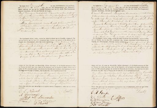 Op heden den Negenden Mei des Jaars Achttienhonderd Achten-Dertig, des Meigens ten Elf uren, zijn voor ons Ondergeteekende, als Wethouder, daartoe ingevolge Art. 95 van het Stedelijk Reglement door den Ed. Achtb. Heer Burgemeester benoemd: verschenen, ten einde een Huwelijk aan te gaan, Carl Ludwig Nordsieck Kkleermaker, geboren te Spenoe Pruulens, wonende Alhier, oud tweeendertig Jaren, meerderjarige zoonvan Frredrike Nordsieck, zonder beroep wonende te Lubbecke, ter Eene erf Alida Voor dewind, zonder beroep, geboren en wonende Alhier, oud Vieren dertig Jaren meerderjarige doch ter van Jan Voordewimd, en Marrite Bom, beide Overleden.— ter andere zyde. De voorafgaande Acten, welke, nevens het zesde Hoofdstuk van het Huwelijk, volgens de Wet van 25 Ventose van het Jaar Elf, voorgelezen zijn, bestaan, ten eersten: in een Extract uit het Register der Afkondigingen, behoorlijk zonder verhindering Alhier geschiefd den Negen en wintigsten epril L2 en Zeyden Dezer, ten 2 Doob„ Eedullen de verloofdens. ten 3 het geregtelyk Consent van de Maeder des Bruidegoms. te d=o de Dood besuth van de Onders der Bruid, die ons met de onder gemelde getuigen onder aanbor van Eepde de onbekendheid der slaats van Overlyden of laatste woonplaats harer Groot Onders waarna wij hun, bij name en afzonderlijk, hebben afgevraagd: of zij elkander aannamen als Mar en Vrouw; het welk door bun, ieder in het bijzonder, met ja beantwoord zijnde, hebben wijn naam der Wet uitspraak gedaan: dat zij door het Huwelijk zijn vereenigd; ales ingevolge het derde Hoofdsuk der Wet van 2o Ventose, van het Jaar Elf, en in tegenwoordigheid van Pieter Schut Zwager der Echtgenoote Timmerman, ond Zeven en dertig Adrianue Kommerie als toven, oud Achten twintig Joh an Nicolaas Schrender Erschkooper oud Negen en twintig, in Wilhelmus Thepas, Winkelier, Register der Afkondigingen, behoorlijk zonder verhindering Alhier geschiefd den Negen en wintigsten epril L2 en Zeyden Dezer, ten 2 Doob„ Eedullen de verloofdens. ten 3 het geregtelyk Consent van de Maeder des Bruidegoms. te d=o de Dood besuth van de Onders der Bruid, die ons met de onder gemelde getuigen onder aanbor van Eepde de onbekendheid der slaats van Overlyden of laatste woonplaats harer Groot Onders waarna wij hun, bij name en afzonderlijk, hebben afgevraagd: of zij elkander aannamen als Mar en Vrouw; het welk door bun, ieder in het bijzonder, met ja beantwoord zijnde, hebben wijn naam der Wet uitspraak gedaan: dat zij door het Huwelijk zijn vereenigd; ales ingevolge het derde Hoofdsuk der Wet van 2o Ventose, van het Jaar Elf, en in tegenwoordigheid van Pieter Schut Zwager der Echtgenoote Timmerman, ond Zeven en dertig Adrianue Kommerie als toven, oud Achten twintig Joh an Nicolaas Schrender Erschkooper oud Negen en twintig, in Wilhelmus Thepas, Winkelier, oud Negen en dertig Jaren. wonende allen Alhier. Zijnde deze Acte door ons vervaardigd en voorgelezen aan de Comparanten, welke met ons hebben geteekend. E. L. Nordsieck Deulz A Voordewind A. Sommen JSll J: N:o Schrender waarna wij hun, bij name en afzonderlijk, hebben afgevraagd: of zij elkander aannamen als Man en Vrouw; het welk door hun, ieder in het bijzonder, met ja beantwoord zijnde, hebben wij in naam der Wet uitspraak gedaan: dat zij door het Huwelijk zijn vereenigd; ales ingevolge het dende Hoofdstuk der Wet van 20 Ventose van het Jaar Ek, en in tegenwoordigheid van en Valoer des Echtgenoots, oup Achten Vijftig, Coenrad Gybertus van Herson, Winkelier oud Vyftig Joost Hendrik Lucke, zonder beroep, oud Een en Zestig, en Chris hiaan Albers, Kleermaker, onse twee en Vyftig Parens. Wonende ade Alhier. Zijnde deze Acte door ons vervaardigd en voorgelezen aan de Comparanten, welke met ops hebben geteekende Verklaren pe Ce Moeter niette kunne schryven Deutz E.H: Lammper LC Scholtz E H Lompen OMoirs C: G van Iterson J H Luechh 154 Op heden den Negengen Mei des Jaars Achttienhonderd Acht-en-Dertig, des Mdigens ten Elf uren, zijn voor ons Ondergeteekende, als Wethouder, daartoe ingevolge Art. 95 van het Stedelijk Reglement door den Ed. Achtb. Heer Burgemeester benoemd: verschenen, ten einde een Huwelijk aan te gaan, Evert Hendrik Lampen, kantoorbodiende, mobielschutter geboren en wonende Alhier, oud Negen entwintig Iaren meerderjarige toon van Eberhard Lamse Inkerchkker, Wonenbe Alhuo in Ele„ „sabeth Horman, overleden. ter Eene, en Zus anna Catharina Scholtz, (dienstbaar, geboren te Velzen Arrondissement Haarlems, wonende Alhieo oud Vieren dertig Iaren, meerderjarige Dochter van Jan Scholtz, overleden, en Znsanna von singen tuinieister woonenoe te workaarduin ter anpere zyde. En consenteerde de Vader der Bruidegoms, in de Moeder der Buud personeel indezen Echt De voorafgaande Acten, welke, nevens het zesde Hoofdstuk van het Huwelijk, volgens de Wet van 25 Ventose van het Jaar Elf, voorgelezen zijn, bestaan, ten eersten: in een Extract uit het Register der Afkondigingen, behoorlijk zonder verhindering Alhier beschiep bers Negen en twintigsten April 2 en zesden Dezer ten 2= de Voor Cedullens der Verloofdens ten 3=o de klood cepullen vande Moeper der Bruide goms, in en Vaper der Bruid 4u U de Toertimming van den Bataillons Chef. waarna wij hun, bij name en afzonderlijk, hebben afgevraagd: of zij elkander aannamen als Man en Vrouw; het welk door hun, ieder in het bijzonder, met ja beantwoord zijnde, hebben wij in naam der Wet uitspraak gedaan: dat zij door het Huwelijk zijn vereenigd; ales ingevolge het dende Hoofdstuk der Wet van 20 Ventose van het Jaar Ek, en in tegenwoordigheid van en Vatoer des Echtgenoots, oup Achtenvijftig, Coenradus Gybertus van Herson, Winkelier oud Vyftig Joost Hendrik Lucke, zonder beroep, oud Een e zestig, en Chris hiaan Albers, Kleermaker, onse twee en Vyftig Parens. Wonende ade Alhier. Zijnde deze Acte door ons vervaardigd en voorgelezen aan de Comparanten, welke met ops hebben geteekende Verklaren pe Ce Moeter niette kunne schryven
