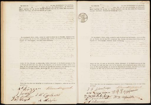 Op heden den ddertienden Fbruary des Jaars Achttienhonderd Acht-en-Dertig, des margen ten Tien uren, zijn voor ons Ondergeteekende, als Wethouder, daartoe ingevolge Art. 95 van het Stedelijk Reglement door den Ed. Achtb. Heer Burgemeester. benoemd: verschenen, ten einde een Huwelijk aan te gaan, ean Theodor Koppec, Suikerbukker gebaren te Ossenberg, Pruissen, marnde alhier, aud acht entwintig farin, meer derjarige zoan van Françcois K oppee. Christine de Wey, beide uuvrleden, ter Een annetje Kruijk dunstbaar, gebaren en wonende alhier aud moen en dertig Jariie, n ierderarige dachter van Jacobus Kruijk, in Alieda van der Plas, Oude oerleden, ter andere zyde De voorafgaande Acten, welke, nevens het zesde Hoofdstuk van het Huwelijk, volgens de Wet van 25 Ventose van het Jaar Elf, voorgelezen zijn, bestaan, ten eersten: in een Extract uit het Register der Afkondigingen, behoorlijk zonder verhindering alhier een huid der Vierden in Elfden dezer ten 2e en gebaortn en doopcedullin der verloofdin.- ten 3e de doodCedullin hunner Ouders. tn 4e acti causta turende het overlyden van de Groot Ouders des windigaens, in de identiteit zyner moeder. - En verklaarde aun de kruid mat de andergemelde getuigen ander aanbod van Eede de onteekende der plaats van overlyden of laatste waarplaats hwier Grotouders. waarna wij hun, bij name en afzonderlijk, hebben afgevraagd: of zij elkander aannamen als Man en Vrouw; het welk door hun, ieder in het bijzonder, met ja beantwoord zijnde, hebben wij in naam der Wet uitspraak gedaan: dat zij door het Huwelijk zijn vereenigd; alles ingevolge het derde Hoofdstuk der Wet van 20 Ventose, van het Jaar Elf, en in tegenwoordigheid van „tendijk Zuyfdryg oham Herman ond vir en dertig, Frudrich Wilhelm Vogel, broudbakker and EEchtendertig ohan Henrich Engelbrecht, Pustier, akker oud vier en twintig, in de„ Meister als vuren iend vier in tui„ tig Jarn. woumde allen alhier, Zijnde deze Acte door ons vervaardigd en voorgelezen aan de Comparanten, welke met ons hebben geteekend. Börene teaamenscherpereel. Kvwiyk H: Enrendijk J: H: EngMrecht Woegal A Muytg waarna wij hun, bij name en afzonderlijk, hebben afgevraagd: of zij elkander aannamen als Man en Vrouw, het welk door hun, ieder in het bijzonder, uet is bezoiwoord zijnde, hebben wijin naam der Wet uitspraak gedaan: dat zij door het Huwelijk zijn vereenigd; alles ingevolge het derde Hoofdstuk der Wet van 20 Ventose van het Jaar Ek, en in tegenwoordigheid van Hendrik Schroder, tapper oue veertig, Heren Heinrich Morkmann, suikerbakker dus vieu en twintig, Jare Andries Schoemaker met laar oud zes en twintig, in Herman Heinrich Rovenkotter, Tuiker bakker oud Een en twintig Jaren. wonende acte alhier. Zijnde deze Acte door ons vervaardigd en voorgelezen aan de Comparanten, welke met ons hebben geteekend. J F Schnasmeijer t saarmeschorpenrees. JSmm M Deegman V H H 11/ J Noster Keben burg & Hd dn Hr H Rosonholte H J A Schoenwkren tv0f 33 Op heden den Veertienden February des Jaars Achttienhonderd Acht-en-Dertig, des wargin ten Tiin uren, zijn voor ons Ondergeteekende, als Wethouder, daartoe ingevolge Art. 95 van het Stedelijk Reglement door den Ed. Achtb. Heer Burgemeester benoemd: verschenen, ten einde een Huwelijk aan te gaan, ohann Fridrich Schnatmeier Suher bakker, gebaune te Bunde, Pruissen, wonende alhier, oud Vierendertig Jann, mierder jarige zaan van Henrich Iungen Schnat meier, in Anne Marie Ilsabeim Holtkan meer laatste maan plaats vnbekend is, tig Eenen Maria Wiegman dimtbaar, gehar en nanende alhier oud dertig jaren, meg derjarige dichter van Jan Wiegman overleden, en Joharina stekelen burg zonder beroep, man ende alhier ter andere zyde.— En cansentwede de inoeder der bruid perseneel in dezen Echt De voorafgaande Acten, welke, nevens het zesde Hoofdstuk van het Huwelijk, volgens de Wet van 25 Ventose van het Jaar Elf, voorgelezen zijn, bestaan, ten eersten: in een Extract uit het Register der Afkondigingen, behoorlijk zonder verhindering alhireschiid din Veerdus in elfden dezer. tig 2e de doopse deellin den verloofden. — ten 3: de doodce deel Van den Vader der bruid. En mekt aarde Eens de lumdegom met de ondergeelde Getuig in ander aanbad van lede de aubie kindheid der plaats van overlyden op laatste maanklaats zyner Ouders en Groitouders waardate er afzonder heh en Vrouw, het welk door hun, ieder in het bijzonder, uet is bezoiwoord zijnde, hebben wijin naam der Wet uitspraak gedaan: dat zij door het Huwelijk zijn vereenigd; alles ingevolge het derde Hoofdstuk der Wet van 20 Ventose van het Jaar Ek, en in tegenwoordigheid van Hendrik Schroder, tapper oue veertig, Heren Heinrich Morkmann, suikerbakker dus vieu en twintig, Jare Andries Schoemaker met laar oud zes en twintig, in Herman Heinrich Rovenkotter, Tuiker bakker oud Een en twintig Jaren. wonende acte alhier. Zijnde deze Acte door ons vervaardigd en voorgelezen aan de Comparanten, welke met ons hebben geteekend. J F Schnastmeeser HHaarmschermmrus, JSmm nian HW.