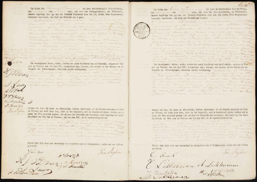 Voedgekend de doorkaling van één, in de boven stetling van tueanef waarder son v P Pveen Ponst AvJvak Jishen B: Mloorkvoren F: Arnoldo Van Eighen Op heden den Vienden Ianuar des Jaars Achttienhonderd Acht-en-Dertig, des margen ten Tien uren, zijn voor ons Ondergeteekende, als Wethouder, daartoe ingevolge Art. 95 van het Stedelijk Reglement door den Ed. Achtb. Heer Burgemeester benoemd: verschenen, ten einde een Huwelijk aan te gaan, Juliaan anson timmmermans- knecht, militien, gebaren en ondernde alhier oud zes en twintig jareen, ma denjarige zaan van Sanuel Lanson timmermans knecht, en Aaltje Jacobo mannide alhier, ter Eene, en Helena Jacoba van der Veen werkster gebaun en wonende al hier oud twintig jaren, minderjarige gekeurd de dochter van Abel van der Veen„ raling van turfdrager, in Jacobu Rijke, in de boven eig van dianmde aar den bruidegemt medenamens zyne Echtgersot, en de Regdle waardede alhier ter andere is consinteerd en beiden Iiders Jeer soneel in Sezin Echt der bruid 11 /010 De voorafgaande Acten, welke, nevens het zesde Hoofdstuk van het Huwelijk, volgens de Wet van 25 Ventose van het Jaar Elf, voorgelezen zijn, bestaan, ten eersten: in een Extract uit het Register der Afkondigingen, behoorlijk zonder verhindering alhier genhied de Een endertigsten December Elenzevenden JS Veen dezer.— 2: de gebaarte Gedulten der uusloof den.— tm 3e de hoesten ming van den Kolanel der kumide Vonst tfderling In fauterie Jvak Iep voorv ZZ word waarna wij hun, bij name en afzonderlijk, hebben afgevraagd: of zij elkander aannamen als Man. en Vrouw; het welk door hun, ieder in het bijzonder, met ja beantwoord zijnde, hebben wij in Aigtew naam der Wet uitspraak gedaan: dat zij door het Huwelijk zijn vereenigd; alles ingevolge het derde Hoofdstuk der Wet van 20 Ventose, van het Jaar Elf, en in tegenwoordigheid van en vader dis inants and acht en veertig den Vader der Achtg enoote oud vyf en veer„ Bartil Moerkerken timm erman als Vijf en veertig in Franciscus Arand Kantoorbediende oud vier en veertig sarin wannde allen alhier Zijnde deze Acte door ons vervaardigd en voorgelezen aan de Comparanten, welke met ons hebben geteekend. J Jan Sou Van ligken J Hevyst „ A J: VD Veen B: Moerkerk F: Arnoldi Lansa Awt 3 Op heden den Hteiden Sanuari des Jaars Achttienhonderd Acht-en-Dertig, des norgen ten Tin uren, zijn voor ons Ondergeteekende, als Wethouder, daartoe ingevolge Art. 95 van het Stedelijk Reglement door den Ed. Achtb. Heer Burgemeester benoemd: verschenen, ten einde een Huwelljk aan te gaan, Gerrit Duak mastenmaker, militien gebaren te Hocyn, woumde alhier, laak„