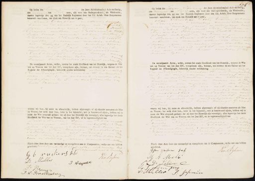 Op heden denEenden anunary des Jaars Achttienhonderd Acht-en-Dertig, des manenten Tien uren, zijn voor ons Ondergeteekende, als Wethouder, daartoe ingevolge Art. 95 van het Stedelijk Reglement door den Ed. Achtb. Heer Burgemeester benoemd: verschenen, ten einde een Huwelijk aan te gaan, Frend Geugies mattenmaker bauns en waande alhier oud twintig Varu minderjarige zoon van orend Peugies duvelsden, in Calharina de wyk zonder beroep, maninde alhier, to Eenen Susanna Christina du Breuit is aaistig geharen en manterde alhur oud twintig jarin. minder arige dochter van Paul du Benil onvelidin, en Cesina Bernardina Ruckkersfeld, zonder beroep, wan alhier, ter andere zyde En cand teerden beide moeders personeel in dezen E„ De voorafgaande Acten, welke, nevens het zesde Hoofdstuk van het Huwelijk, volgens de Wet van 25 Ventose van het Jaar Elf, voorgelezen zijn, bestaan, ten eersten: in een Extract uit het Register der Afkondigingen, behoorlijk zonder verhindering alhier isheid in en endertigsten December El enzevenden dezer, — ten 2: de gebaorte tedndin der herloofdin. — ten 3. de dood Cedullin van beide Vaders. waarna wij hun, bij name en afzonderlijk, hebben afgevraagd: of zij elkander aannamen als Man en Vrouw; het welk door hun, ieder in het bijzonder, met ja beantwoord zijnde, hebben wij in naam der Wet uitspraak gedaan: dat zij door het Huwelijk zijn vereenigd; alles ingevolge het derde Hoofdstuk der Wet van 20 Ventose, van het Jaar Elf, en in tegenwoordigheid van Diik Mudler Oom den Echtg enoot timmerman oud kwnee en vijftig Jose phus Bruijn, schilder oud twee en zwintig, Jun Mannar Harseberberg schilder, oud vijf endertig, en Tie drik wiegman, boekdrukker and vier en twintigaren, waande allen alhier Zijnde deze Acte door ons vervaardigd en voorgelezen aan de Comparanten, welke met ons hebben geteekend verklarinde de Ehtgenooten, ende moeder des Echtgenoots niet te kunnen sche G b vuikers selo Van Eegten D= Muller T Wiegman J: Bruyn J: W: Horselenberg WH Op heden den Eienden anuary des Jaars Achttienhonderd Acht-en-Dertig, des margens ten Tien uren, zijn voor ons Ondergeteekende, als Wethouder, daartoe ingevolge Art. 95 van het Stedelijk Reglement door den Ed. Achtb. Heer Burgemeester benoemd: verschenen, ten einde een Huwelijk aan te gaan. ohan Christian Seiz, bediende, geboren te Iettenbask, Wurlemberg, wonende alhier oud mingen en twintig jaren, meerderjarige zaau hun Jakob Frisdrich Seiz, overleden, in Friederika Ellinger, wier laat, te waan- plaats onbekend is, ter Eene, in Maria Anna Moht Schoonmarkste zebaren en monende alhier ud drie en dertig farin, in eerder, vrige dachter va Jo han Coenraad Moht, in Maririch van der Maal, bede overleden ter andere zyde De voorafgaande Acten, welke, nevens het zesde Hoofdstuk van het Huwelijk, volgens de Wet van 25 Ventose van het Jaar Elf, voorgelezen zijn, bestaan, ten eersten: in een Extract uit het Register der Afkondigingen, behoorlijk zonder verhindering al heengeschiedde en endertigsten December E, -en Zuimdendeze tig 2o de doopcedullen der verloof den ten 3:o de doodgedullen van den nader den brundegoms en van de ouders en de Zyn moeder van moeders zyde der bruig n verklaarden zij ons met de onder geeelde getuigen onder aanbod van Eede de anbekendheid der plaats hur over lyden of laat te woonplaats hem zijne moeder en niederzydsche Groot Ouders en van hare overige Groop Ouders. waarna wij hun, bij name en afzonderlijk, hebben afgevraagd: of zij elkander aannamen als Man en Vrouw; het welk door hun, ieder in het bijzonder, met ja beantwoord zijnde, hebben wij in naam der Wet uitspraak gedaan: dat zij door het Huwelijk zijn vereenigd; alles ingevolge het derde Hoofdstuk der Wet van 20 Ventose van het Jaar Elf, en in tegenwoordigheid van urin ketuer aud Een- leine Gerrit veentig Theodarus Zimperg, kraadbeeke oud drie endertig, Johannen Muller Te hoenmaker oud veertig, in Fredrik Hasenouwer Klurmaker aud dertig jarig. manende allen alhier Zijnde deze Acte door ons vervaardigd en voorgelezen dan de Comparanten, welke met ons hebben geteekend. JJoi Hooffvan Darf Van leghen M A Molle JD Salane. J: Sin piog J: Houller C. Gasruuro