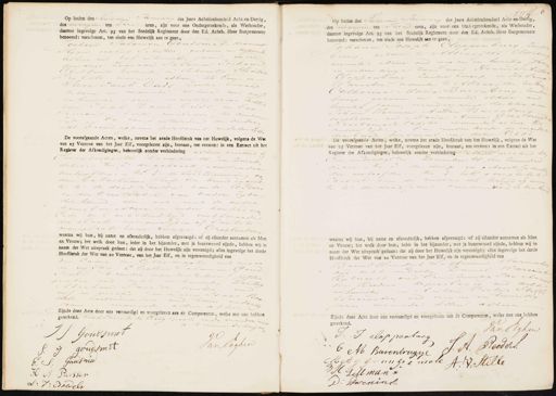 Op heden dene vendin January des Jaars Achttienhonderd Acht-en-Dertig des margun ten Tien uren, zijn voor ons Ondergeteekende, als Wethouder daartoe ingevolge Art. 95 van het Stedelijk Reglement door den Ed. Achtb. Heer Burgemeester benoemd: verschenen, ten einde een Huwelijk aan te gaan, ochem Salaimon Goudsmit, diamant Slijper, mobus Schutter, gekaren in wdund alhier oud vyf entwintig jaren in eer derjarige zoan van Salaman Ischem Goud smit bediende, en Schaantje Eliazer Prij butr, wonende alhier, ter Een, en Sara Jacob Ouds Zunder beroep bebaam in wonnde al hur and nyt en twintig Caren, in eerderj arige dacht van Jacob Dauid Ouds en Ena imons beide ouveleden, ter ander„ Zyde En cans inturden de ouders des brud ijane persaneel in dezen Erke De voorafgaande Acten, welke, nevens het zesde Hoofdstuk van het Huwelijk, volgens de We van 25 Ventose van het Jaar Elf, voorgelezen zijn, bestaan, ten eersten: in een Extract uit het Register der Afkondigingen, behoorlijk zonder verhindering alhier geschid enendertigsten December El en Zevenden dezer.— ten 2e de gebraate Jedullinder verloof den — ten 3o de toestemuing va den Cataillaus hep een bruiden om ten 4.e de doade dullen san de ouders en den Praotvader van vaders zyde der bound die ons met de onder Pemel de getuig en nder aanbad van Eede de Vanbekendheid verklaarde der plaats van oeurlyden of laatste moonplaats harer vuirige Prootander waarna wij hun, bij name en afzonderlijk, hebben afgevraagd: of zij elkander aannamen als Man en Vrouw; het welk door hun, ieder in het bijzonder, met ja beantwoord zijnde, hebben wij in naam der Wet uitspraak gedaan: dat zij door het Huwelijk zijn vereenigd; alles ingevolge het derde Hoofdstuk der Wet van ao Ventose, van het Jaar Elf, en in tegenwoordigheid van den Vader des Eehtg envets oud nigen en vijftig Cliazig Salaman Goud Snit broeder van denzelven petten muker oud acht en twintig, Hartag Abraham Tarsser, ventig oud vijf en veertig n Lunne Isaac Ben dels Loedenna ien and twee ondertig vergtanende allen al heer Zijnde deze Acte door ons vervaardigd en voorgelezen aan de Comparanten, welke met ons hebben geteekend. verklarende de Echtgenoote in de moeder nu kunnen schrijven Goud smit Van lighen 7 goudsmit .S. Gansma H A Parssen J: J: Boedels f Op heden den Tienden January des Jaars Achttienhonderd Acht-en-Dertig des margen ten Tien uren, zijn voor ons Ondergeteekende, als Wethouder, daartoe ingevolge Art. 95 van het Stedelijk Reglement door den Ed. Achtb. Heer Burgemeester benoemd: verschenen, ten einde een Huwelijk aan te gaan, Johann Joseph Cloppenburg, zonder Artengithe, Oldenbug beroep, gebarn nanuide alhier oud wey en en twintig Jar in eerderjarige haam van Henrich Aut Cloppenburg, zonder beroep, en Heling Warneken, wannede te Allensij the, ter Eene Catharina Maria Barenbrug, zunder beroep, gebaren en mannde sthur aud twintig jarin, minderjarige dochter van Johan Herman Anton Baren Cru overleden, in Maria AAnma Veerttrin Frankenole tapster wannde alhier, ten andere zyde. En ansentierde de meeder dere bruid hensoneel in dezen Eehon De voorafgaande Acten, welke, nevens het zesde Hoofdstuk van het Huwelijk, volgens de Wet van 25 Ventose van het Jaar Elf, voorgelezen zijn, bestaan, ten eersten: in een Extract uit het Register der Afkondigingen, behoorlijk zonder verhindering alhier geschied de Een endertigsten Deeember H en Zenndend dezer. — ten 2: de doop in geboorte Ce dul dir verloofden. - ten 3: het geregtelyk Consent van de auders der terinder m te 4% de doodsedul bunden dad er der by„ waarna wij hun, bij name en afzonderlijk, hebben afgevraagd: of zij elkander aannamen als Mar en Vrouw; het welk door hun, ieder in het bijzonder, met ja beantwoord zijnde, hebben wij in naam der Wet uitspraak gedaan: dat zij door het Huwelijk zijn vereenigd; alles ingevolge het derde Hoofdstuk der Wet van 20 Ventose van het Jaar Elf, en in tegenwoordigheid van inarm. Klarmaker Barend Hendrik oud achten dertig, Daniel Waringh Ryknecht oud tenen twintig, Jan Ar dus Reeders, kaperslag en and acht en twintig in Auton Vietag Stilh Kleerwaker oud vy en en twintig Sarin. manende allen acher Zijnde deze Acte door ons vervaardigd en voorgelezen aan de Comparanten, welke met ons hebben geteekend. Van Eeghan T.I. clopperburg C M Burenbrugye J. A. Reevers. MM Ag Lvange e mole A: V: Stille JH Gelman n D: Waenink