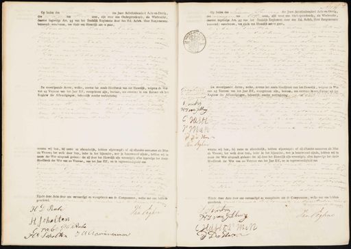 Op heden den Tienden Jaunury des Jaars Achttienhonderd Acht-en-Dertig des margenten Tien uren, zijn voor ons Ondergeteekende, als Wethouder, daartoe ingevolge Art. 95 van het Stedelijk Reglement door den Ed. Achtb. Heer Burgemeester benoemd: verschenen, ten einde een Huwelijk aan te gaan, Hendricus David Rabe Kuiper gebaren en wonende alhur oud twee en twwintig jaren, meerderj arige haar van Christiaan Rabe winkelier, voor alhier in Susanua Wichelmina Mor, ouvledun, ter Eene, en Janna Scholten, vischuirkaspol gehann en manund alhier and tuin en twintig jaren, eneerders vrige dachtig van Machiel Hendrik Schap overbedin, en Hanna de Vos, za beroep mannde al hur ar andere zyl En cansentierden de Nader den krinde in de moedig der bruid kersonal in dezent De voorafgaande Acten, welke, nevens het zesde Hoofdstuk van het Huwelijk, volgens de Wet van 25 Ventose van het Jaar Elf, voorgelezen zijn, bestaan, ten eersten: in een Extract uit het Register der Afkondigingen, behoorlijk zonder verhindering rland senehuid vier en twintigsten en Eenendertigsten De cember El.- ten 2. de gebaarte se delte der verloofden.— ten 3= de daad Cechille van de moeder du brundegams in den Vader der bruid. waarna wij hun, bij name en afzonderlijk, hebben afgevraagd: of zij elkander aannamen als Mar en Vrouw; het welk door hun, ieder in het bijzonder, met ja beantwoord zijnde, hebben wij in naam der Wet uitspraak gedaan: dat zij door het Huwelijk zijn vereenigd; alles ingevolge het derde Hoofdstuk der Wet van 20 Ventose, van het Jaar Elf, en in tegenwoordigheid van den vader des enoofs and ach vertig Gijsbert Christiaan Rabe broeder van den Zeluue metselaar, u Zeven en twintig Hendrik Schalten broeder den Eehtg envote, ueschhaar krrecht oud zuven vteintig, en Ien Dirk Dammerman, jauwer, aud vier eenzeventig aren.wonde allen aen Zijnde deze Acte door ons vervaardigd en voorgelezen aan de Comparanten, welke met ons hebben geteekend. verklarinde de moeder niet te kunne schry W0 H D Rabe vaklighen H Scholten G. C. Rabe C Vabs H=r Scholten J Allammerman Goedgekeurd de bovenstelling van tien waart S Junstrg HD van Gilburg C HSol 1 a7 W D 4 Han Van Eighen AWH Op heden den Tienden Innuary des Jaars Achttienhonderd Acht-en-Dertig, des margen ten Elf uren, zijn voor ons Ondergeteekende, als Wethouder daartoe ingevolge Art. 95 van het Stedelijk Reglement door den Ed. Achtb. Heer Burgemeester benoemd: verschenen, ten einde een Huwelijk aan te gaan, Vijbe Poustra schilder, militeen gebaren te Aalzum, arrandis somens Sneek, en aldaar laatst gemaand hebbende thans woumde alhier oud vier en twintig jarin, in eerderj arige zo an han Gerke Iitses Joustra, zunder beroep wonende te Aal zuin, in Hiske Lam meits sol overleden, ter Eene, en Maria veen Tilburg naaister, ge baren en manende al hur oud drie en tuin tig farin, weduwe van Willem Stari„ meerderjarige dochter van Frans var Tilburg, werkman, in Catharina Stoe wanende alhier, ter andere zyde.- E sieleerden de Ouders der bruid personeel in dezn De voorafgaande Acten, welke, nevens het zesde Hoofdstuk van het Huwelijk, volgens de Wet ur van 25 Ventose van het jaar Elf, voorgelezen zijn, bestaan, ten eersten: in een Extract u 5 Ja E Zum to Register der Afkondigingen, behoorlijk zonder verhinderingt vertgeschied de tiend 2 d vaor tienden in zeventienden December El Ao de gebaor te Gedurdl in der verloof din ih 3 de dood Cedul van de maeder des Jubu ruidigons tn 4e het notarieel consen zyn vader.- ten de de toestemmming den kolont der Achttsence afduelen Intanterie.- ten 6e de daad Codel van en uarigen E. Egenoot, der bruid VaW G Haar ghi waarna wij hun, bij name en afzonderlijk, hebben afgevraagd: of zij elkander aannamen als Man en Vrouw; het welk door hun, ieder in het bijzonder, met ja beantwoord zijnde, hebben wij in naam der Wet uitspraak gedaan: dat zij door het Huwelijk zijn vereenigd; alles ingevolge het derde Hoofdstuk der Wet van 20 Ventose van het Jaar Elf, en in tegenwoordigheid van genoote aud negen in vader der Zestig, Hermarn Daminiuw van Ti burg, trasder derzelu Jauver à acht en dertig, Cobus Vasterman, Jaumer aud vyf en vyftig en Willen de Hor, metselaar oud acht en veeri Jarin wannde allen alhui Zijnde deze Acte door ons vervaardigd en voorgelezen aan de Comparanten, welke met ons hebben geteekend, verklarmde de Echtgenoote en hare Oeiders niet te inneschrye J Louwtn Van leghui HD van Gelburg Hdblez no10 De Her