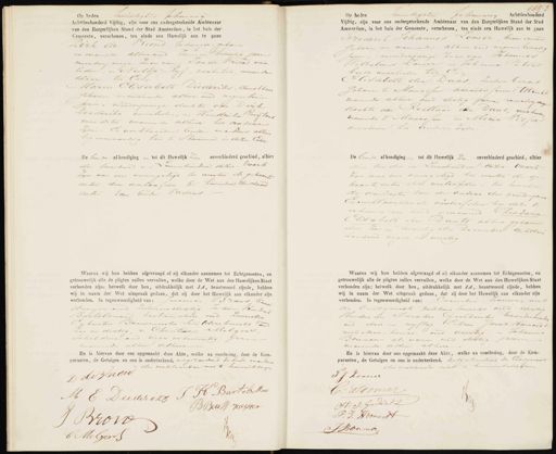 Op heden twintigste Jebunanij Achttienhonderd Vijftig, zijn voor ons ondergeteekende Ambtenaar van den Burgerlijken Stand der Stad Amsterdam, in het huis der Gemeente, verschenen, ten einde een Huwelijk aan te gaan Vriend, behangen, gebaren Dirk de 18 en wanmde alhier aud Zeven en twiintig jaren Jan de Vriend auv merderjarige zaan i leden, in Neeltje Ryf, werksten, wannde alhier ten Een„ Maria Elisabeth Diederiks, dunstbaar gebaren inwoumde alhier aud negentien Jarm, minderjariige doch ter van Dirk Diederiks overleden, m Hendrika Ruijters men tistes vonnde alhier ten anderee Zyde. En venklaarden beide mardius alhier tig enwoondig hoe te Stemman in dezen Echt De leende afkondiging en tot dit Huwelijk zn onverhinderd geschied, alhier. An bnder e eventienden dezer. Voorts zyn aan ons veeriegelegd ten wersten de gebaarten — dcton den vverloafden. to huunden de daad van beide Vaders. cecti. IVaarna wij hun hebben afgevraagd of zij elkander aannemen tot Echtgenooten, en getrouwelijk alle de pligten zullen vervullen, welke door de Wet aan den Huwelijken Staat verbonden zijn: hetwelk door hen, uitdrukkelijk met JA, beantwoord zijnde, hebben wij in naam der Wet uitspraak gedaan, dat zij door het Huwelijk aan elkander zijn verbonden. in tegenwoordigheid van: Jeramias WFrans, kun dringer aud zuunnidertig Je aan Huuder E Baukelsmand kastinmakiu and zeventig Eybustus Bouwmeerter Schilders kritt aud Zes en dertig, en Chuntiarn Melgers, schildur oud vier entwintig Jaren bamede allen alhier En is hiervan door ons opgemaakt deze Akte, welke na voorlezing, door de Kom- paranten, de Getuigen en ons is onderteekend, antgezondend de beide moedes die verklarnden met te kennen schryven Ddivnend H Bartels Man 9 M E Diederik 4 Op heden Twintigsten dewrnarig Achttienhonderd Vijftig, zijn voor ons ondergeteekende Ambtenaar van den Burgerlijken Stand der Stad Amsterdam, in het huis der Gemeente, verschenen, ten einde een Huwelijk aan te gaan Frederik Johannes Comer, timmerman Gebaren en waneende alhier aud megenen twintig Jarm, murderjarige zaar van Johannes Wilhelmus Lamer in Johmima Peters beide denrliden ten Elisabeth den Daas zanden beroep Gebaum te Maarssen aarandis summt Utricht wanmde alhier and dertig jarem, meerderjarsje dochter van Roelland den Daas, werking woumde te Maarssen en Maria Vo EJee oveeleden zys anderee zyde De bende afkondiging en tot dit Huwelijk 2n onverhinderd geschied, alhier. den tienden en Leventienden dezer, vaarts zyn aan den deeegelegd ten eersten de ge baarte acten der verloofden. ten huerdin de doedacte van de ouders der bruidegam Ge vesklaarden de rientoofden by deze te er kunn een kind genaamd Theodara Elisaberh den Daats alhier gekauwd drie zes en twintigsten December achttien hondend negen en veertig Waarna wij hun hebben afgevraagd of zij elkander aannemen tot Echtgenooten, en getrouwelijk alle de pligten zullen vervullen, welke door de Wet aan den Huwelijken Staat verbonden zijn: helwelk door hen, uitdrukkelijk met JA, beantwoord zijnde, hebben wij in naam der Wet uitspraak gedaan, dat zij door het Huwelijk aan elkander zijn verbonden. In tegenwoordigheid van: temlii namen, met den Echtqueact pakhuis tercht oud dertig Huurdrii een Jarakus Geerdink Vaardschuuder oud drie en vyftig Pitrn Jacob Homoedt metsslaars krcht end veertig, en Johannes Bouman als varm oud dertig jaren bieoumede allen alhur En is hiervan door ons opgemaakt deze Akte, welke na voorlezing, door de Kom- paranten, de Getuigen en ons is onderteekend. uito Hondead de Cchtquraat die rensklaande niet is kunnenschegun 9„