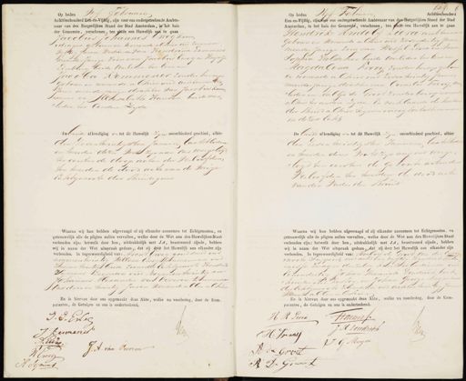 Februari Op heden Achttienhonderd Ech-en-Vijftig, zijn voor ons ondergeteekende Ambte- naar van den Burgerlijken Stand der Stad Amsterdam, in het huis der Gemeente, verschenen, ten eindde een Huwelijk aan te gaan Jacobus Johannes Wegkoom„ „drager geboren en wonende alhier oud zevenen Vyftig Jaren Weduwem van Hendrina Zemmers meerder Jarige zoon van Jacobus Eweg en Heijntje Limburg beide Overleden ter Eene en Jacoba Kemmener zonder beroep Geboren en wonende alhier oud achtenveertig Jaren meerderjarige dochter van Jacobus Kem„ Timener en Eliesabeth Hansen beide over„ „leden ten Andere zyde Deleerde afkondiging en tot dit Huwelijk zin onverhinderd geschied, alhier. den Zesentwintigsten January laatstleden en tweeden dezer Voor zyn aan ons overgelegd ten eersten de doop acten der Verloofden ten tweeden de dood acte van de Iorige Echtgenoote des Bruidegoms Waarna wij hun hebben afgevraagd of zij elkander aannemen tot Echtgenooten, en getrouwelijk alle de pligten zullen vervullen, welke door de Wet aan den Huwelijken Staat verbonden zijn: hetwelk door hen, uitdrukkelijk met JA, beantwoord zijnde, hebben wij in naam der Wet uitspraak gedaan, dat zij door het Huwelijk aan elkander zijn verbonden. In tegenwoordigheid van: Srent tweg goud smit oud negenentwintig Willem Eweg stimmerman oud zevenen twintig beide zoons des Echtgenoot Hendrik Tijmens zeeman oud Negenentwintig en Johannes Alexander van Oeveren timmerman Oud drie en twintig Jaren wonende allen alhier En is hiervan door ons opgemaakt deze Akte, welke na voorlezing, door de Kom- paranten, de Getuigen en ons is onderteekend. 9 P. S. Erfel „ Kennenes HGg A: Erog. JB J. A. van Veveren H Cweg H Symens wij in naam der Wet uitepraak gedaan, dat zij deor het Huwelijk aan elkander zijn Verbonden. in tegenwoordigheid van: Hoelof de Groot am der Echt „noote Suppoort der acht den viftig Hendrik Insu„ „nisse zwager derzelve kantoor bediende oud Eenendertig Johan Heinnck doudrick, boek, „houder oud zestig, en Johan George Meyerheer 29 des Echtgenoots zilversmid oud achten twintig Jaren Wonende allen al hu Ean is hiervan door ons opgemaakt deze Akte, welke na voorlezing, door de Kom- baranten, de Getuigen en on is onderteekend. H. R Liera Hauniss. 17 J H Zoudrich e H Praaij J. G Meyer