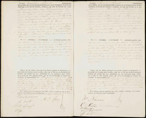 Op heden veertien April Achttienhonderd Drie-en-Vijftig, zijn voor ons ondergeteekende Ambtenaar van den Burgerlijken Stand der Stad Amsterdam, in het huis der Gemeente, verschenen, ten einde een Huwelijk aan te gaan ambertus van Doesum zon„ der beroep, geboren te Leeuwarden, wo„ nende alshier, oud vijf en twintig jaren meerderjarige zoon van Hendrik van Doesum en Hendrina Francisca Arnold teide overleden ten Eenre Margaretha Smit zonder beroep ge borenen wonende alhier, oud drie en vijftig jaren, weduwe van Pierre Rosielle meerderjarige dochter van Barend Smit en Maria Banlenie beide over leden ten andere zyde De beide afkondiging e tot dit Huwelijk zijn onverhinderd geschied, alhier. den derdene tienden dezen. voorts zyn aan ons overgelegd te eerste de getoorte en doopacten de verloofding, te tweeden de dood acten van de ouders des Bruide„ goms, ten derden de doodacte van den Echtgenoot den Bruid- vorigen Waarna wij hun hebben afgevraagd of zij elkander aannemen tot Echtgenooten, en getrouwelijk alle de pligten zullen vervullen, welke door de Wet aan den Huwelijken Staat verbonden zijn: hetwelk door hen, uitdrukkelijk met JA, beantwoord zijnde, hebben wij in naam der Wet uitspraak gedaan, dat zij door het Huwelijk aan elkander zijn Verbonden. in tegenwoordigheid van: Theodorus Marclus Gijd„ wijl behuwd zoon den Echtgenoote serge aaf by dy Infanterie oud een en dertig Johannes Websten suikerbakken gehuwd oud twee en twintig jaren mede behaudzoo derzelve David Top werkman oud negen en twintig en Alixander Johannes Consen tawellien oud vier en twintig jaren wonende alles alhier En is hiervan door ons opgemaakt deze Akte, welke na voorlezing, door de Kom- paranten, de Getuigen en ons is onderteekend. zelgezonderd de tweedege weze die verklaarde niet te kannen schrijven a van Doezant D Inse A. S M Smit P: M: Gijrijs Elg do 7 Pop Op heden Twintig April Achttienhonderd Drie-en-Vijftig, zijn voor ons ondergeteekende Ambtenaar van den Burgerlijken Stand der Stad Amsterdam, in het huis der Gemeente, verschenen, ten einde een Huwelijk aan te gaan Hermanus Hendrik Numan tin„ merman geboren en wonende alhier, oud zeven en twintig jaren, meerderjarige zoon van Hendrik Neman en Krestina Mol beide overleden ten Eenre Cornelia Mulder zonder beroep ge„ boren en wonende alhier, oud achten twin„ tig jaren, meerderjarige dochter van Bartel Mulder en Johanne Maria stil beide overleden ter andere zijde De beide afkondiging en tot dit Huwelijk zii onverhinderd geschied, alhier de kenden en zeventienden dezen. Voorts zijn aan ons overgeligd te eersten de gebootte„ acten den verloofden te tweeden de doodach kunnen ouders. en verklaarde ous de Bruidegom met de na te melden getuigen onder Eede de idemtileit zynen moeder weg ens noomverschil in de overgelyde stukken Waarna wij hun hebben afgevraagd of zij elkander aannemen tot Echtgenooten, en getrouwelijk alle de pligten zullen vervullen, welke door de Wet aan den Huwelijken Staat verbonden zijn: hetwelk door hen, uitdrukkelijk met JA, beantwoord zijnde, hebben wij in naam der Wet uitspraak gedaan, dat zij deor het Huwelijk aan elkander zijn verbonden. In tegenwoordigheid van: Dourens Hansen be